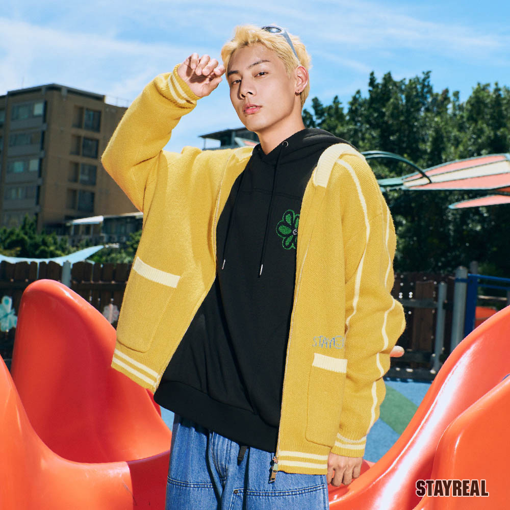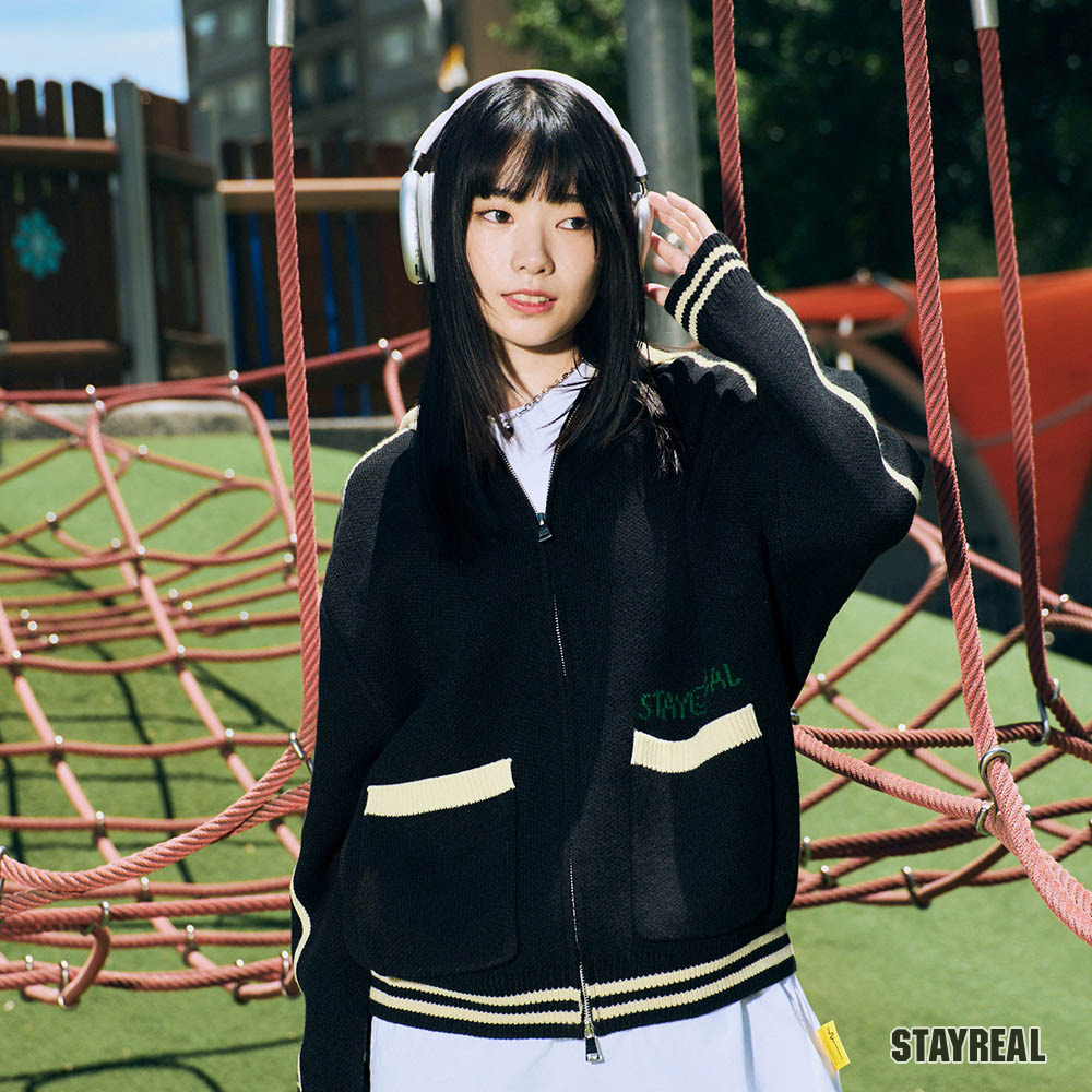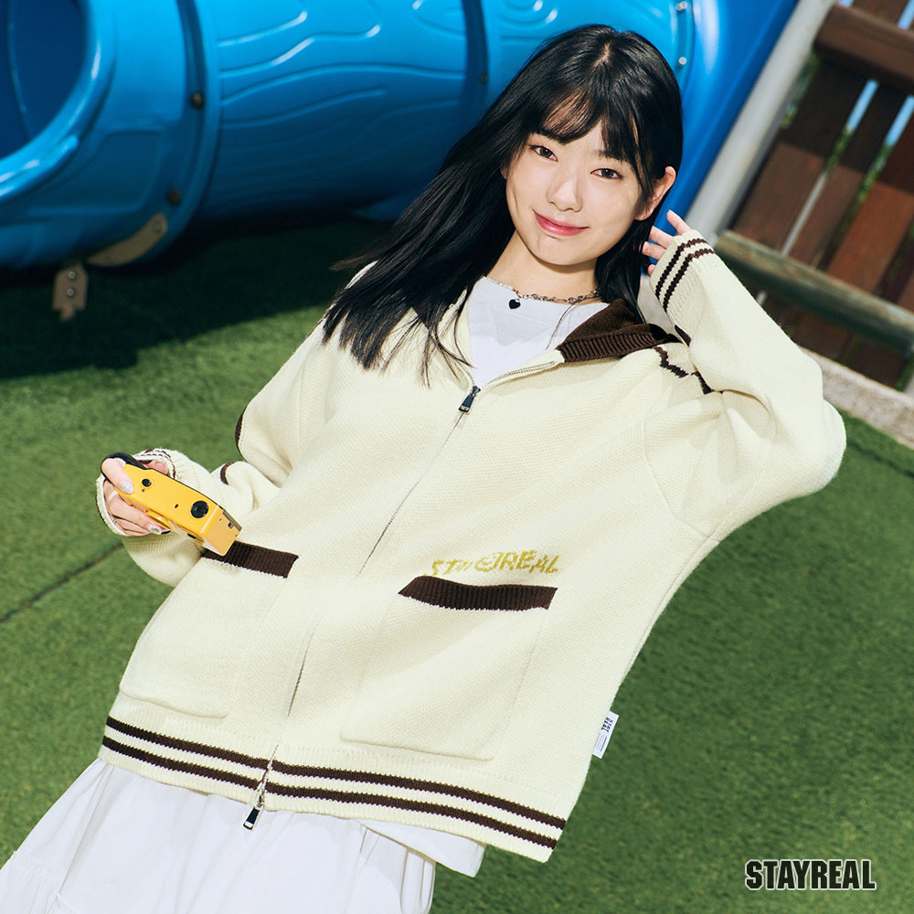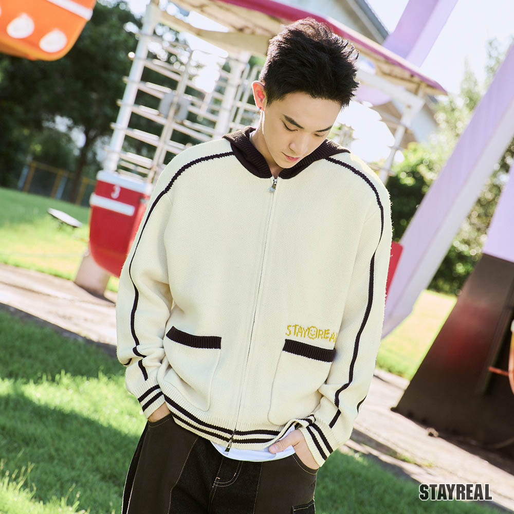 肩膀&手臂撞色線條設計,袖口&下擺配色條紋造型設計