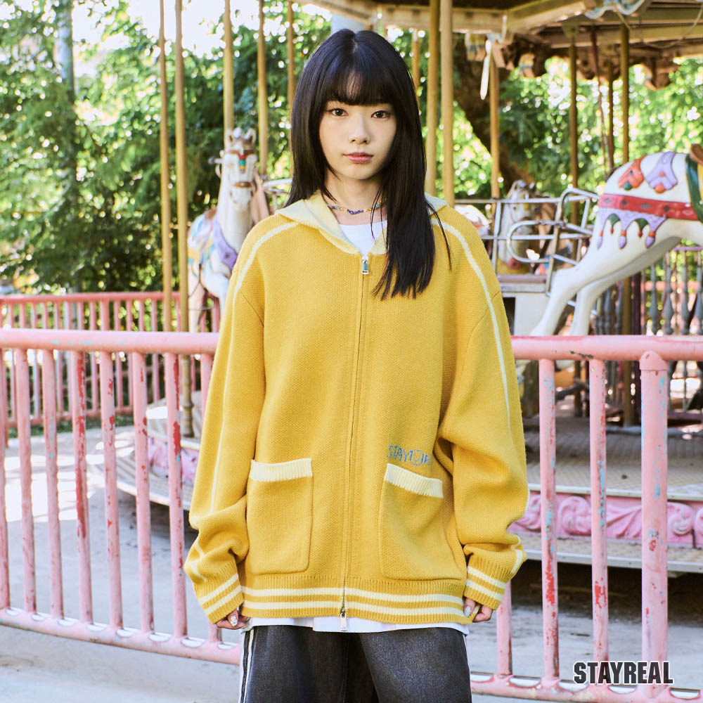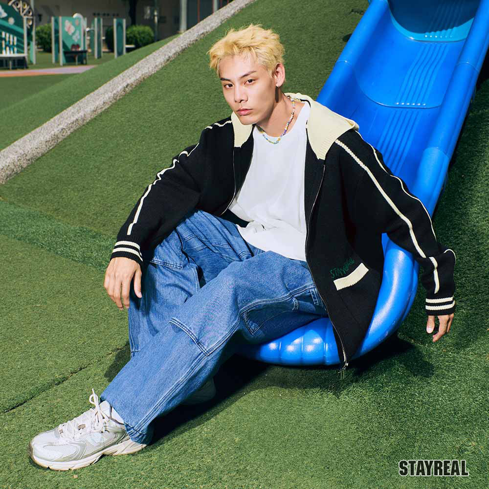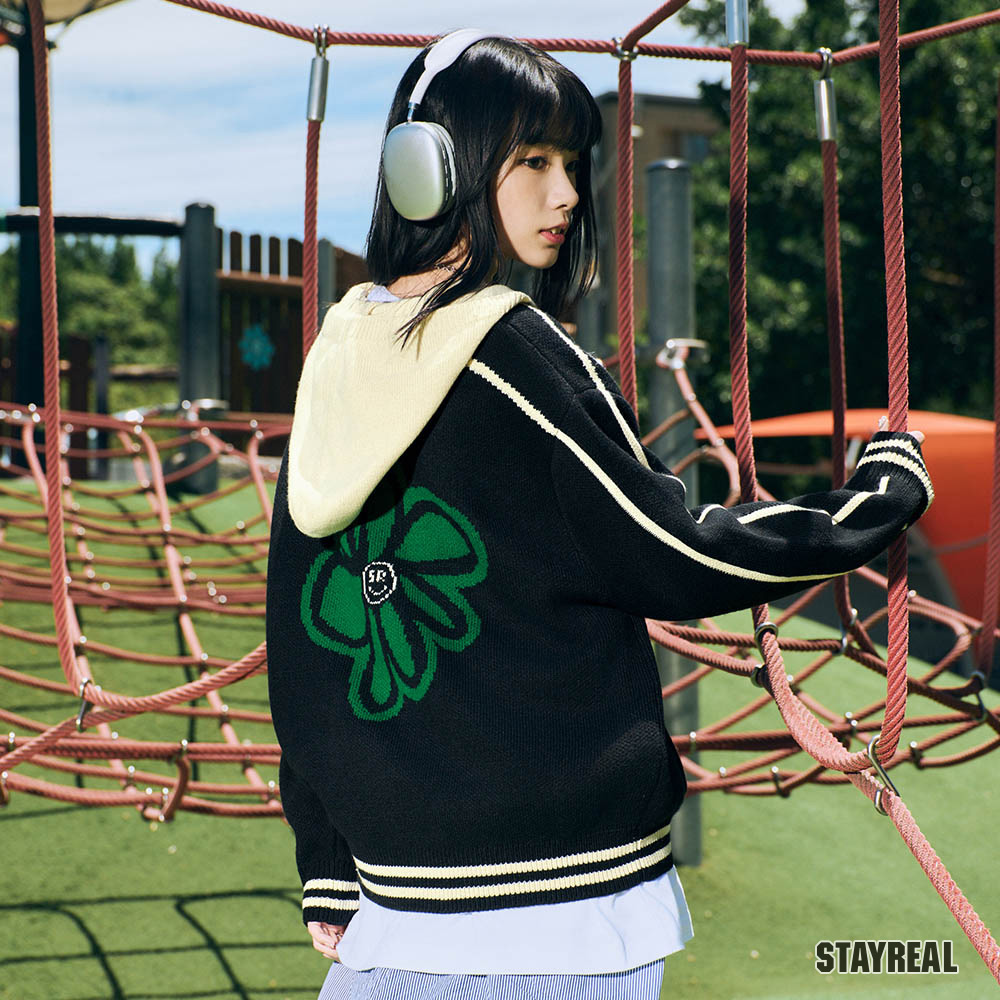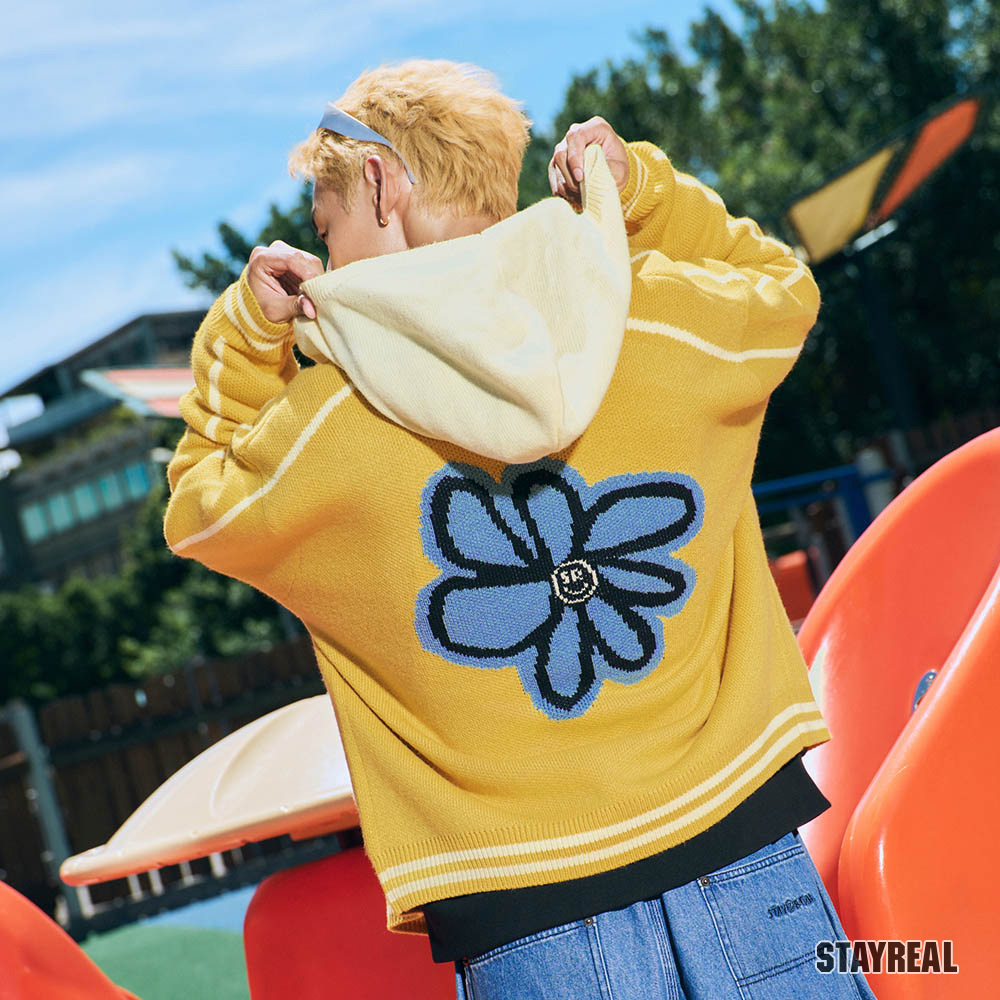 肩膀&手臂撞色線條設計,袖口&下擺配色條紋造型設計