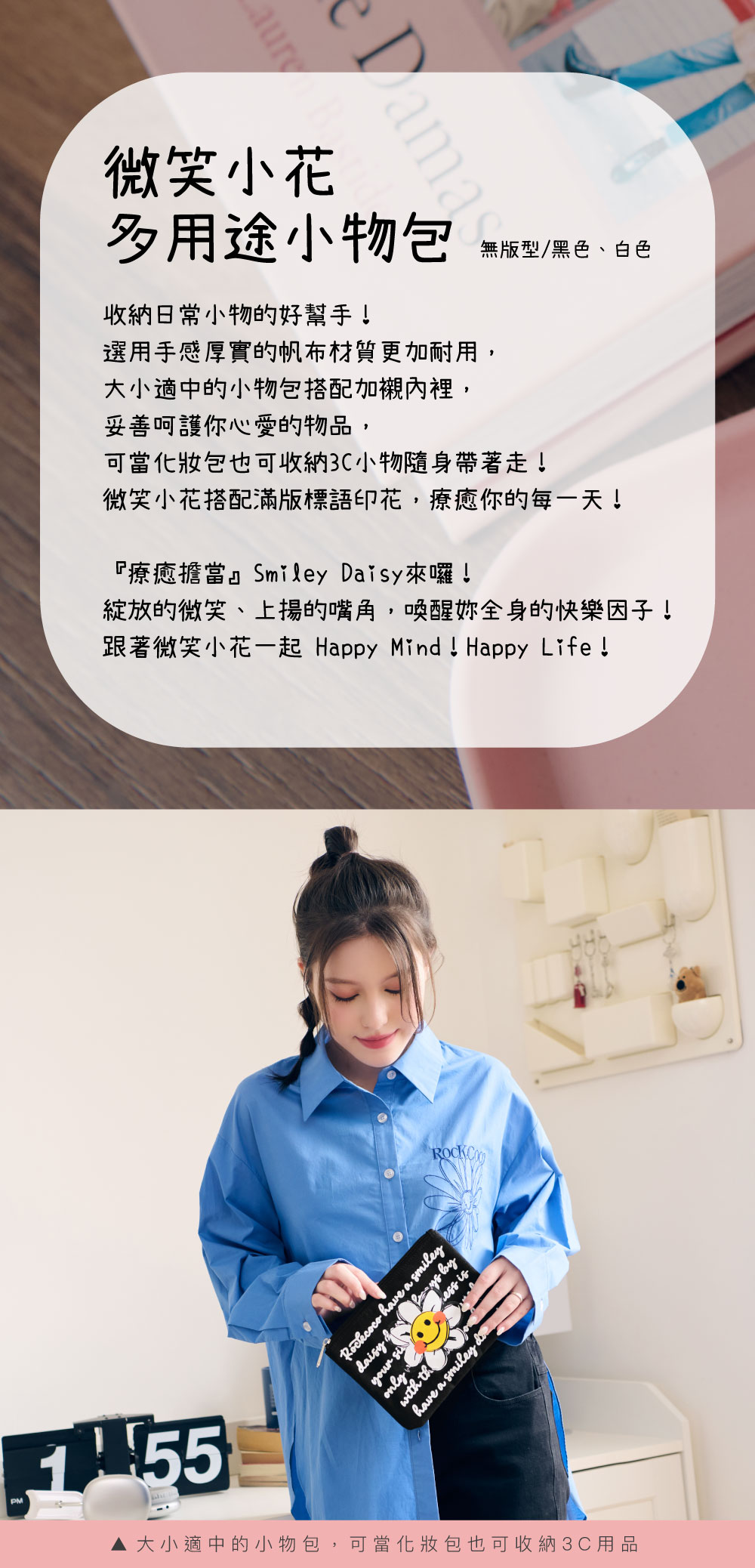選用手感厚實的帆布材質更加耐用,大小適中的小物包搭配加襯內裡,妥善呵護你心愛的物品,可當化妝包也可收納3C小物隨身帶著走