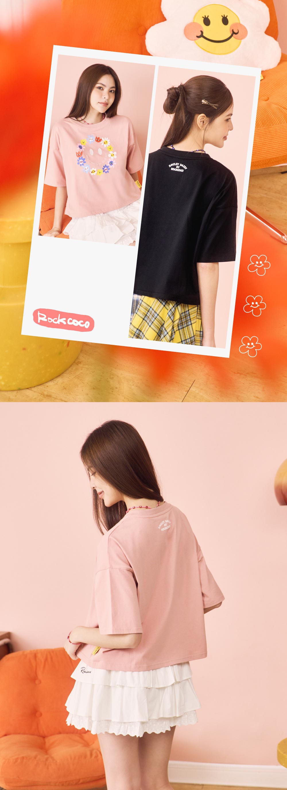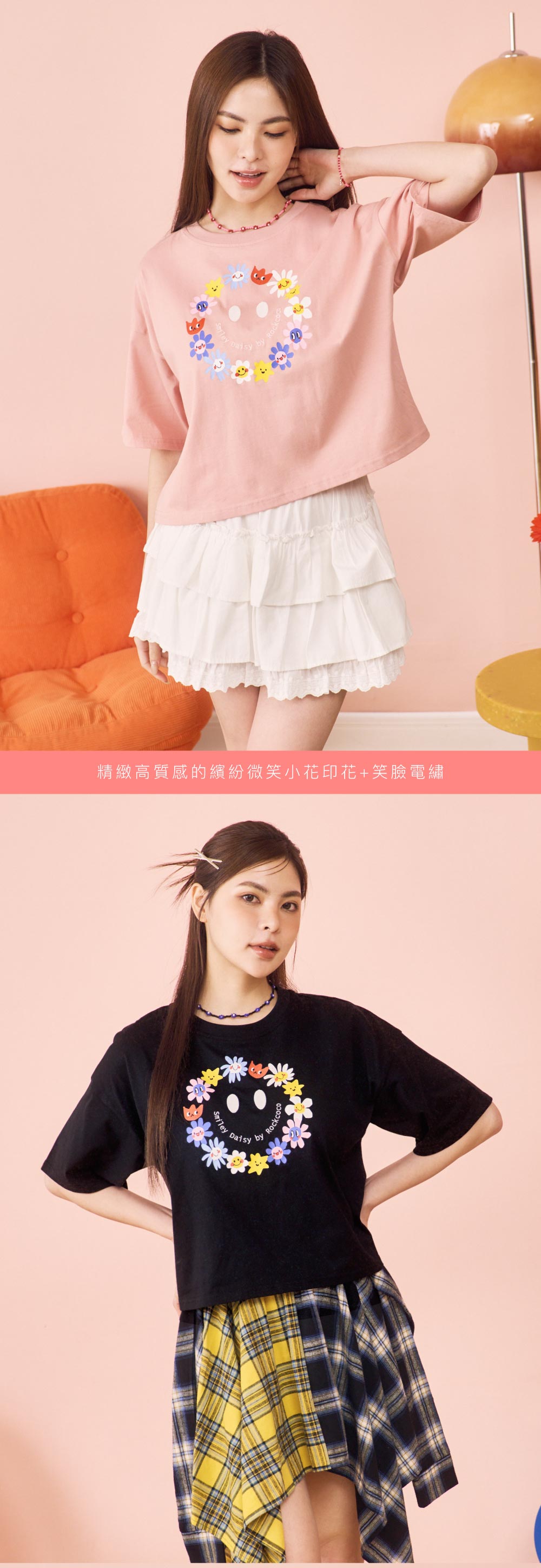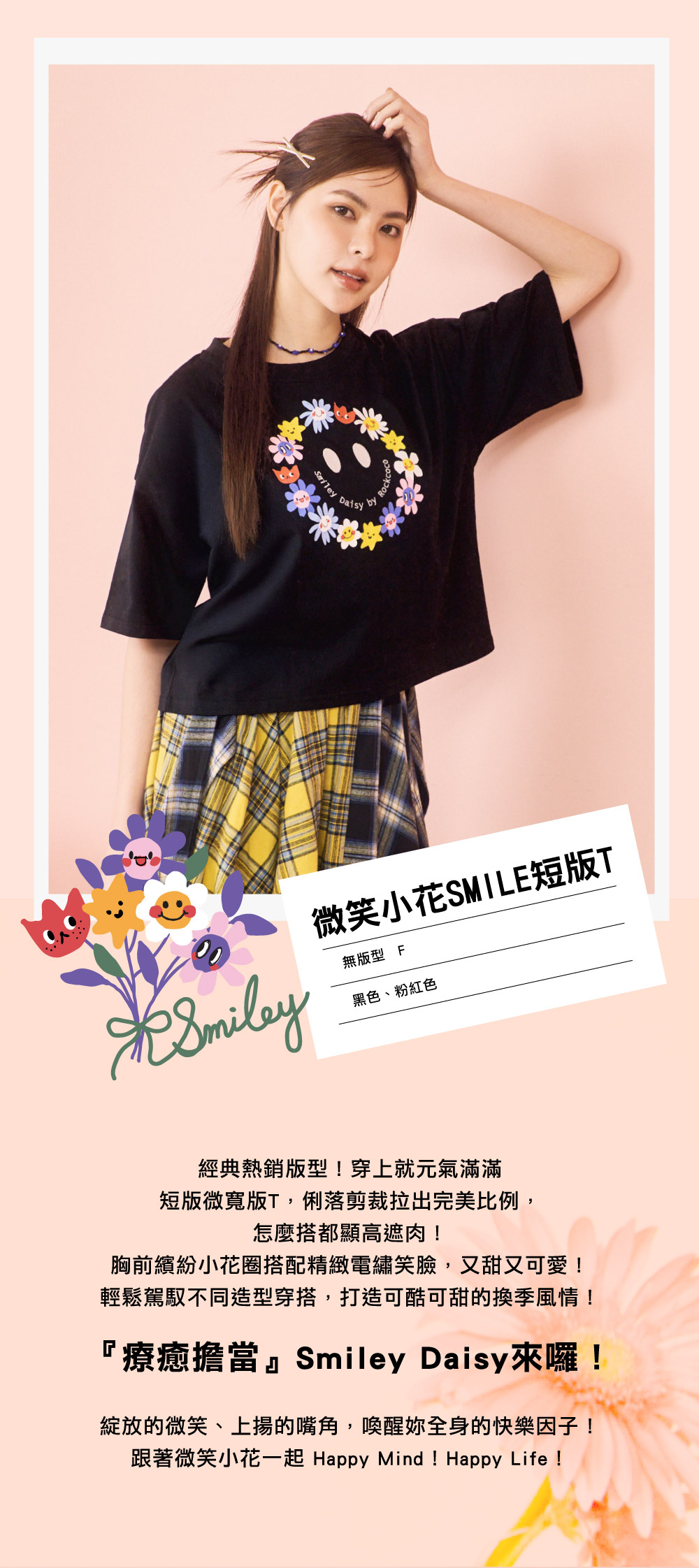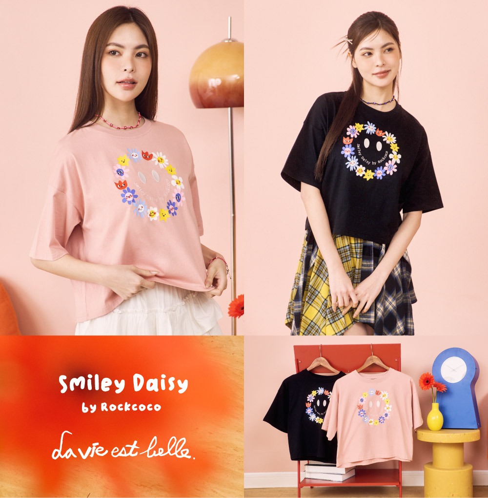 短版微寬版T,俐落剪裁拉出完美比例,怎麼搭都顯高遮肉!胸前繽紛小花圈搭配精緻電繡笑臉,又甜又可愛!輕鬆駕馭不同造型穿搭,打造可酷可甜的換季風情