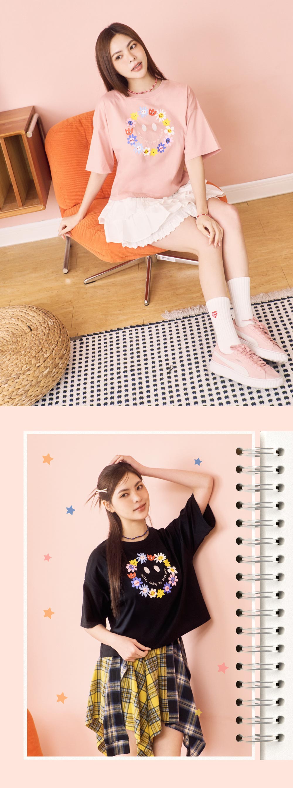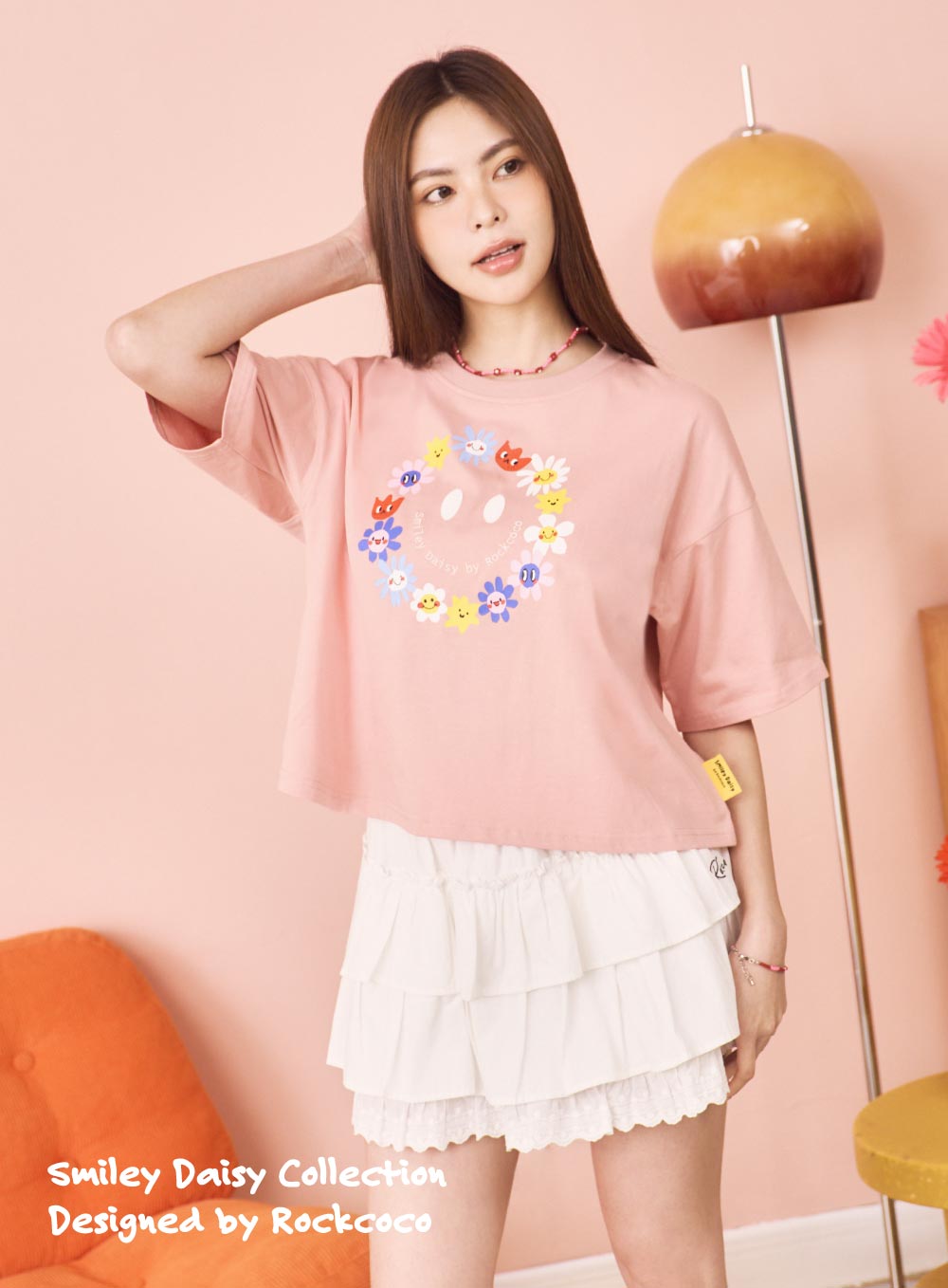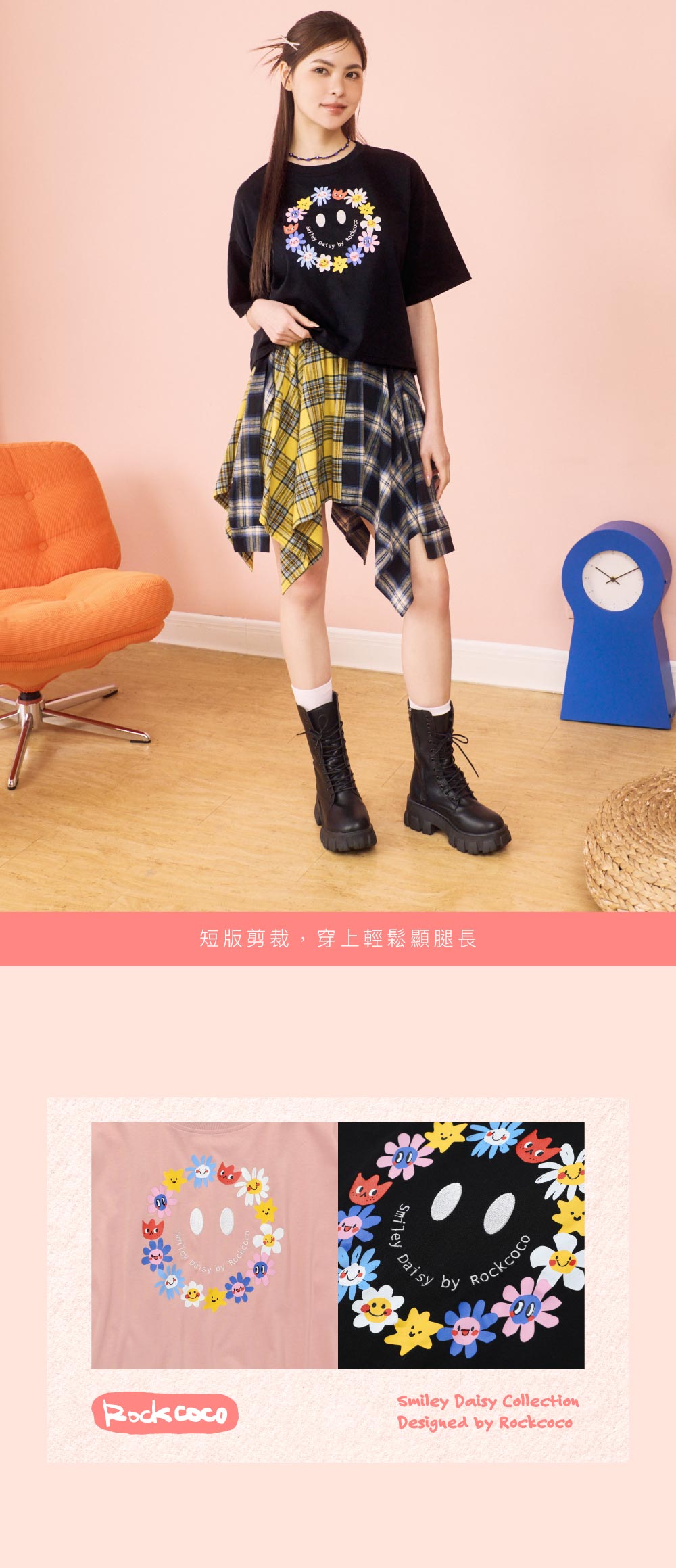 短版微寬版T,俐落剪裁拉出完美比例,怎麼搭都顯高遮肉!胸前繽紛小花圈搭配精緻電繡笑臉,又甜又可愛!輕鬆駕馭不同造型穿搭,打造可酷可甜的換季風情