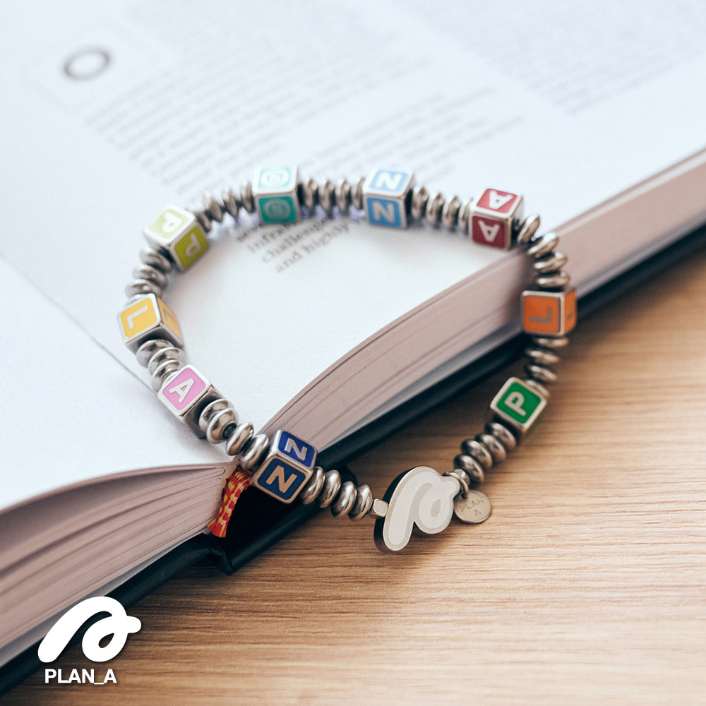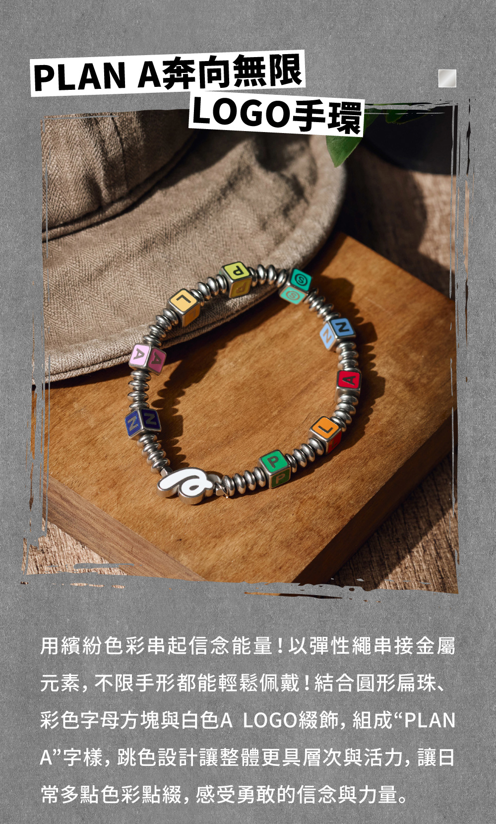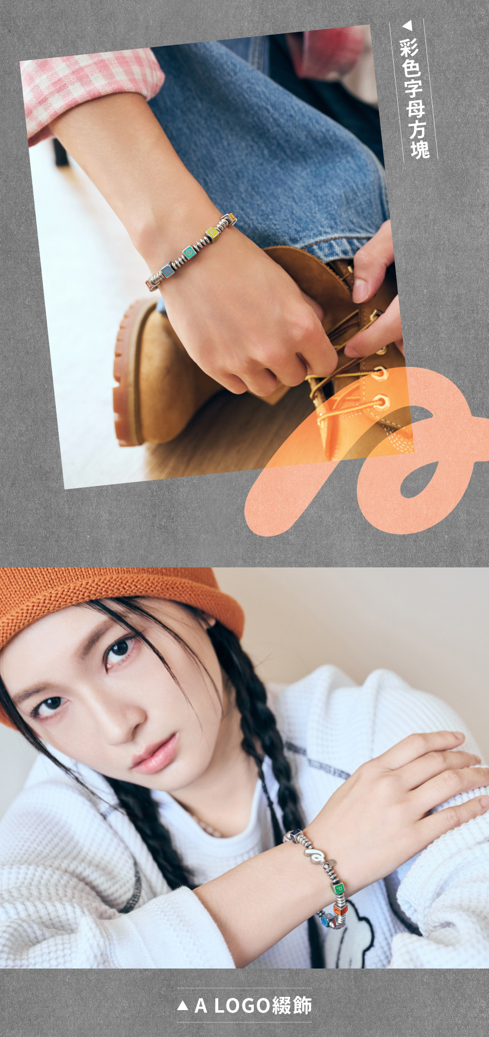 彩色字母塊塊搭配圓型扁珠及LOGO "A"的金屬綴飾,繽紛跳色