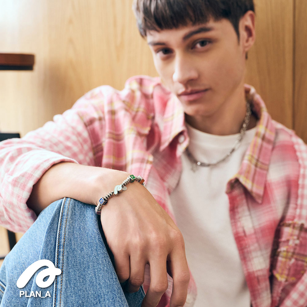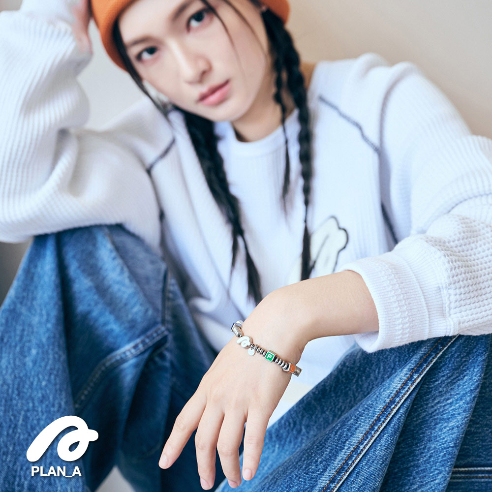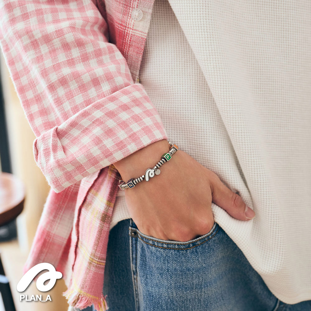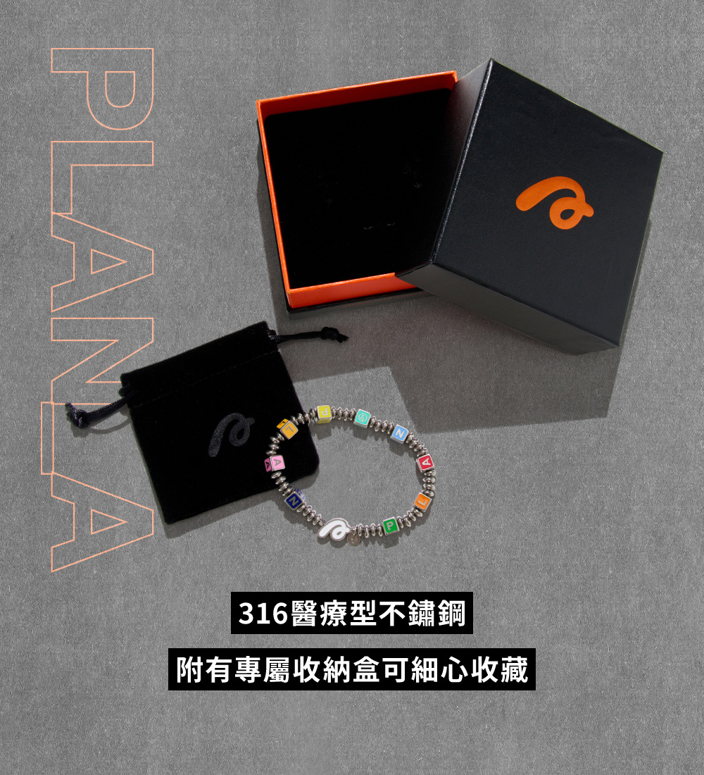 彩色字母塊塊搭配圓型扁珠及LOGO "A"的金屬綴飾,繽紛跳色