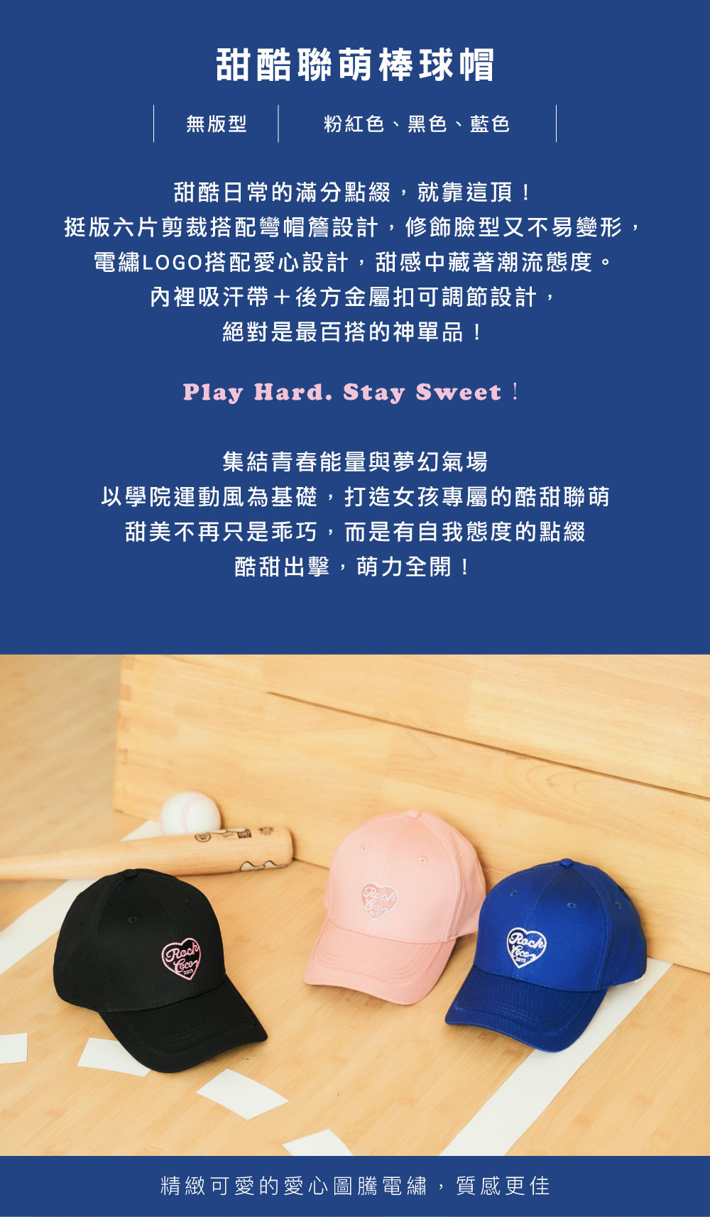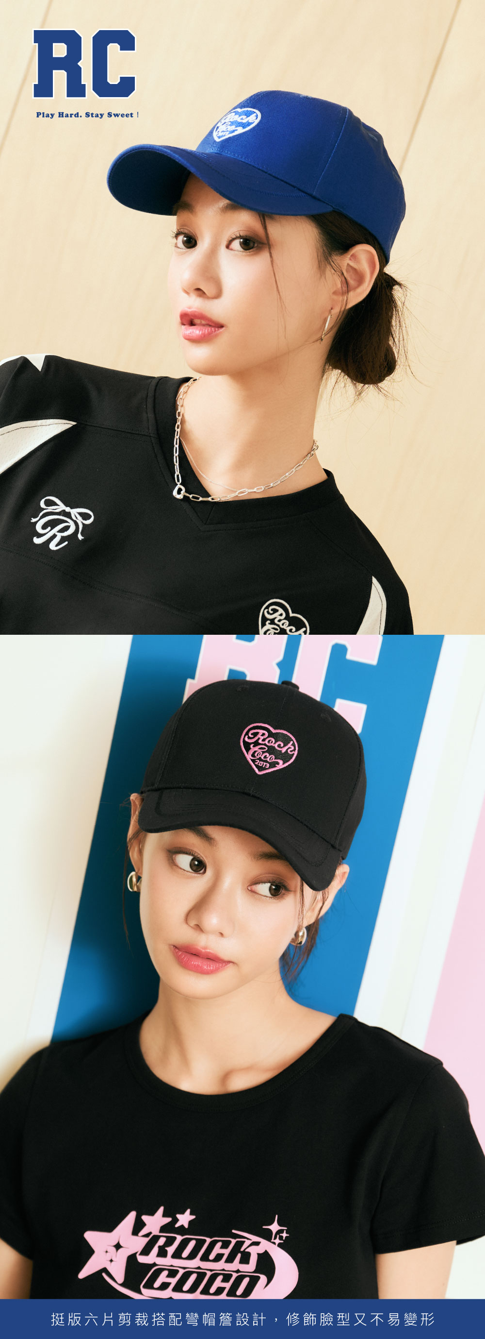 挺版六片剪裁搭配彎帽簷設計,修飾臉型又不易變形,電繡LOGO搭配愛心設計,甜感中藏著潮流態度。內裡吸汗帶+後方金屬扣可調節設計,絕對是最百搭的神單品!
