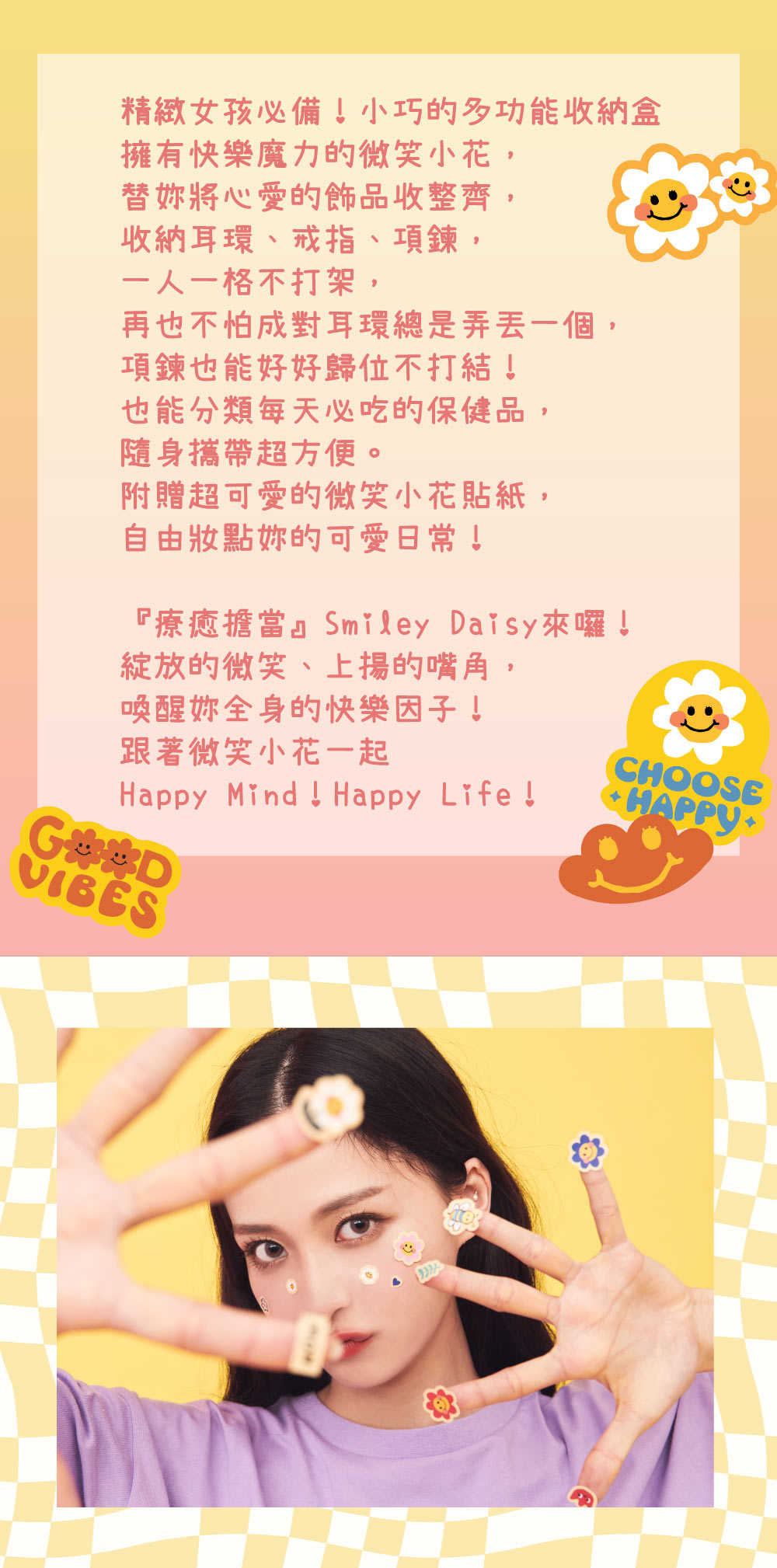 擁有快樂魔力的微笑小花,替妳將心愛的飾品收整齊,收納耳環、戒指、項鍊,一人一格不打架,再也不怕成對耳環總是弄丟一個,項鍊也能好好歸位不打結,也能分類每天必吃的保健品,隨身攜帶超方便