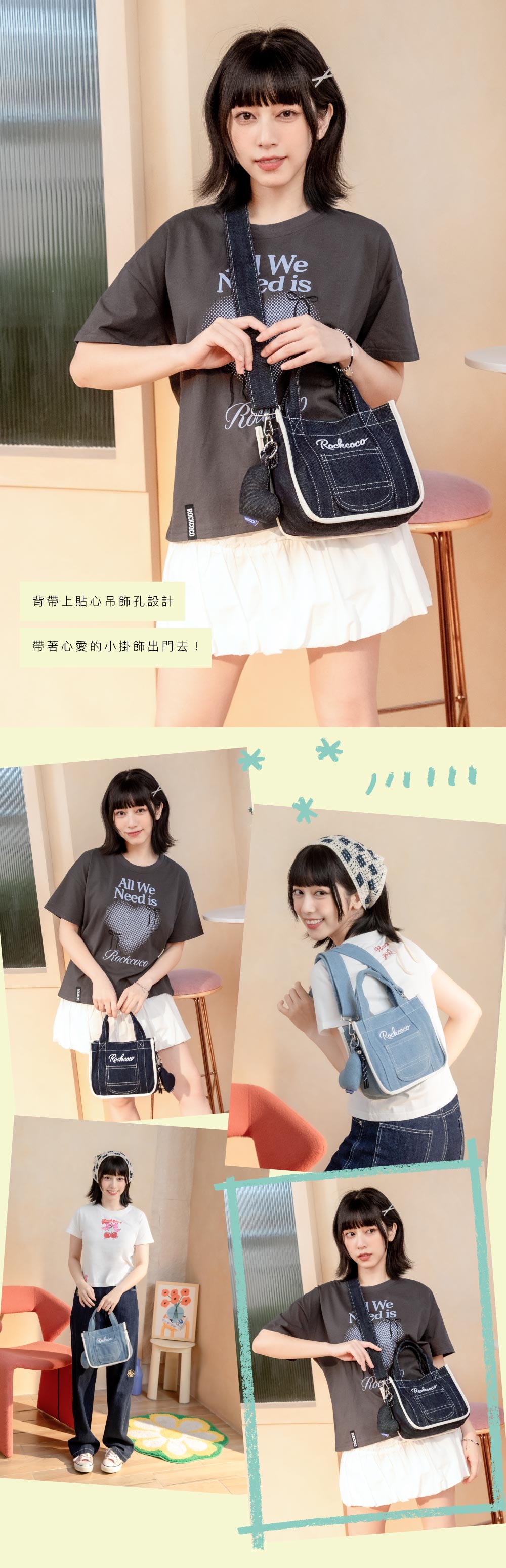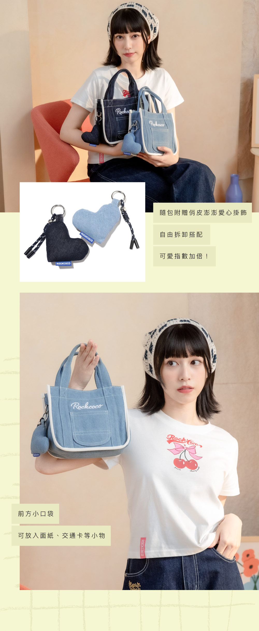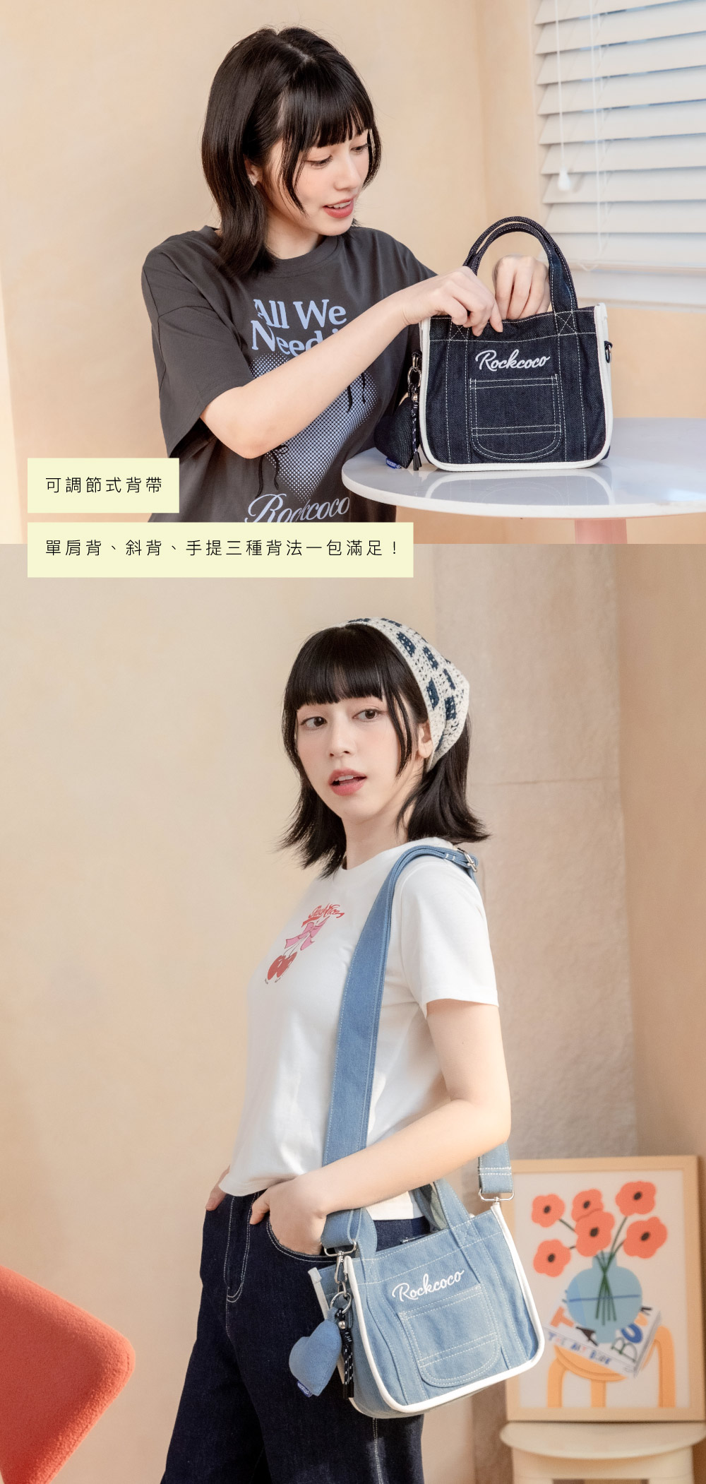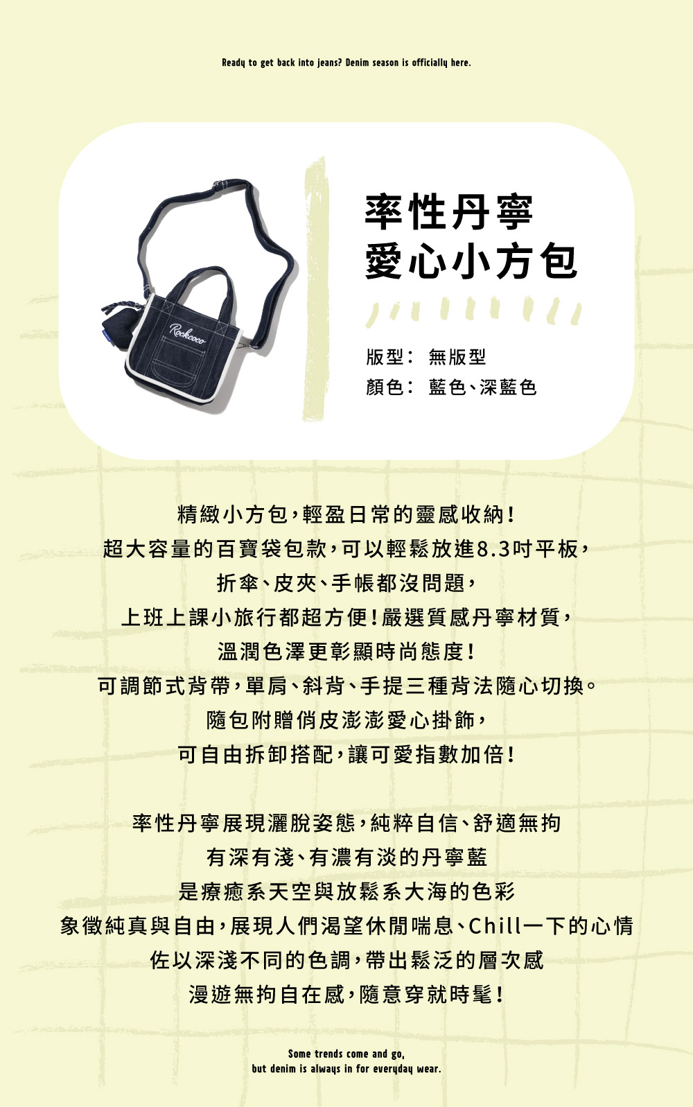精緻小方包,輕盈日常的靈感收納!超大容量的百寶袋包款,可以輕鬆放進8.3吋平板,折傘、皮夾、手帳都沒問題,上班上課小旅行都超方便!嚴選質感丹寧材質,溫潤色澤更彰顯時尚態度!可調節式背帶,單肩、斜背、手提三種背法隨心切換。隨包附贈俏皮澎澎愛心掛飾,可自由拆卸搭配,讓可愛指數加倍