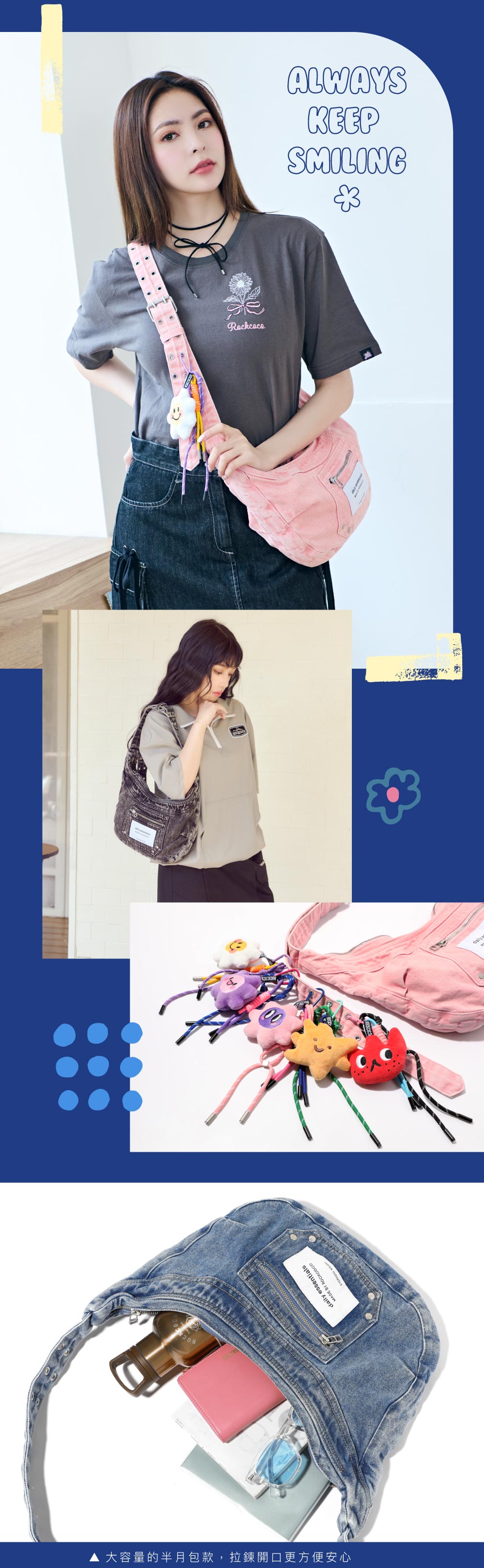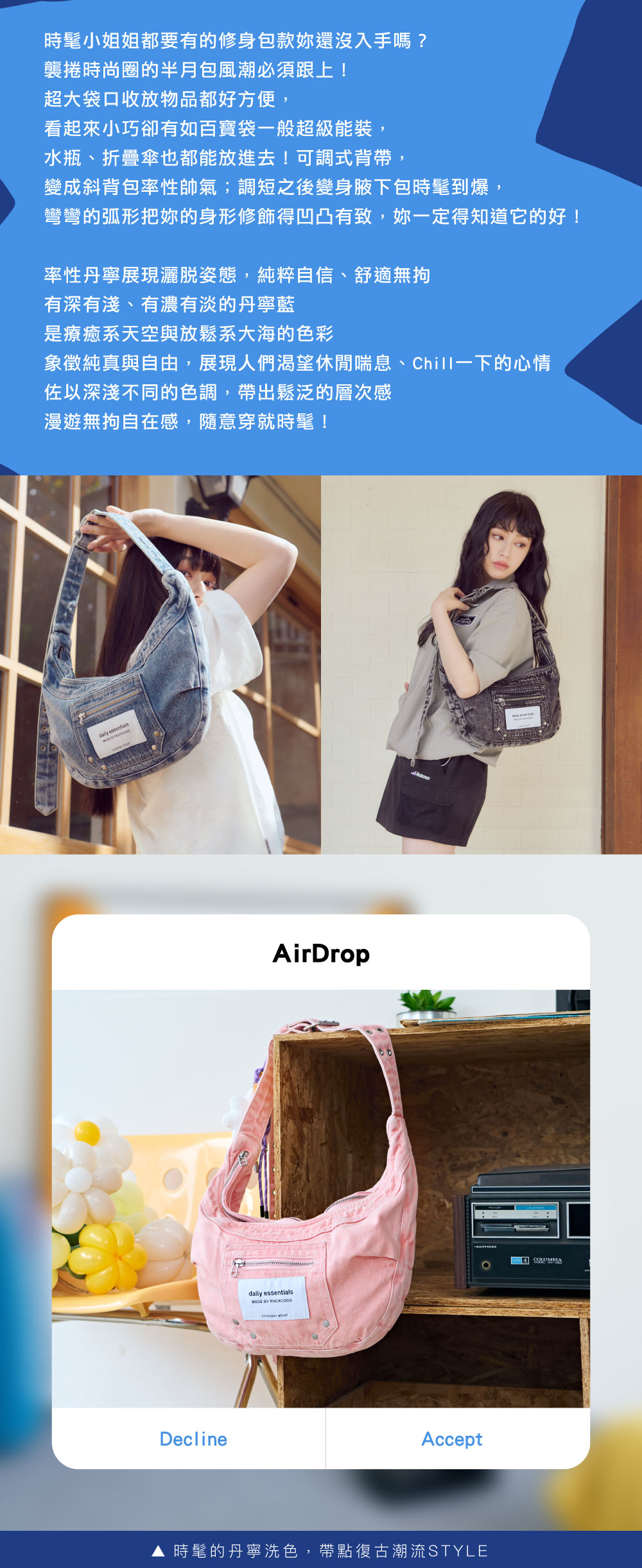 襲捲時尚圈的半月包風潮必須跟上!超大袋口收放物品都好方便,看起來小巧卻有如百寶袋一般超級能裝,水瓶、折疊傘也都能放進去!可調式背帶,變成斜背包率性帥氣;調短之後變身腋下包時髦到爆,彎彎的弧形把妳的身形修飾得凹凸有致,妳一定得知道它的好!
