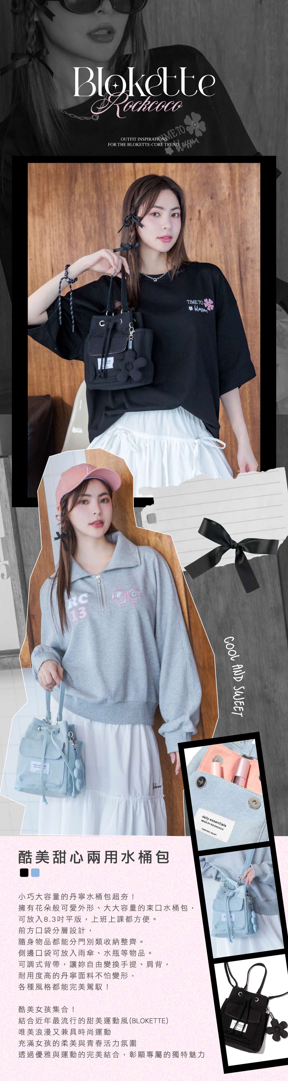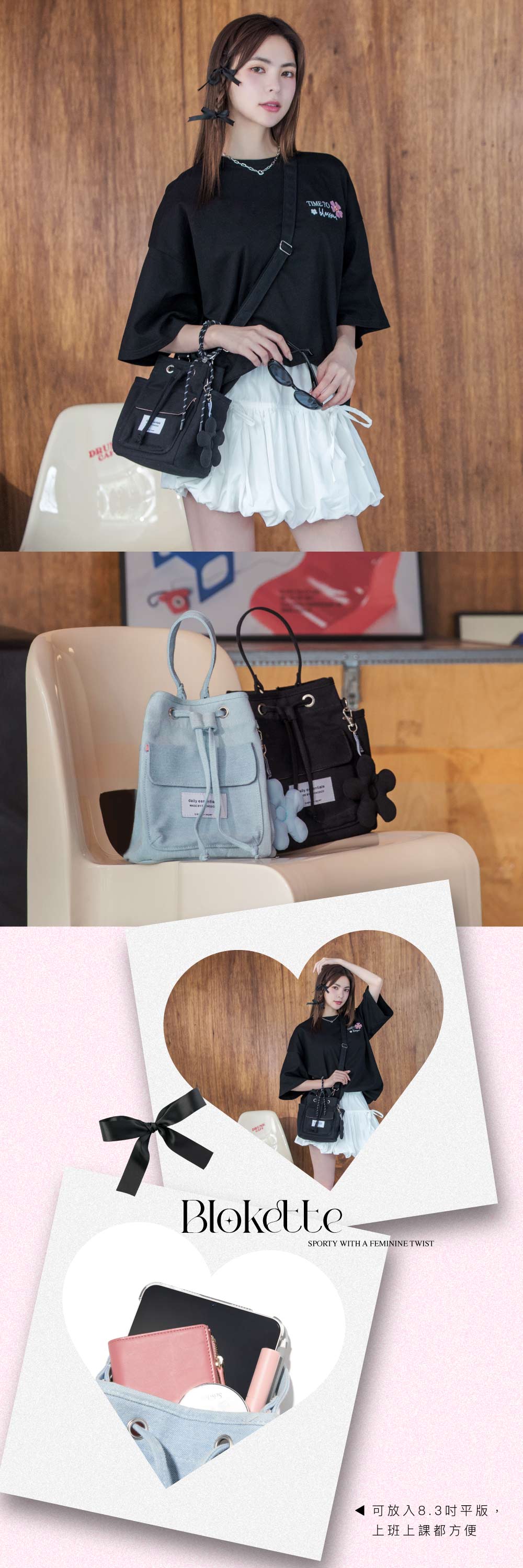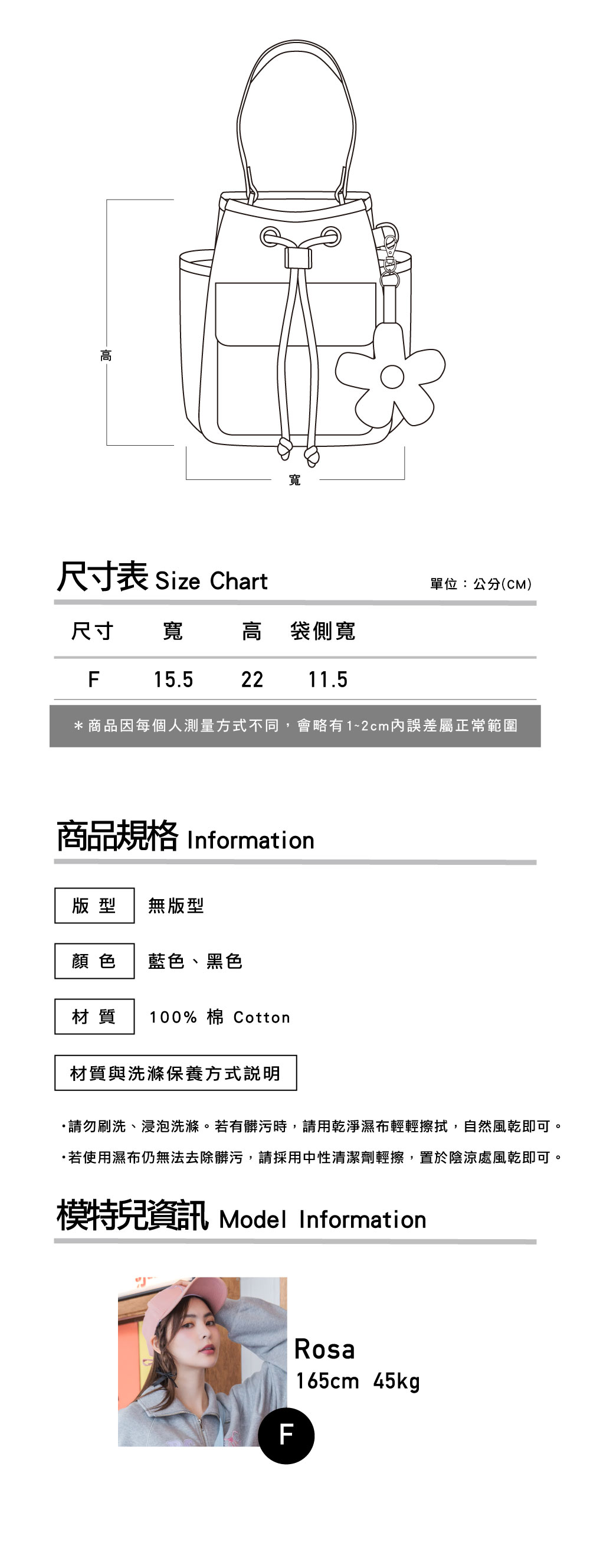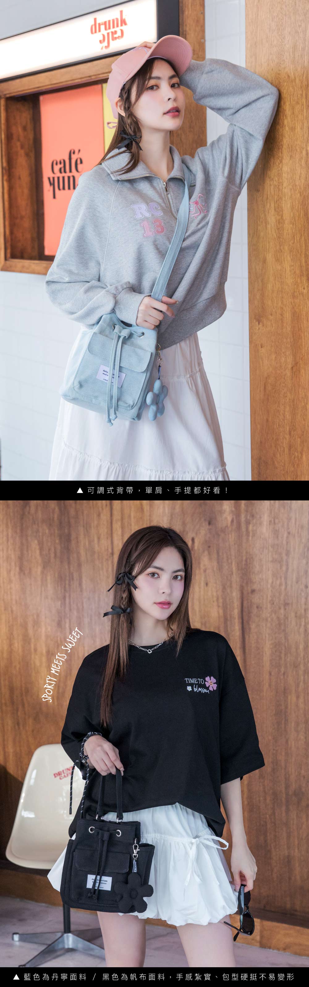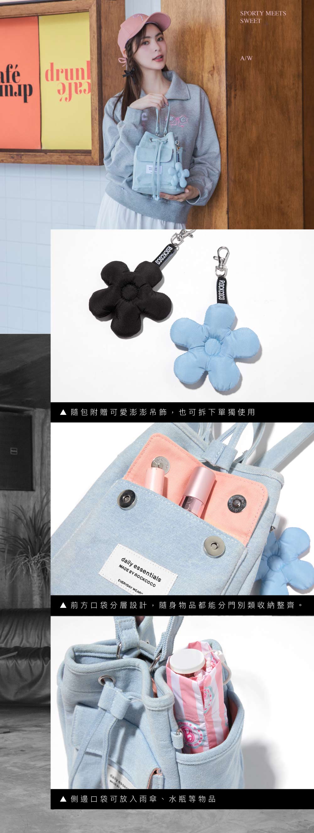 擁有花朵般可愛外形、大大容量的束口水桶包,可放入8.3吋平版,上班上課都方便。前方口袋分層設計,隨身物品都能分門別類收納整齊。側邊口袋可放入雨傘、水瓶等物品。可調式背帶,讓妳自由變換手提、肩背,耐用度高的丹寧面料不怕變形,各種風格都能完美駕馭