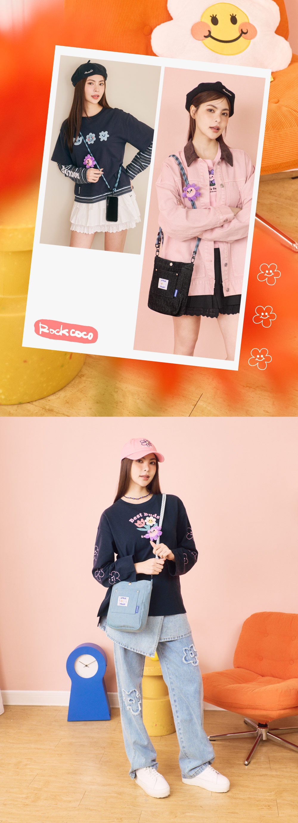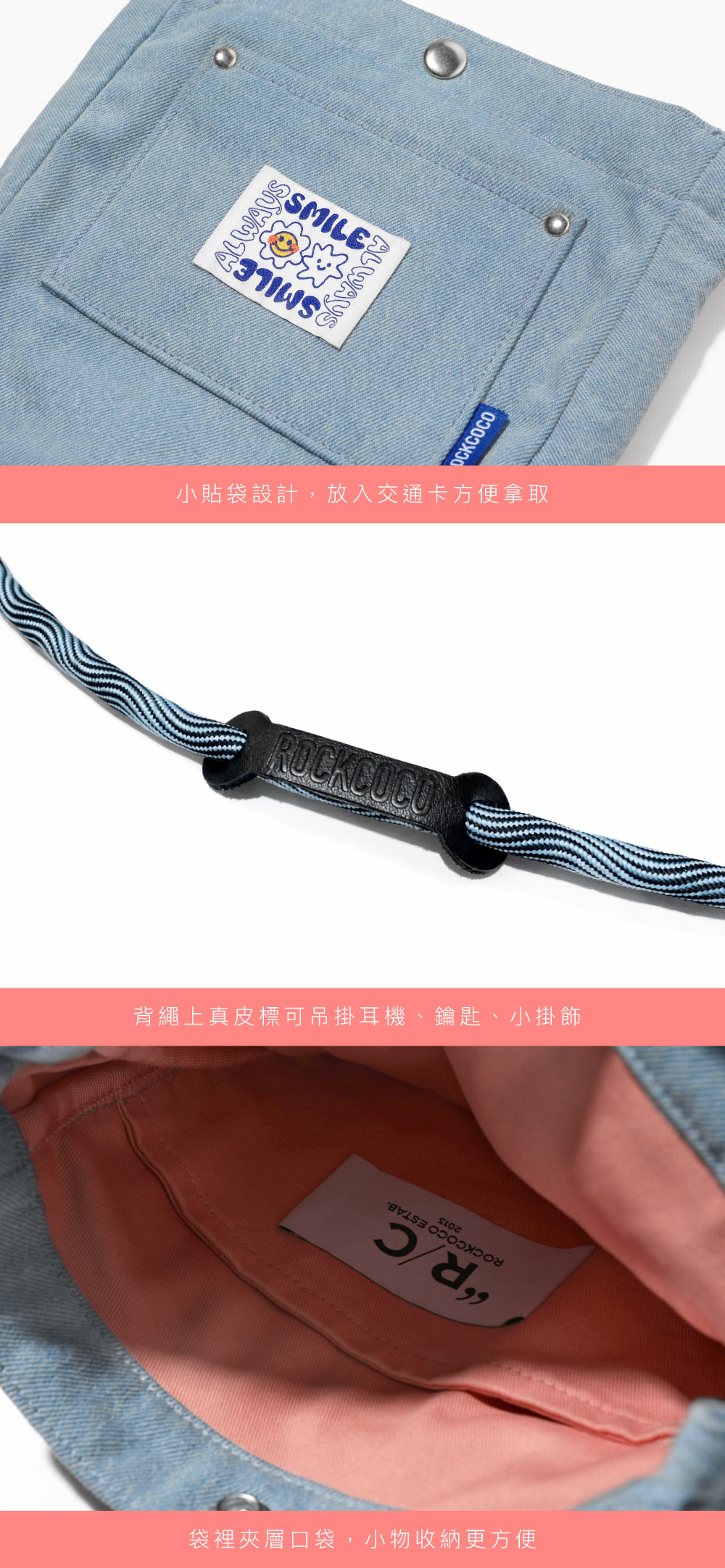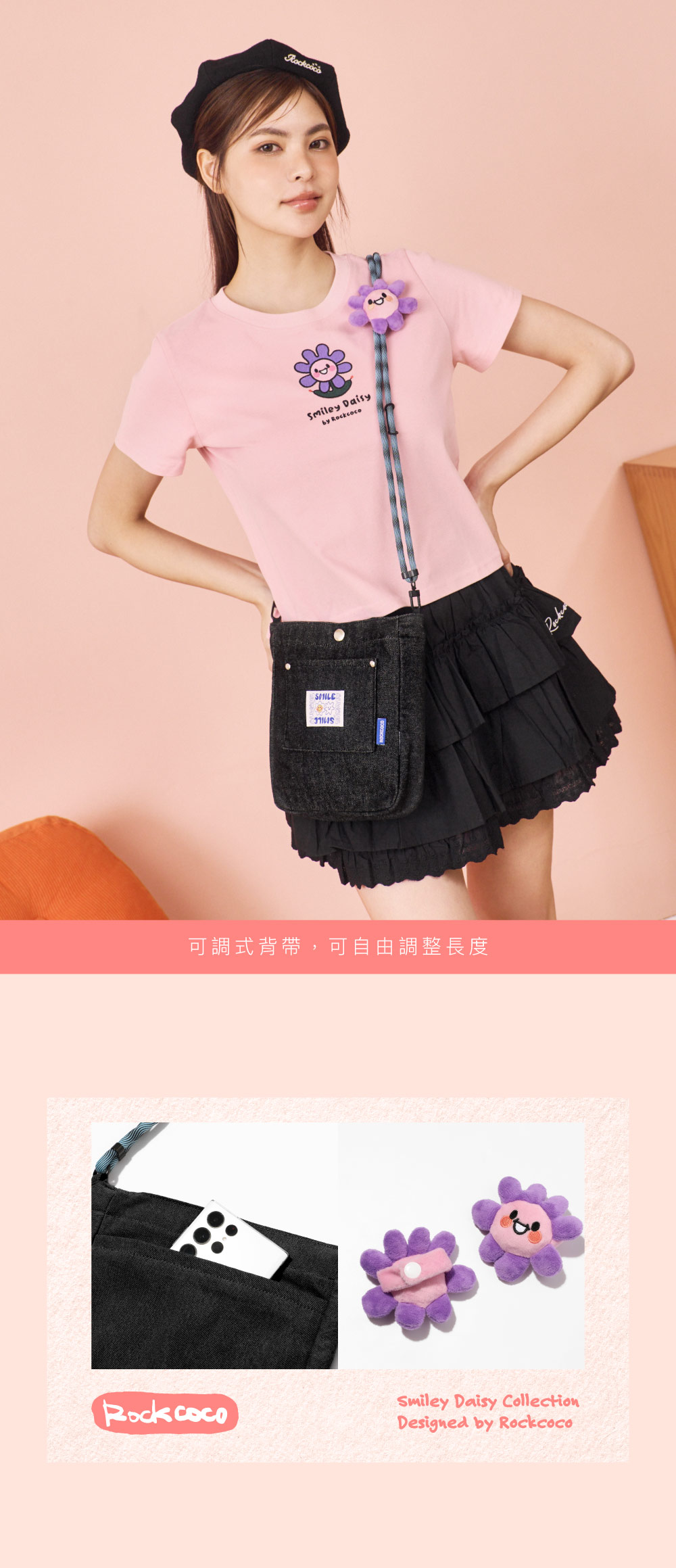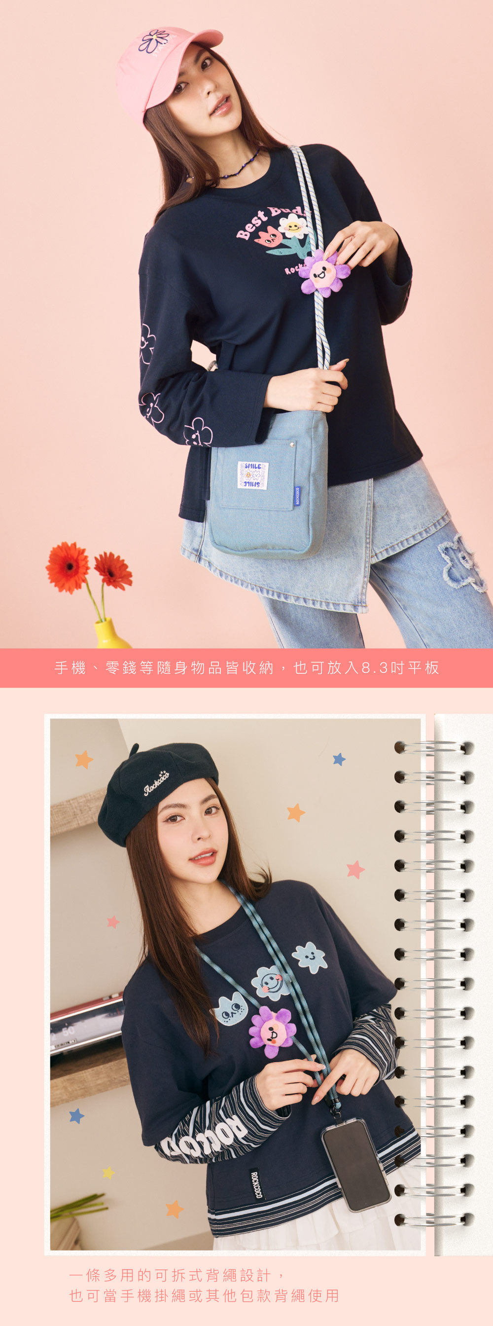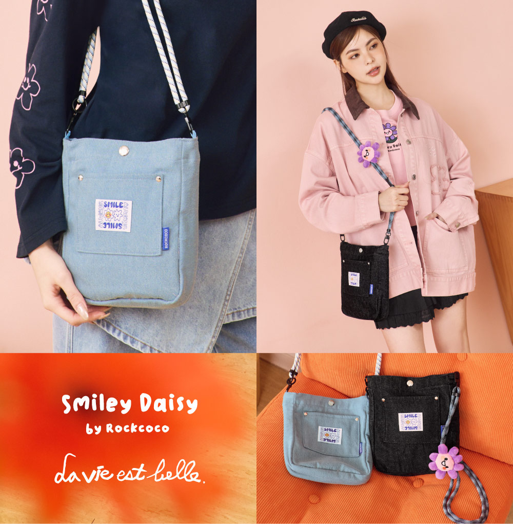 外出、上班都百搭的丹寧斜背包!精緻小巧包款但超能裝,手機、錢包、鑰匙都安心放,8.3吋平板也能輕鬆裝,前方小貼袋設計,放入交通卡方便拿取,超便利的可調式斜背設計,各種身高都OK!隨包附贈超可愛小花扣飾,還可自行拆下搭配使用!