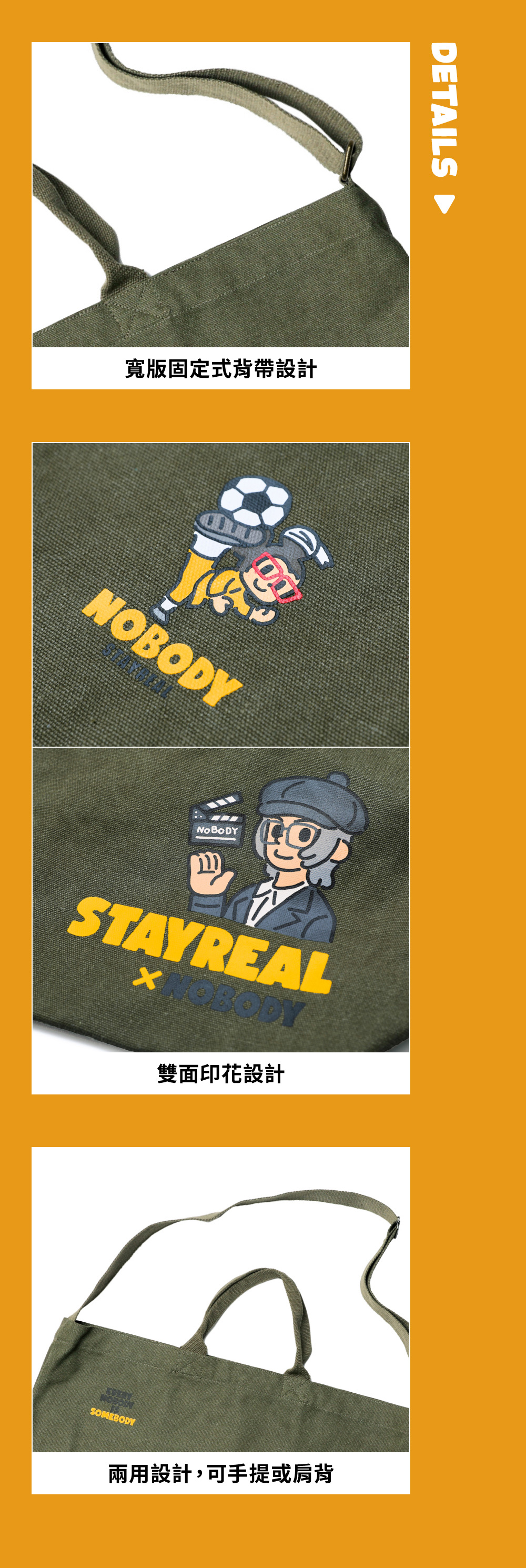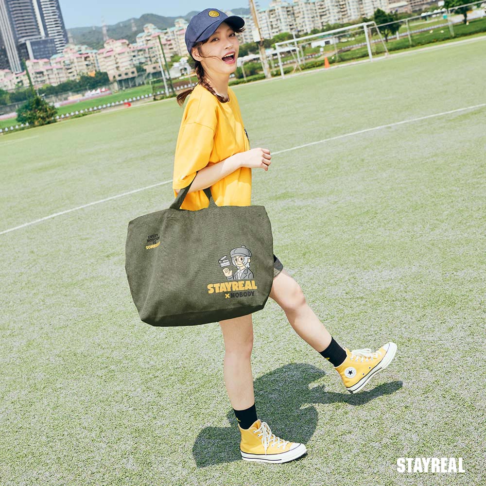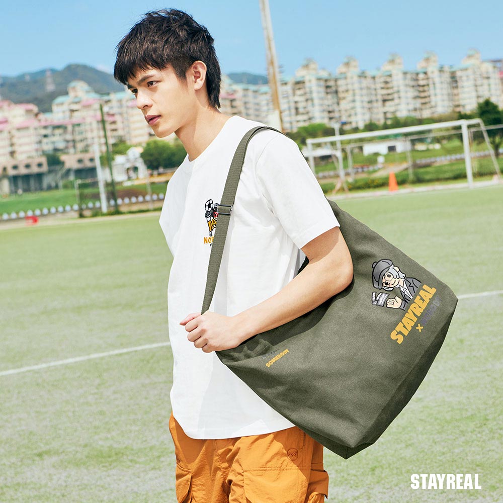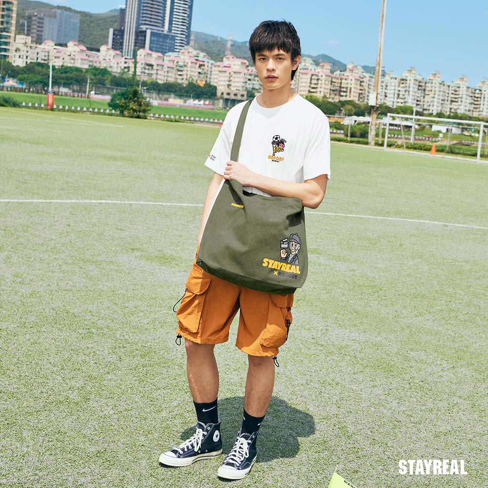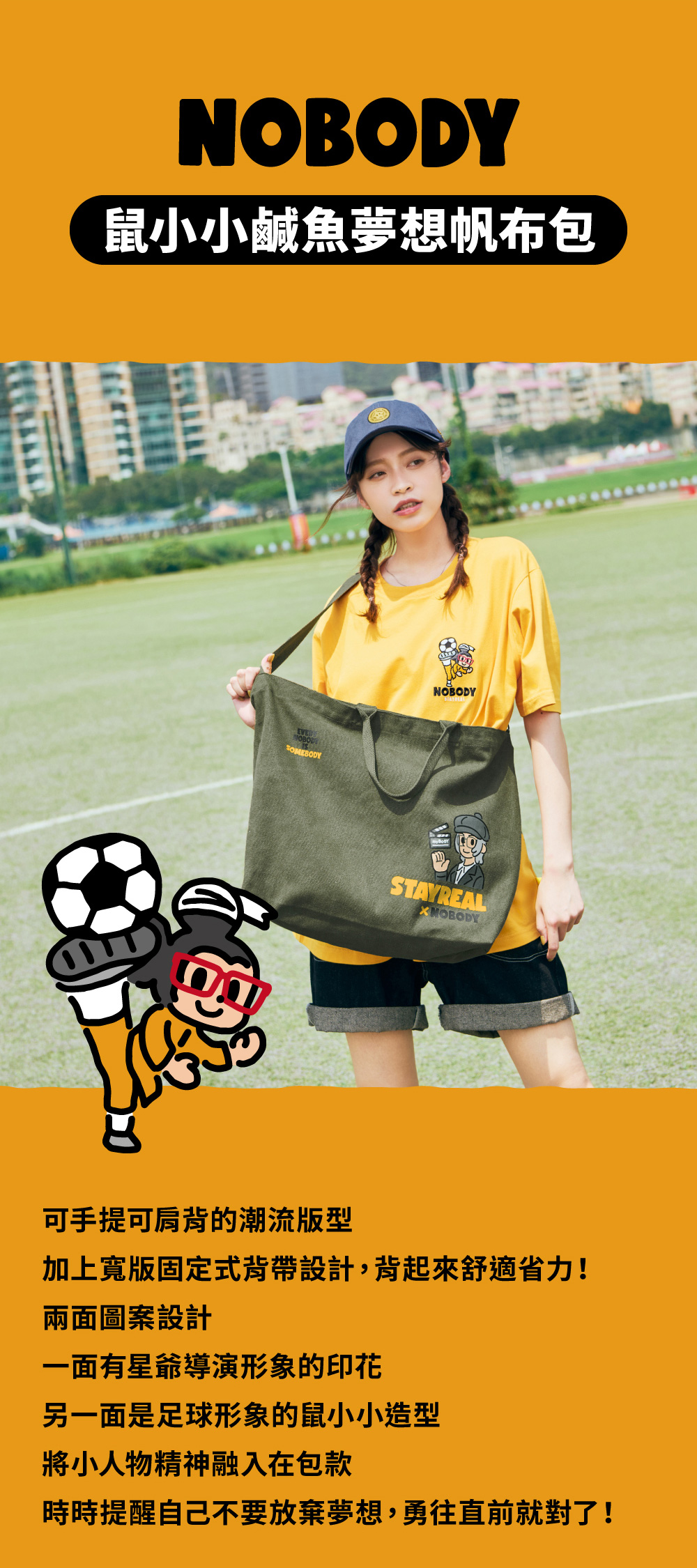 雙面背設計,一面是凸顯聯名LOGO結合導演形象的印花設計,另一面是足球形象鼠小小的印花設計
