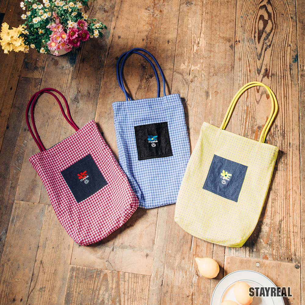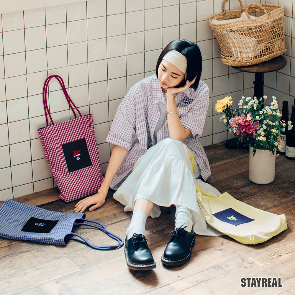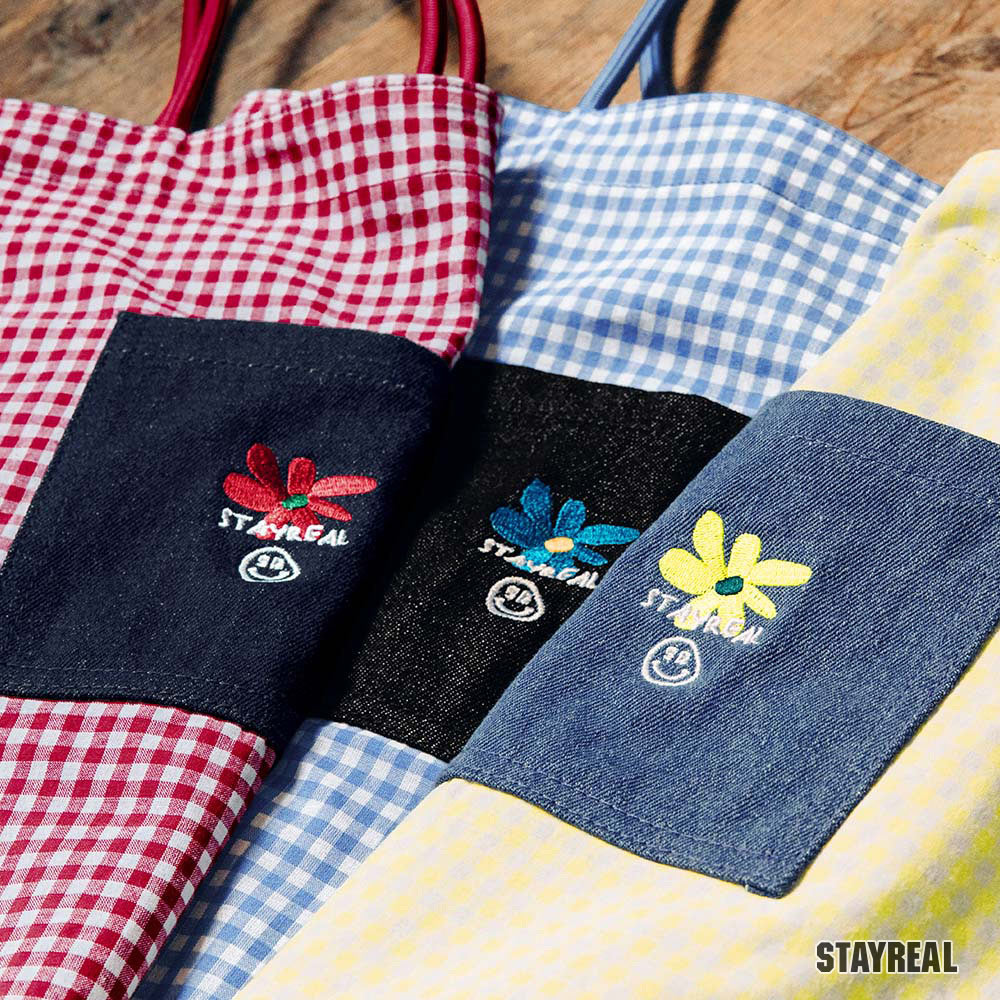 格紋面:花朵笑臉STAYREAL字體電繡圖案