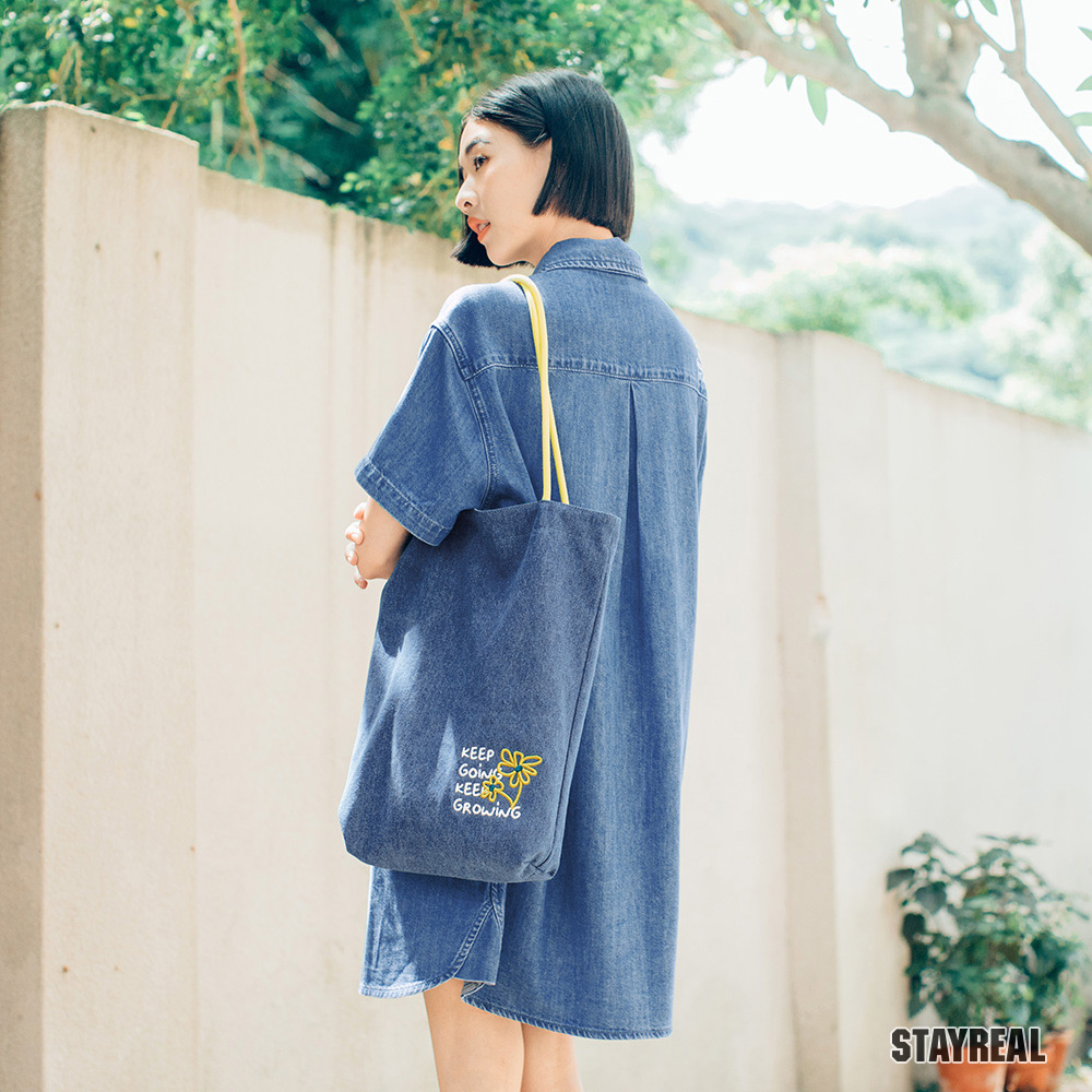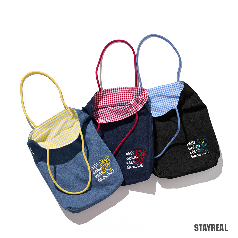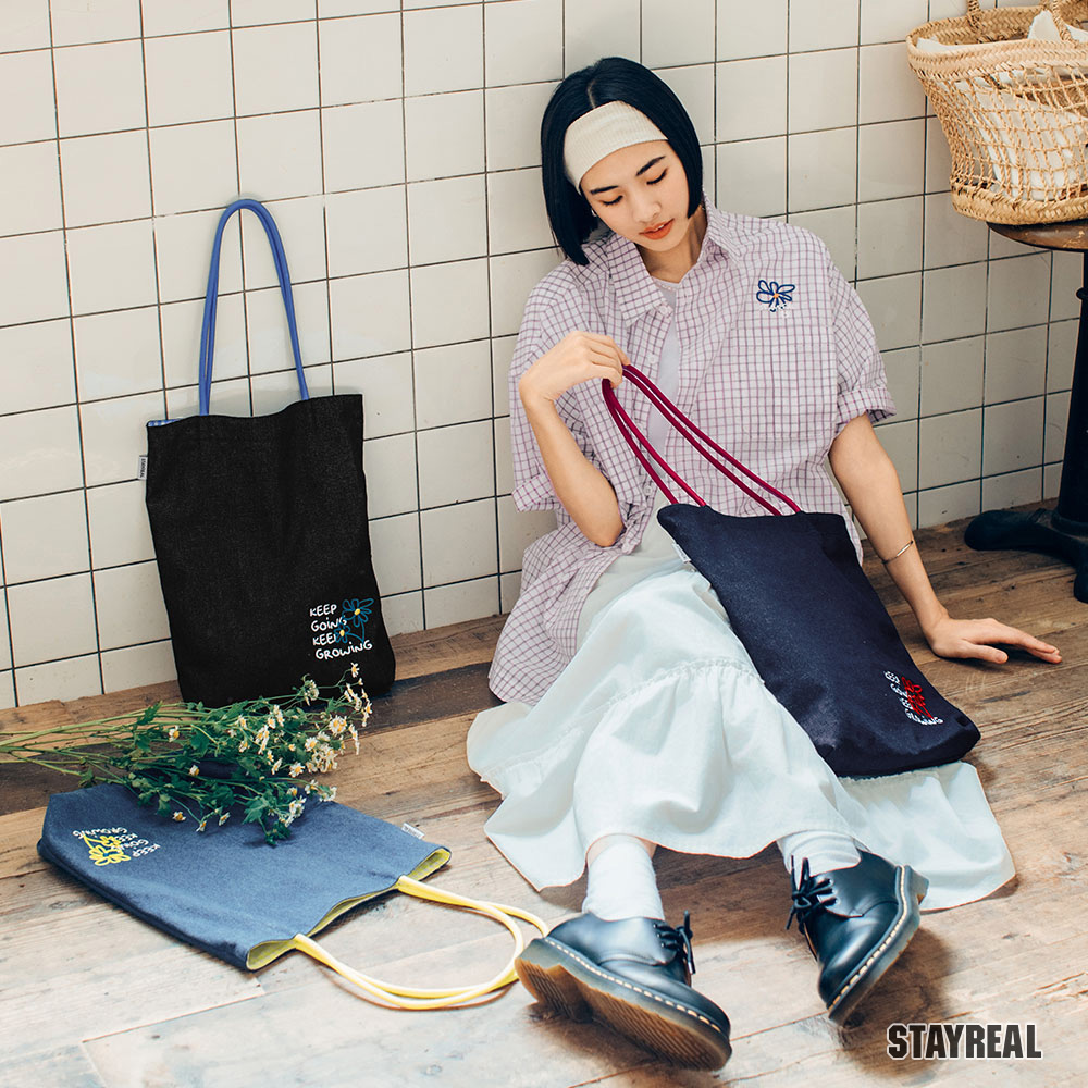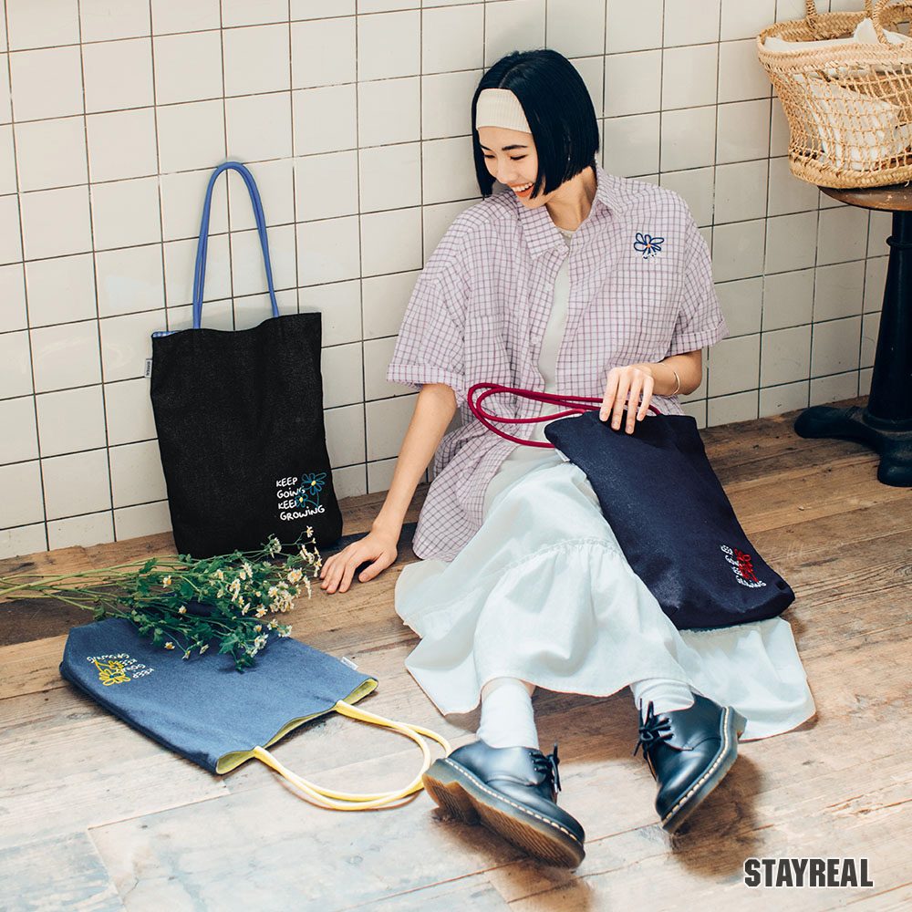 牛仔面:標語&跳色花朵質感電繡,側邊上車縫STAYREAL品牌字樣夾標