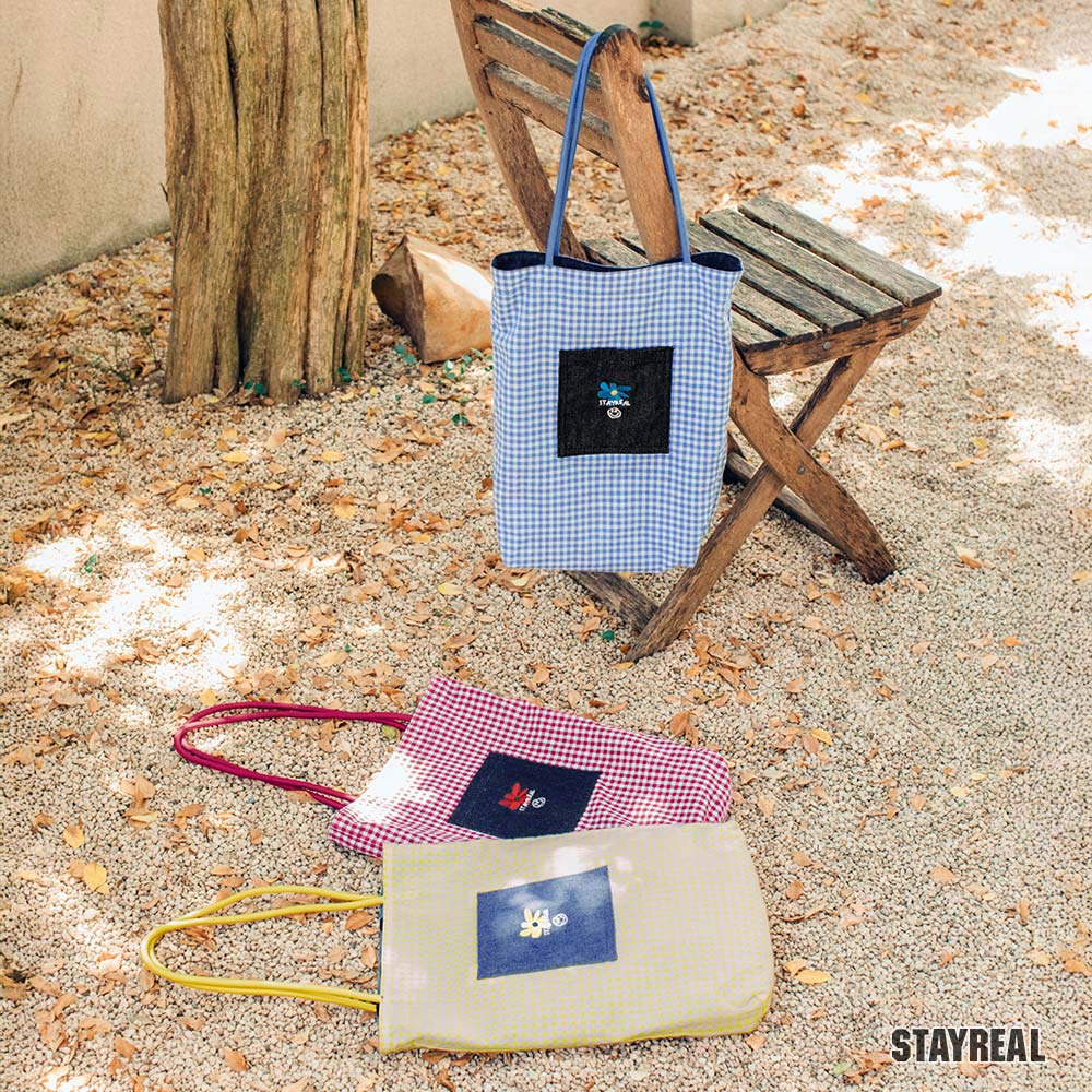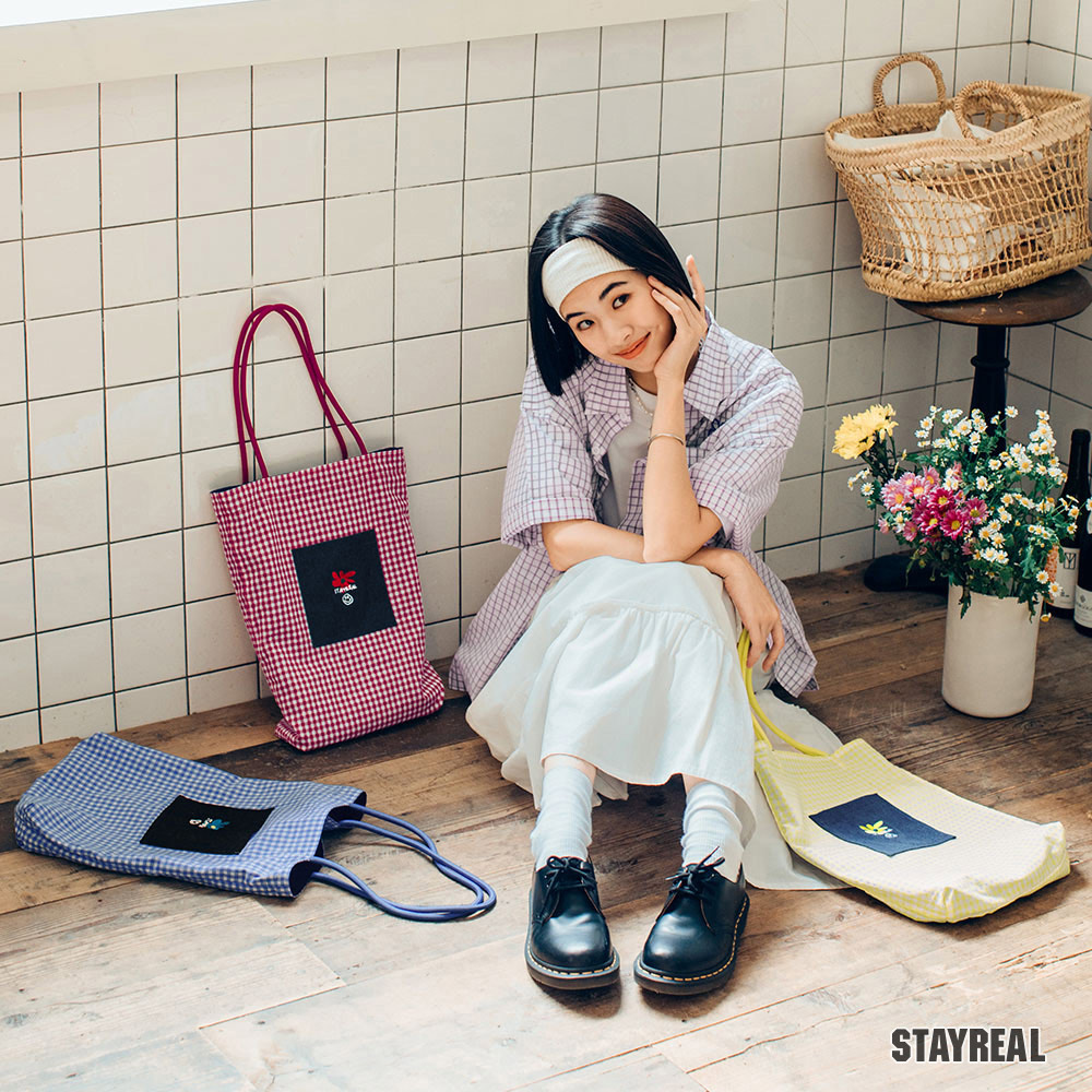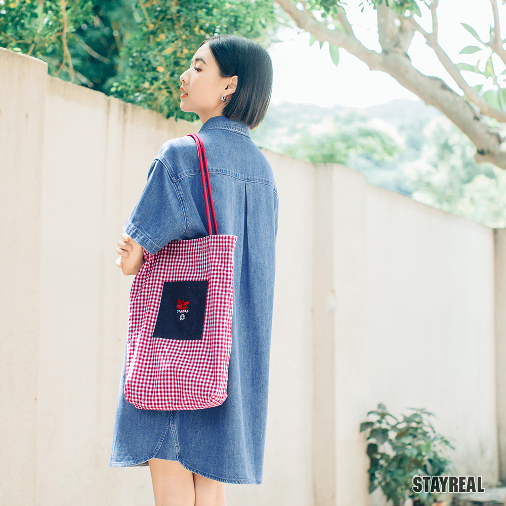 雙面用布料可隨心情及穿搭變化使用格紋面料有增加丹寧貼袋,可放置小物圓股粗繩肩背手提兩用