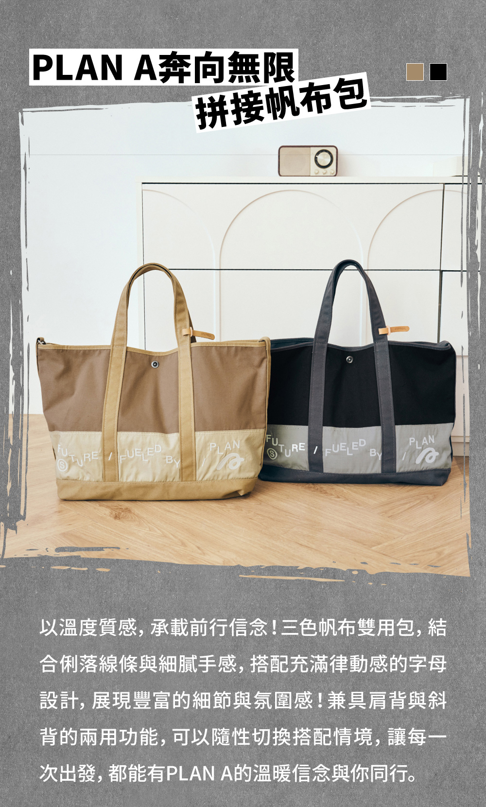 黑色系和卡其色系的tone on tone同色系拼接,搭配五分格帆布上的PLANAlogo刺繡。正背面兩種不同方向的拼接設計