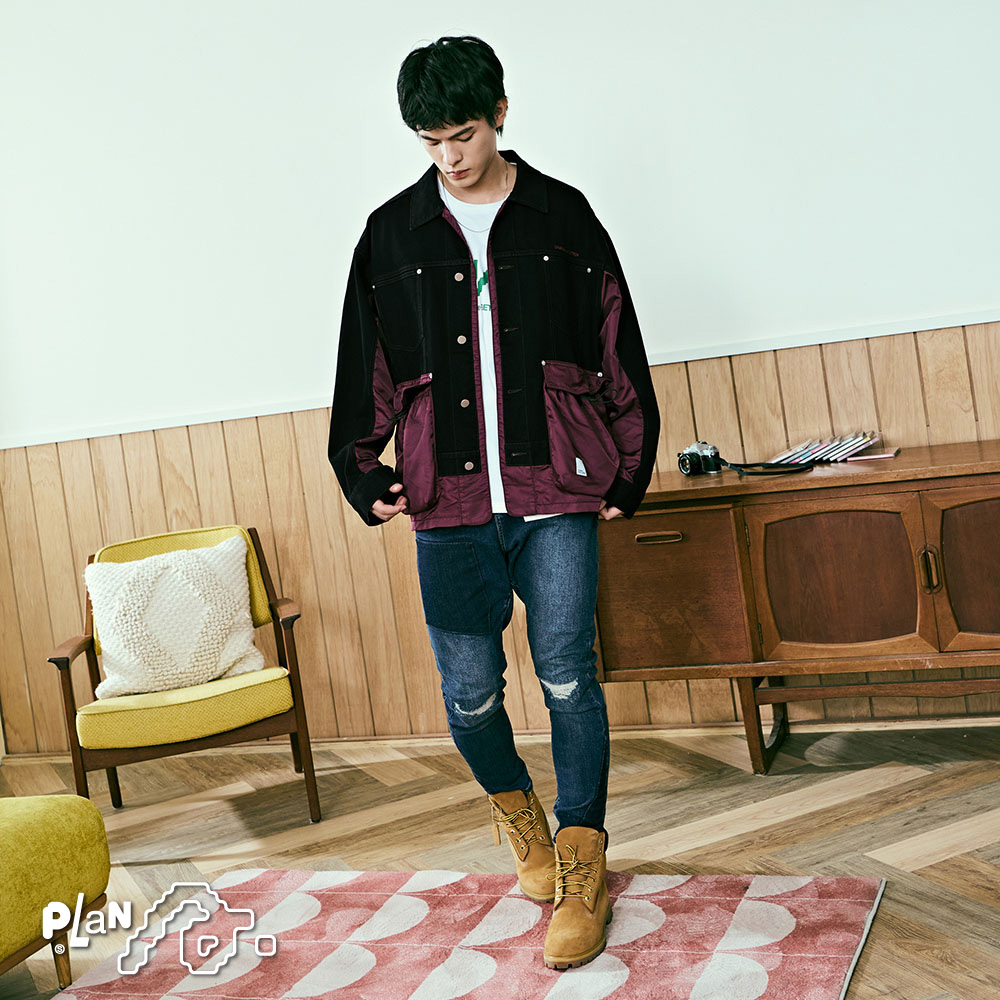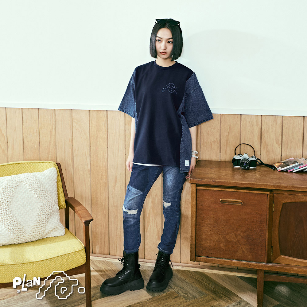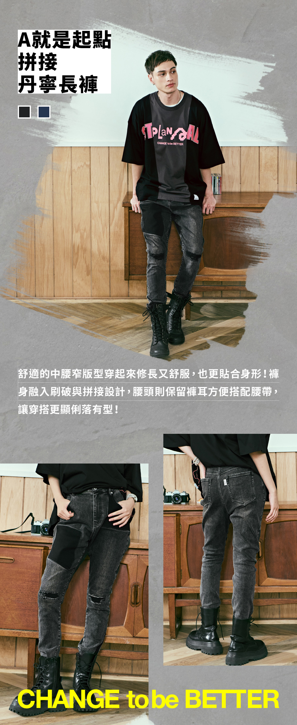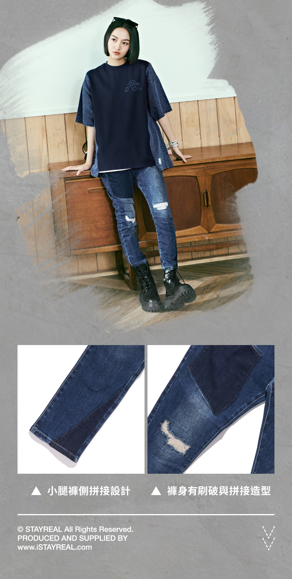 破壞細節內襯牛仔布,腰頭保留褲耳可搭配腰帶,口袋與褲身做配色處理,整體視覺更活潑