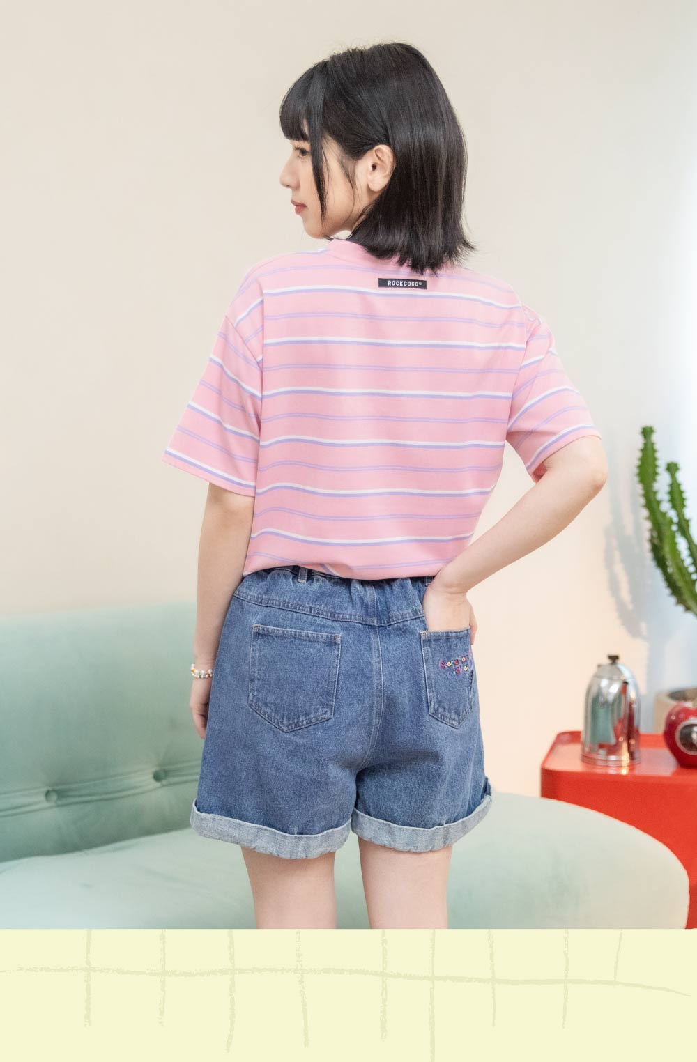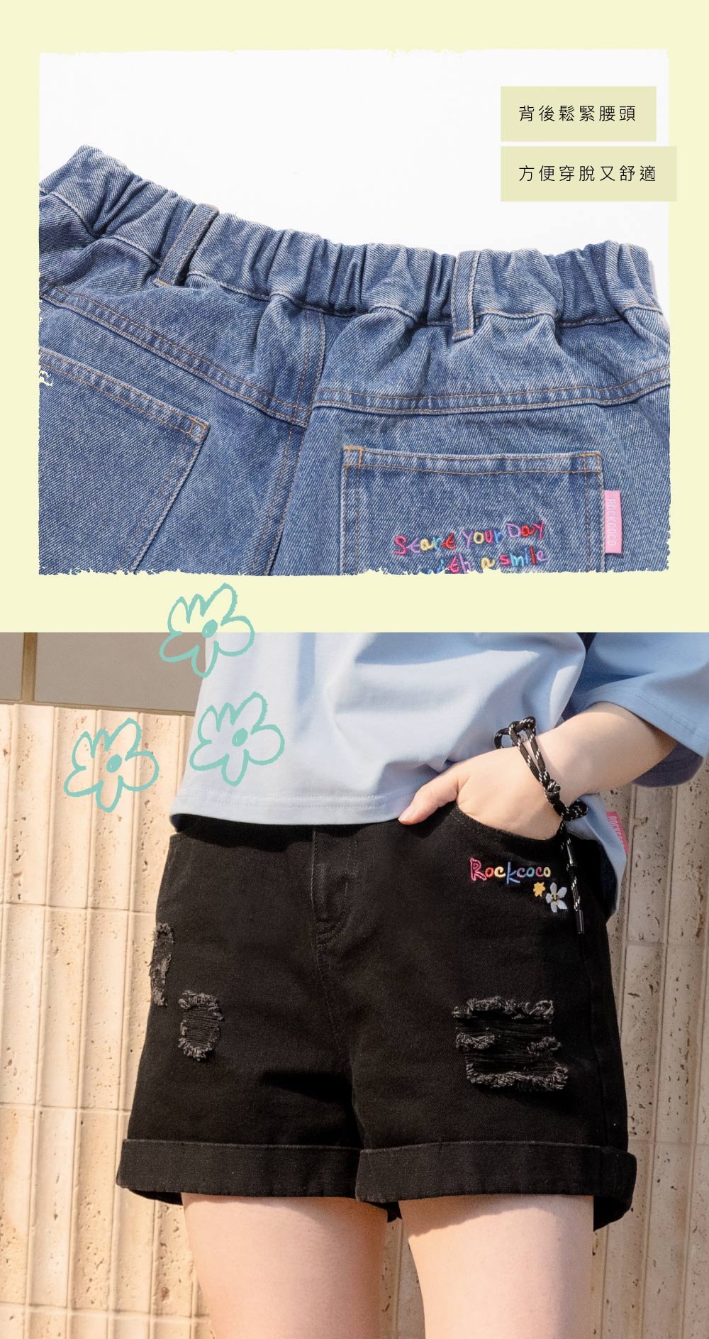 選用較挺的丹寧面料,將小腹肉肉都收好好,舒適不緊繃,後腰則是鬆緊帶設計,方便穿脫不卡臀