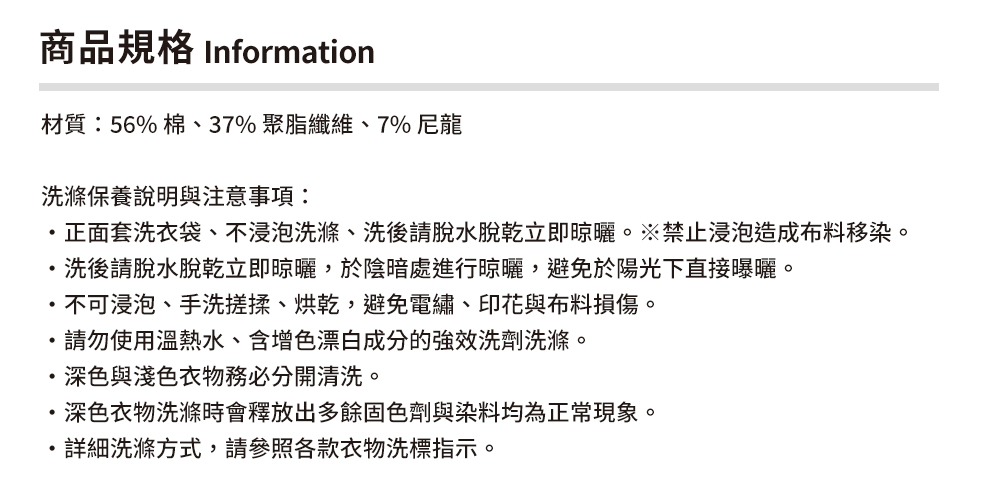 使用混紡面料同時具有棉質柔軟手感及耐洗不易變形等特性