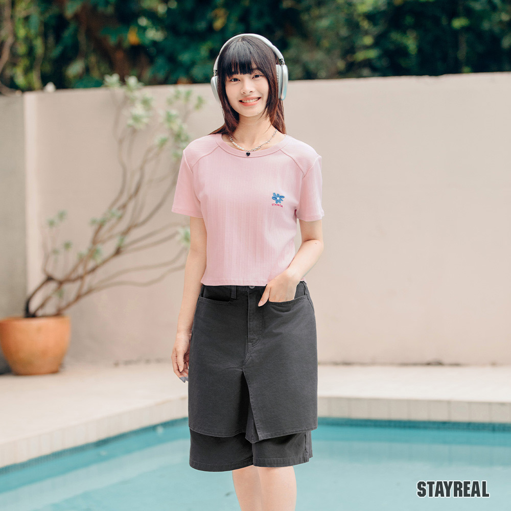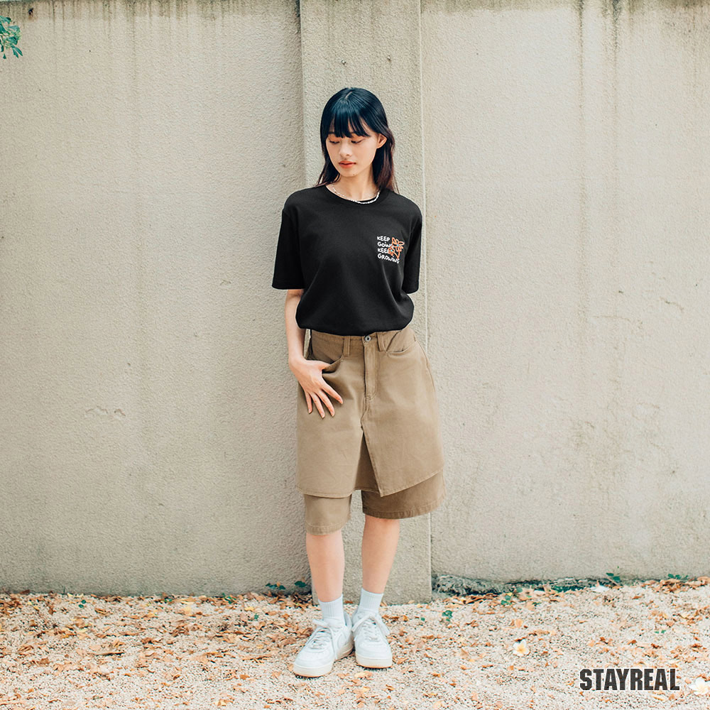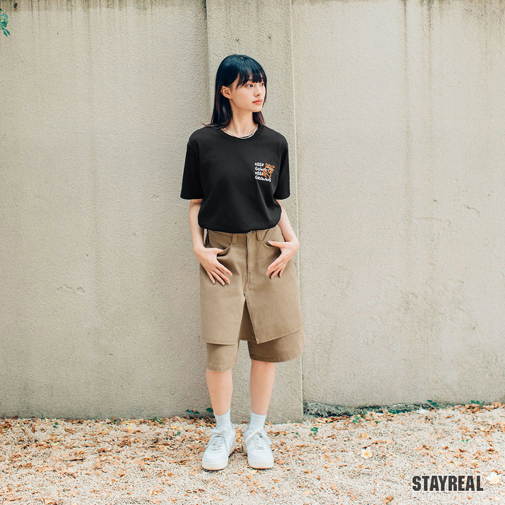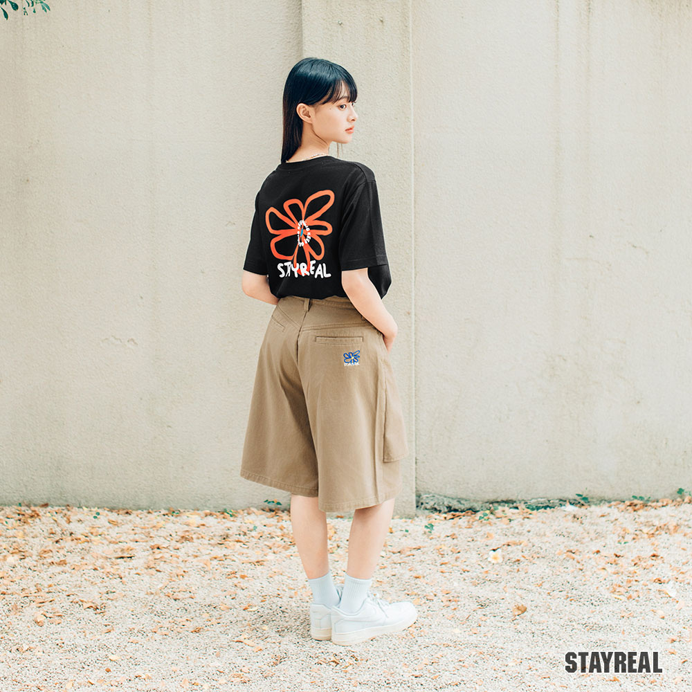 後右口袋下電繡花朵&STAYREAL字體圖案