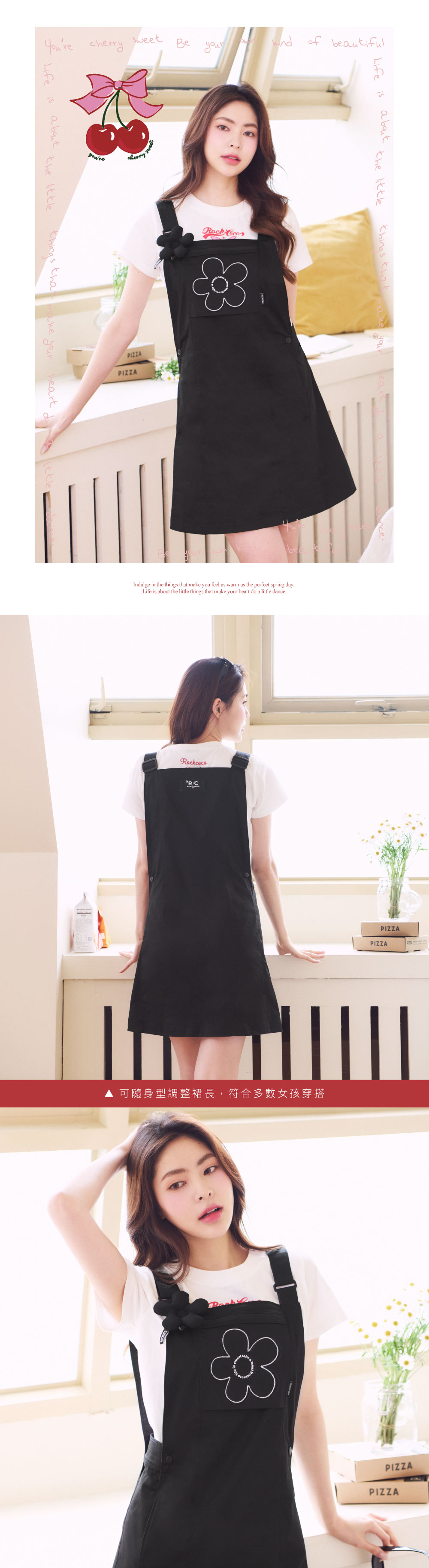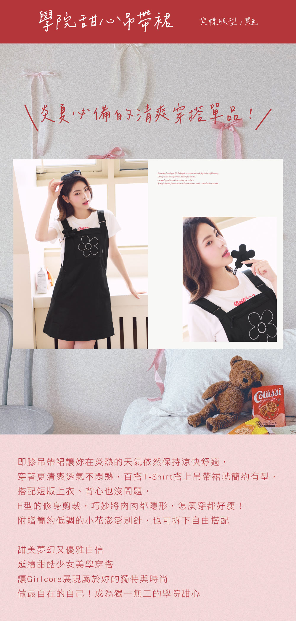 即膝吊帶裙讓妳在炎熱的天氣依然保持涼快舒適,穿著更清爽透氣不悶熱,百搭T-Shirt搭上吊帶裙就簡約有型,搭配短版上衣、背心也沒問題,H型的修身剪裁,巧妙將肉肉都隱形,怎麼穿都好瘦!附贈簡約低調的小花澎澎別針,也可拆下自由搭配
