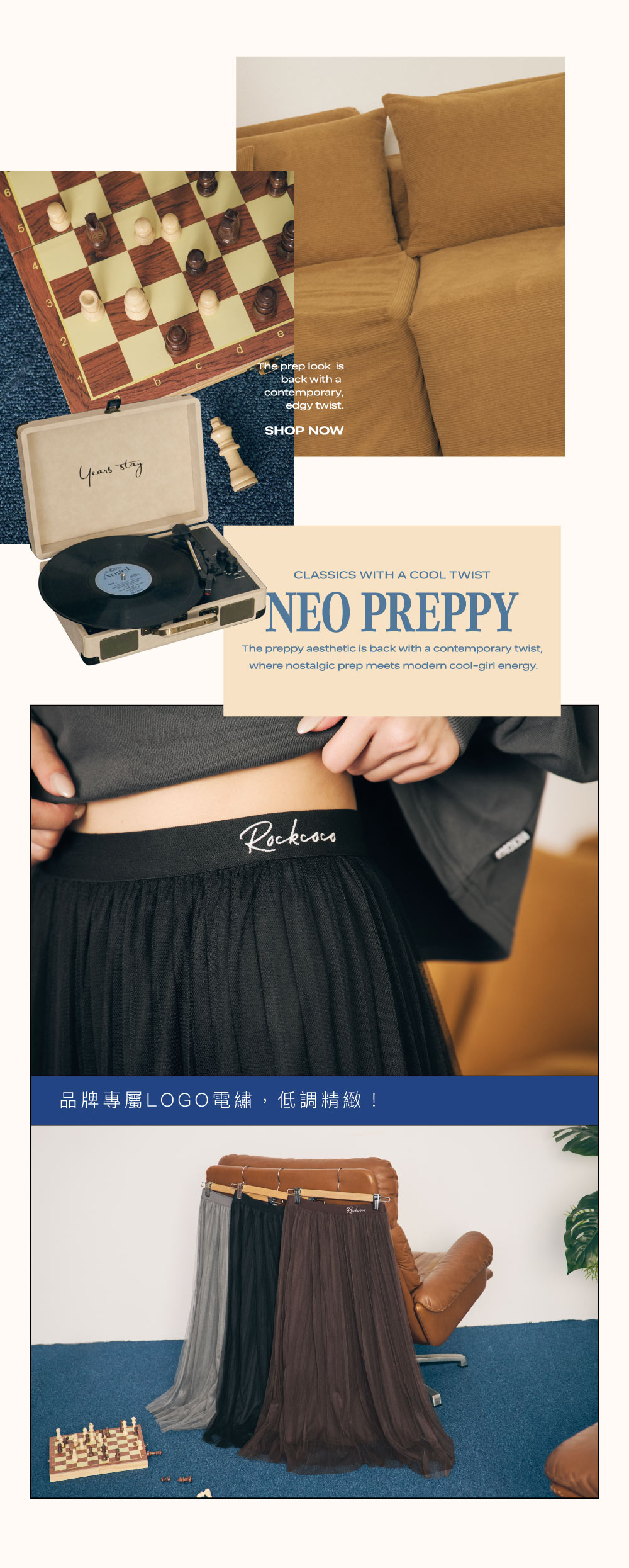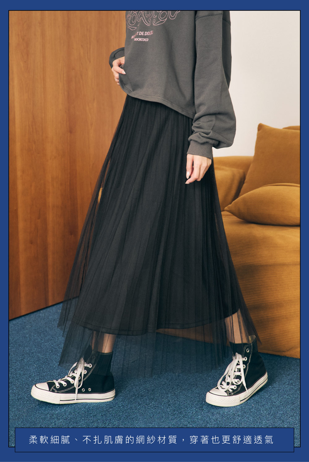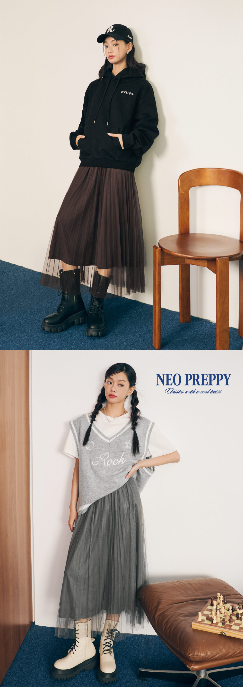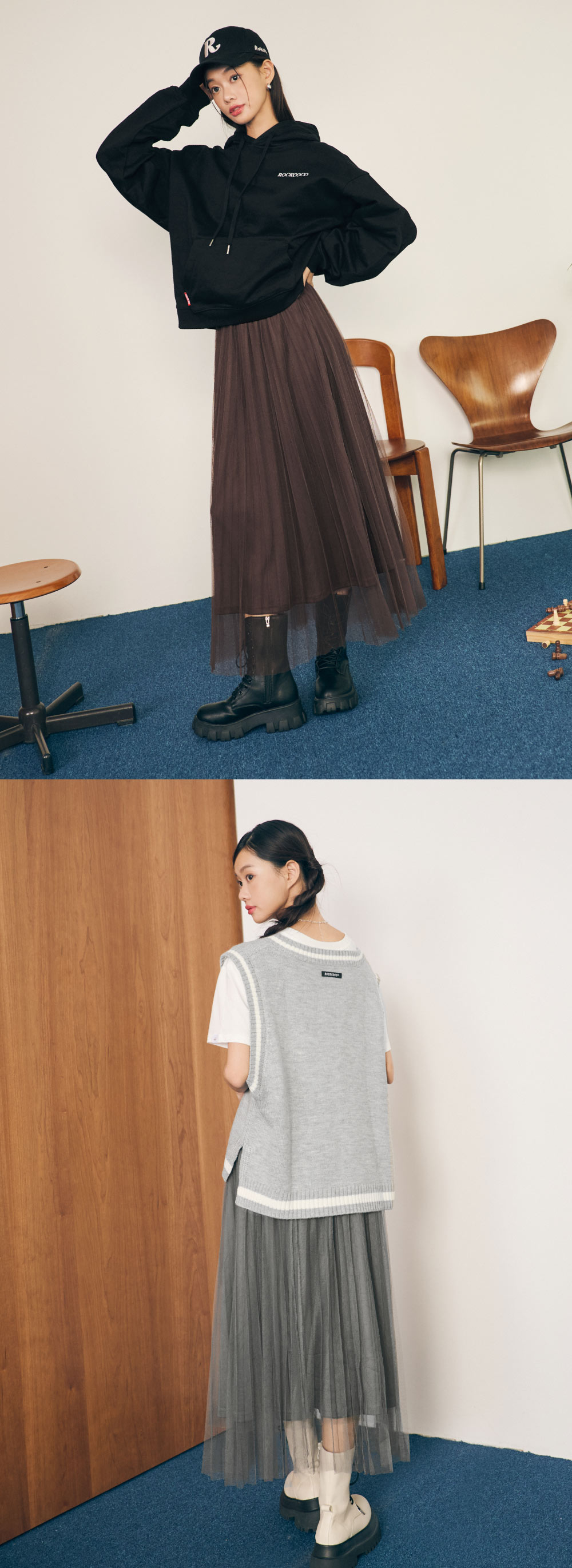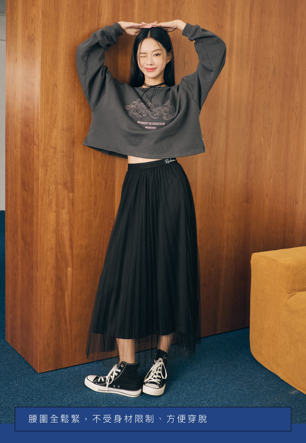 雙層紗網搭配百褶設計,營造出輕盈又有份量的層次感。細緻百褶線條在步伐間自然飄逸,展現低調優雅的學院氛圍。鬆緊腰頭搭配品牌電繡 LOGO,舒適好穿又兼具設計感。無論搭配寬鬆條紋上衣、學院風針織背心或休閒帽T,都能輕鬆完成 「經典 × 潮流」的新學院穿搭。