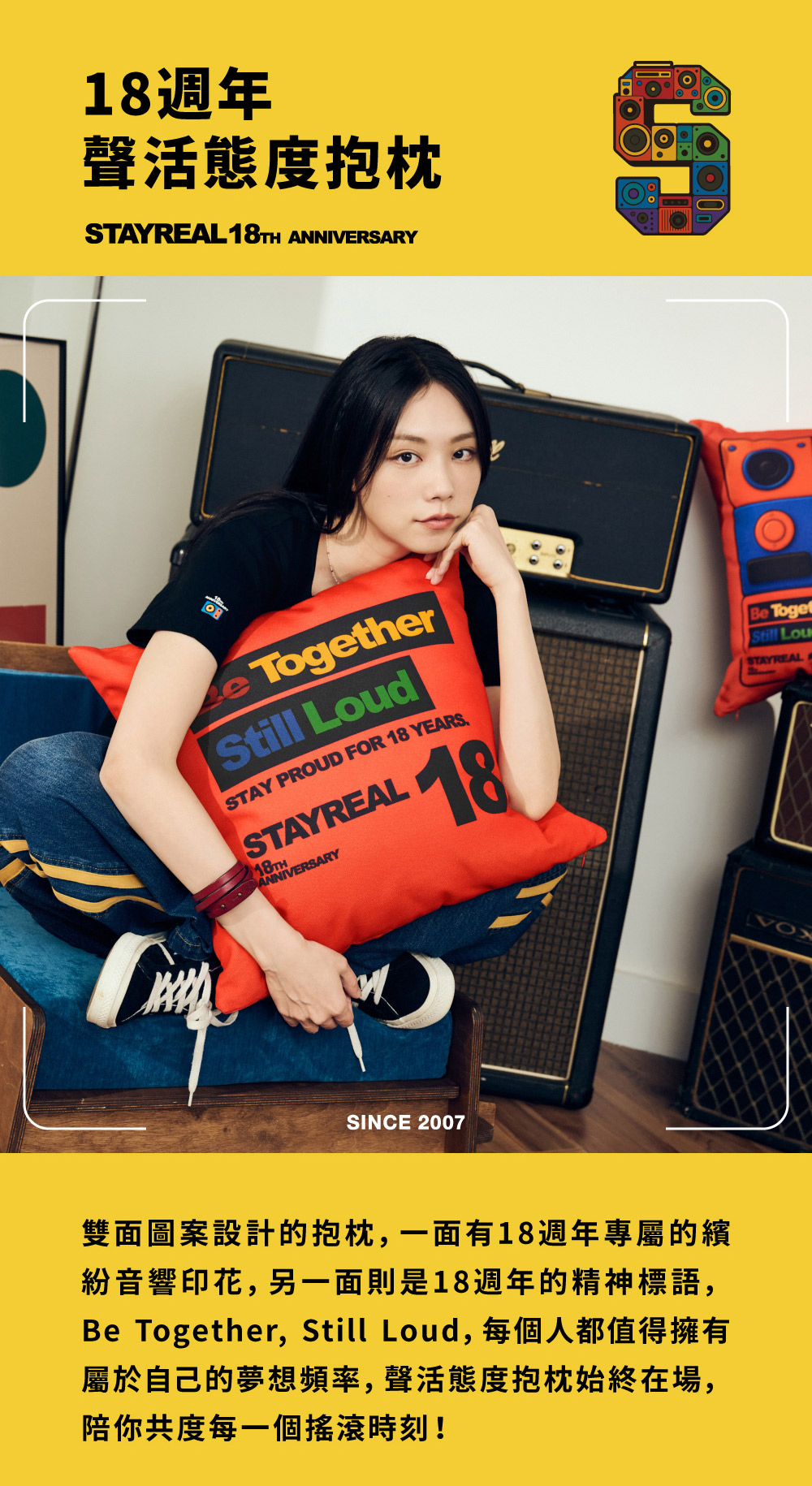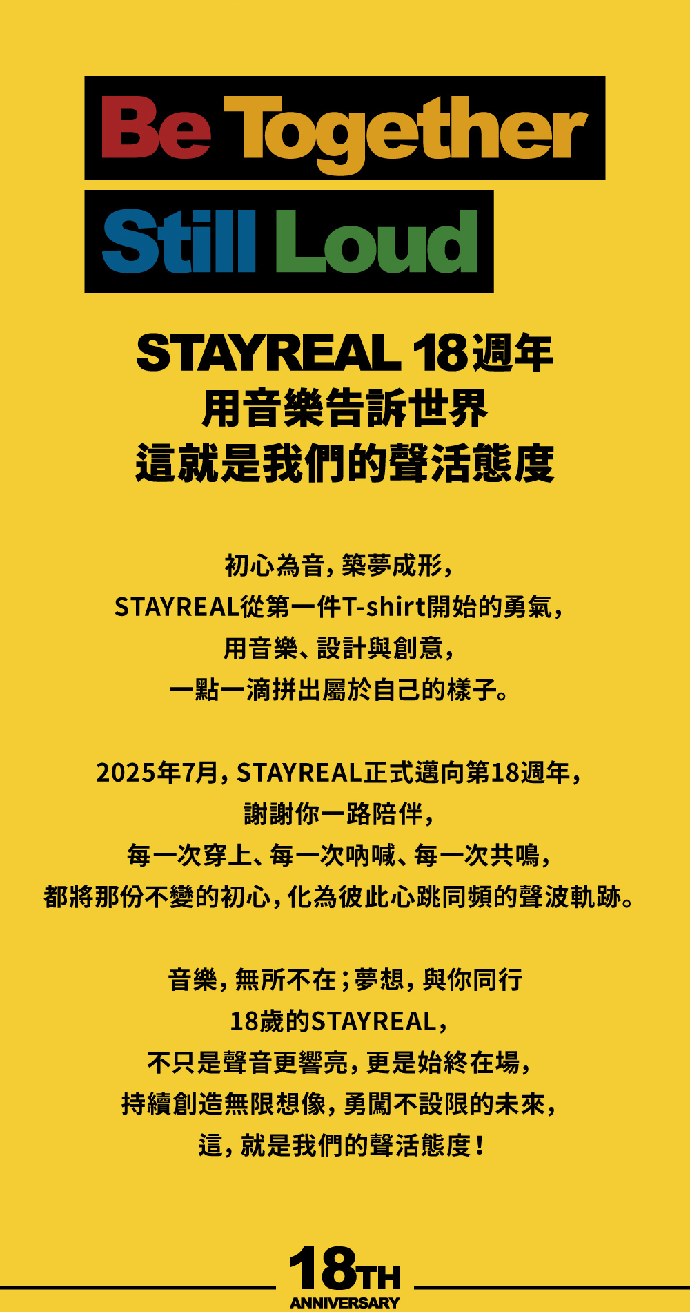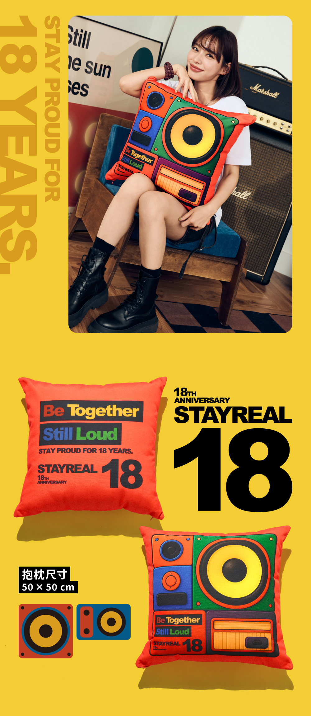 正面以STAYREAL =STEREO品牌精神,以STEREO立體聲道為你發聲,堆疊音響元件組合出專屬於你的「聲」活態度!背面以Be Together, Still Loud的搖滾精神,傳達18年來一貫的驕傲!