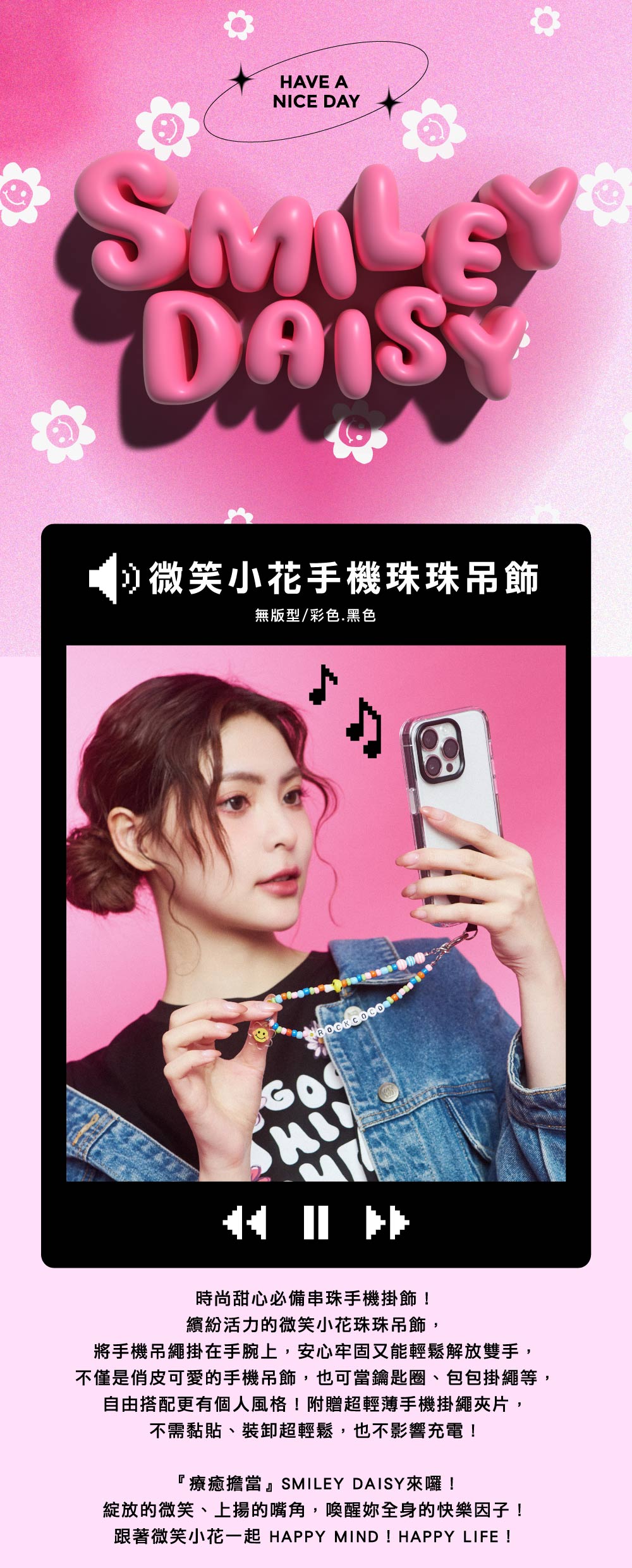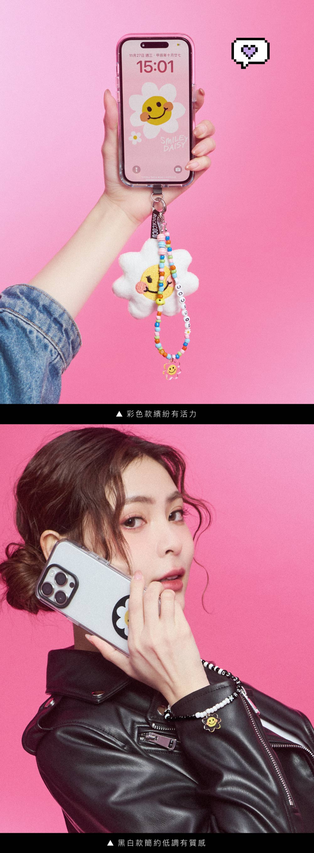 時尚甜心必備串珠手機掛飾!繽紛活力的微笑小花珠珠吊飾,將手機吊繩掛在手腕上,安心牢固又能輕鬆解放雙手,不僅是俏皮可愛的手機吊飾,也可當鑰匙圈、包包掛繩等,自由搭配更有個人風格!附贈超輕薄手機掛繩夾片,不需黏貼、裝卸超輕鬆,也不影響充電!
