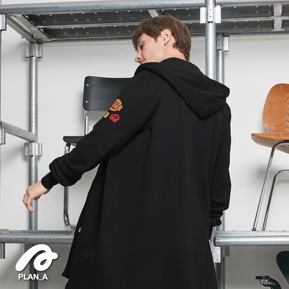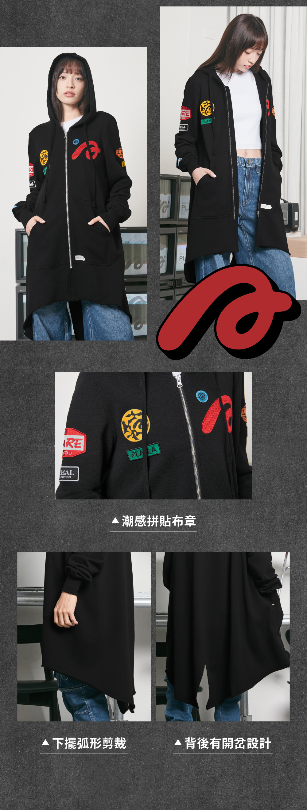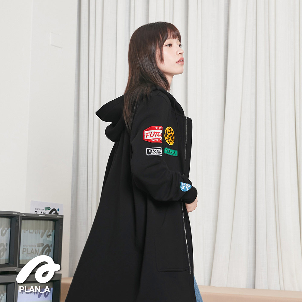 門襟採用拉鍊設計配合連帽,下擺弧形剪裁配上剛好的長度,視覺上更能拉長身形比例