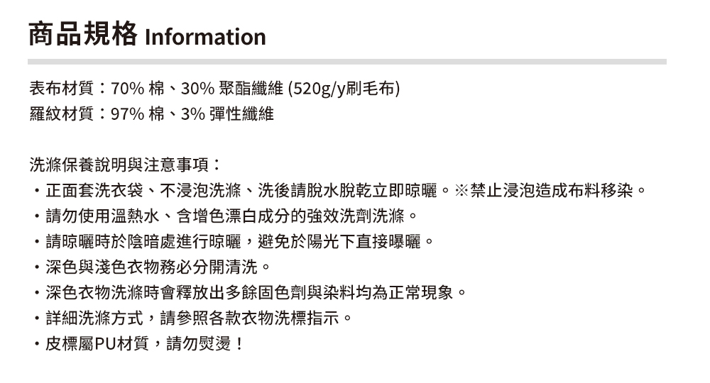 內裡刷毛的舒柔材質,增添穿著保暖度