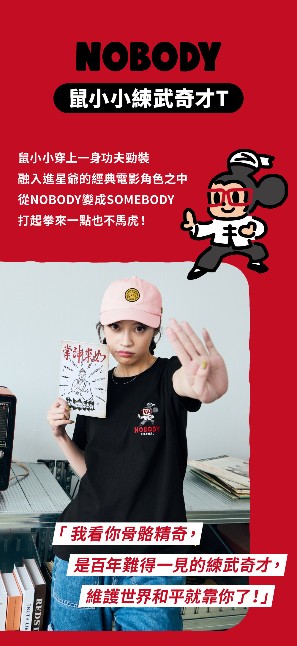 「靚仔,看你的骨骼精奇,是萬中無一的武學奇才,維護世界和平就靠你了。」遠方有一股能量在招喚著鼠小小…..。因此一身功夫勁裝,躍升為你我都熟知的那個SOMEBODY!