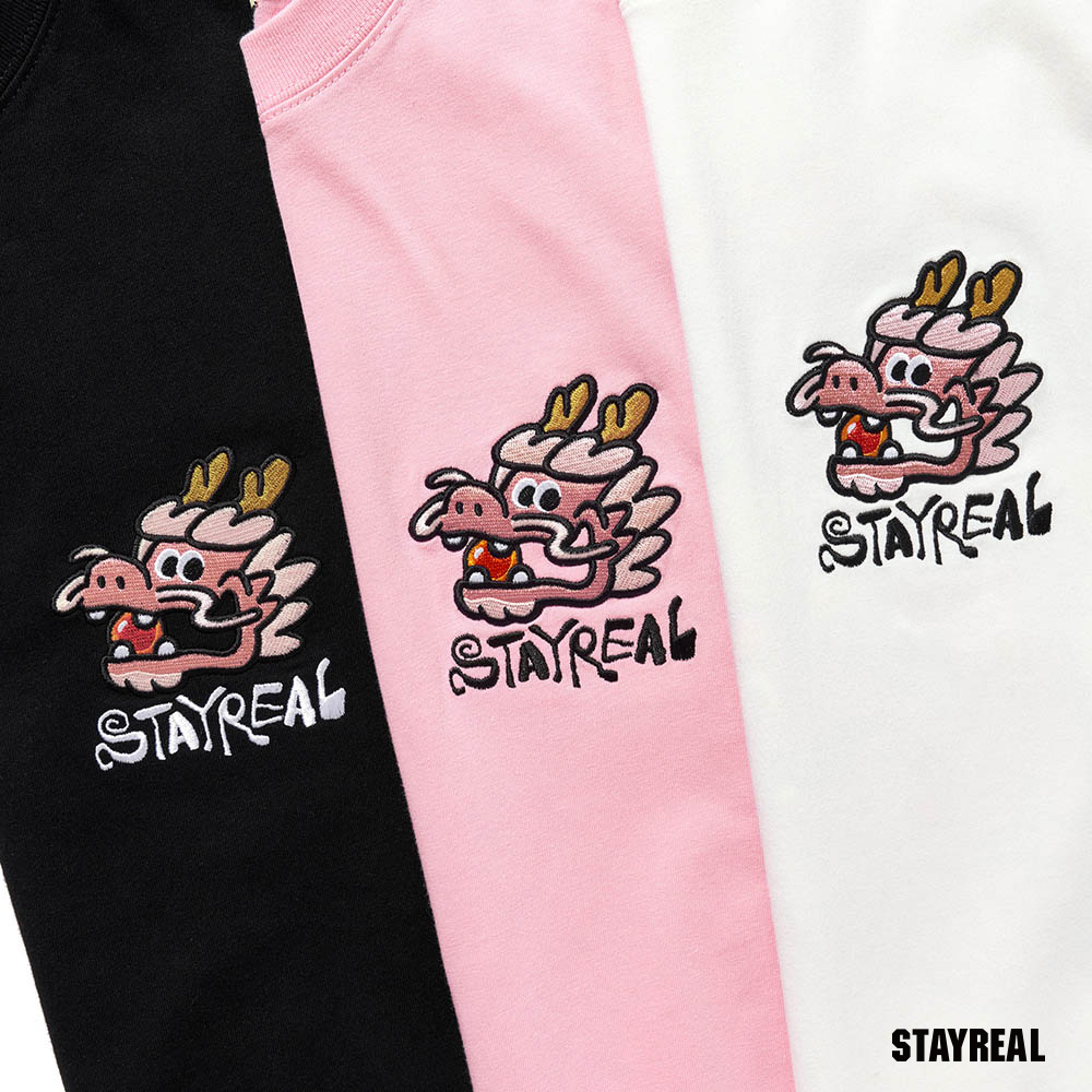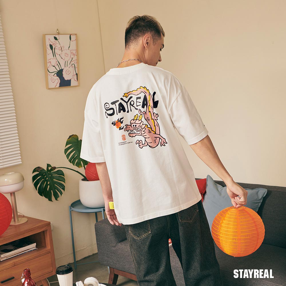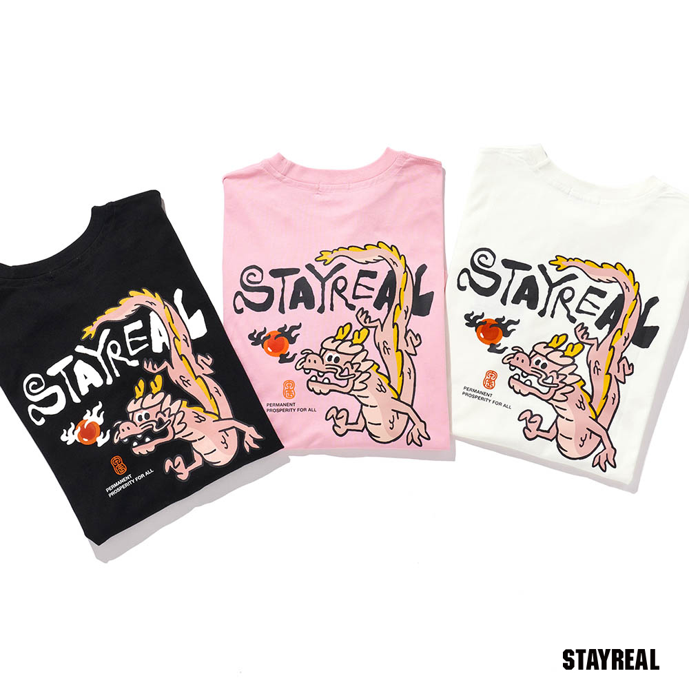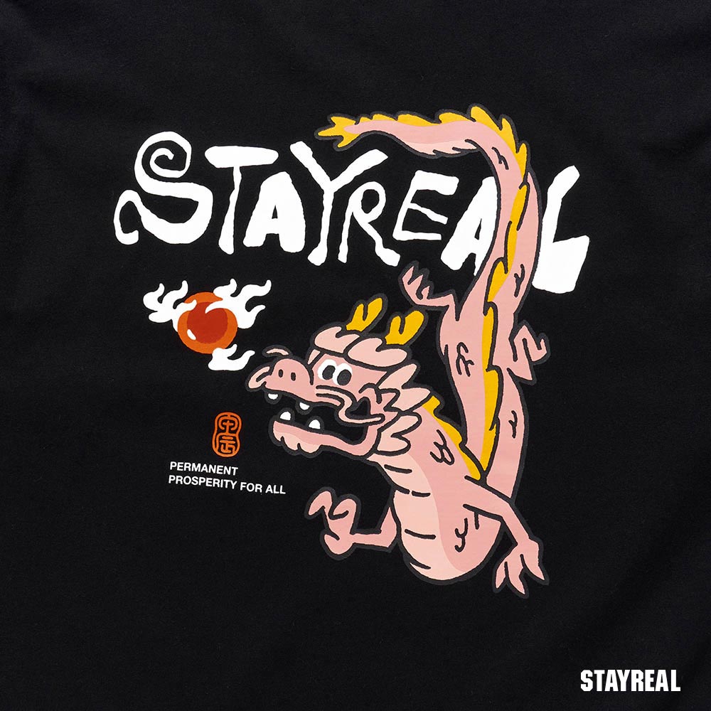 將極具中國風的祥龍戲珠(代表吉祥平安之意)的設計圖騰,融合進實下流行的潮流塗鴉文字Logo,演繹出獨具STAYREAL創意風格的開運龍系列商品