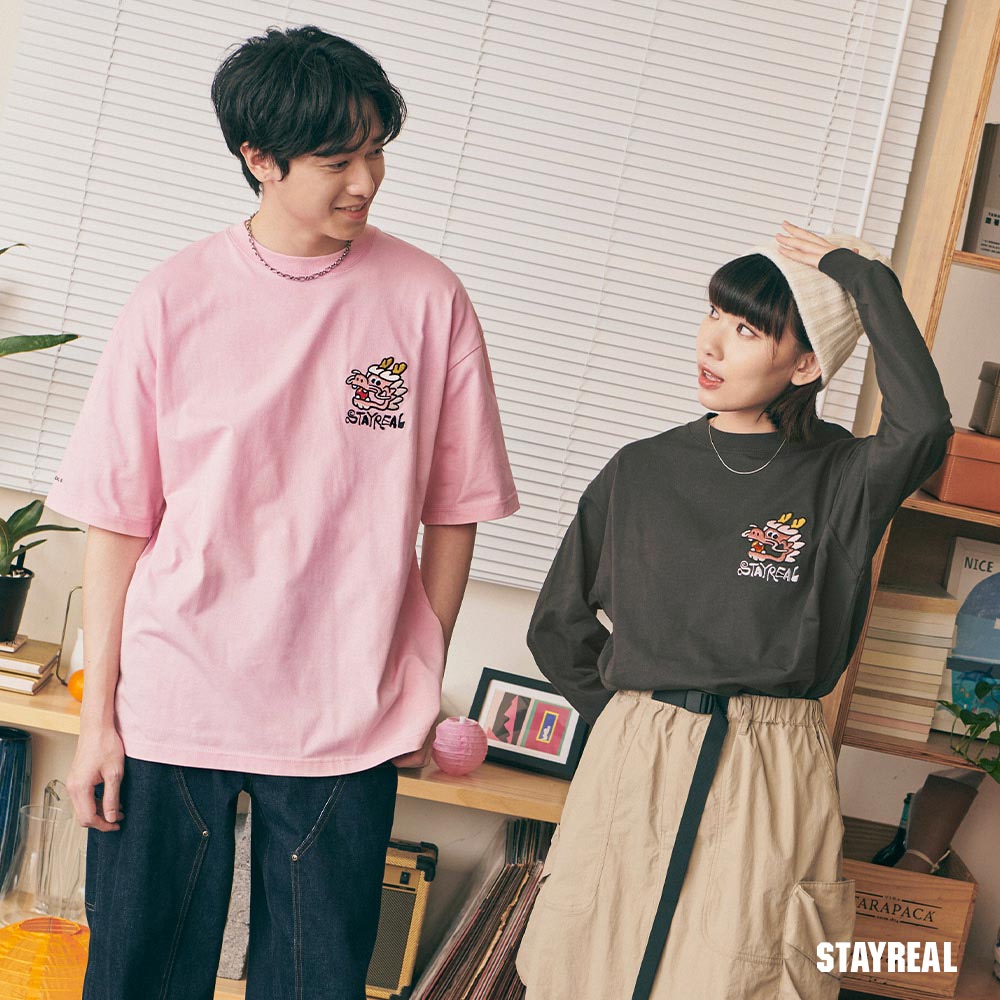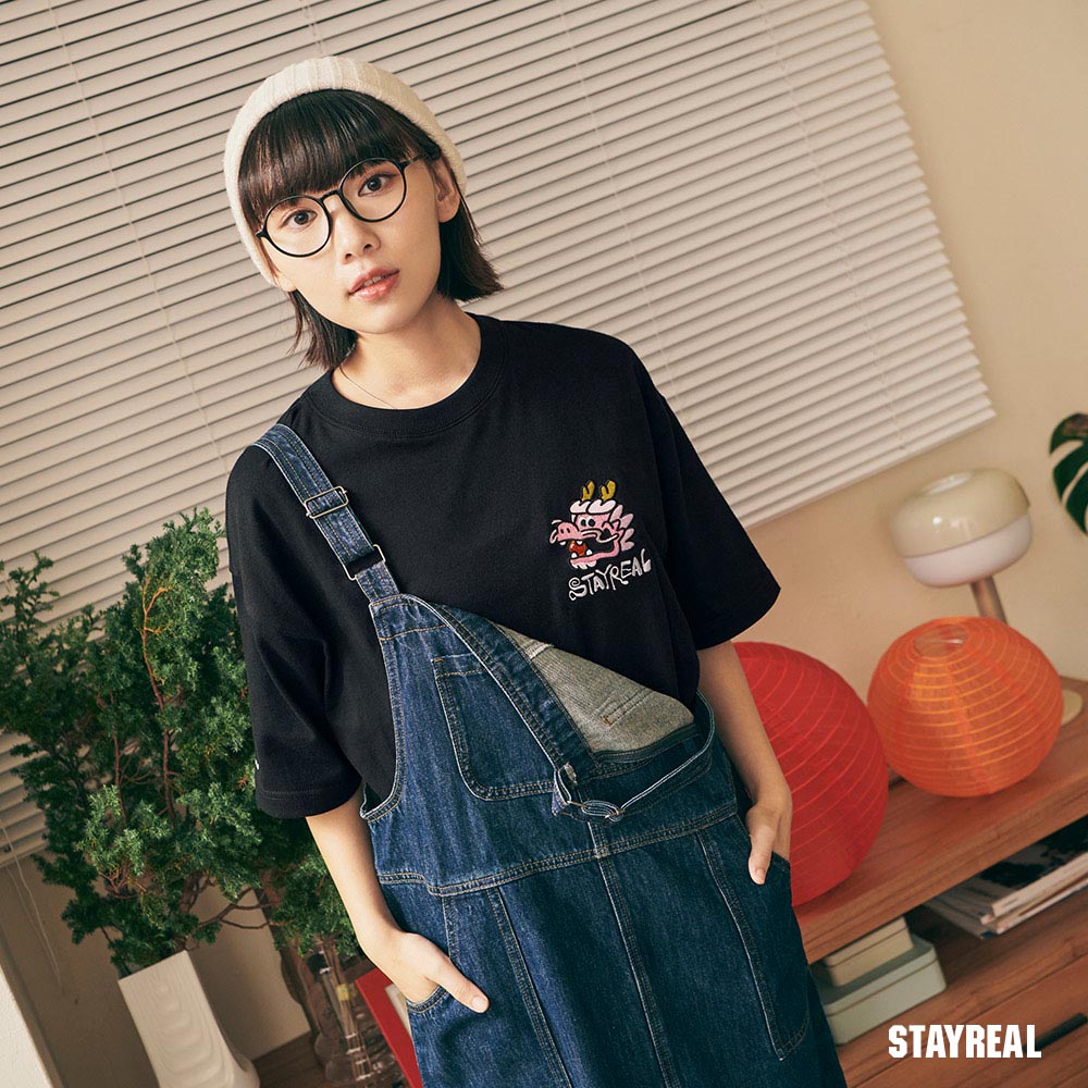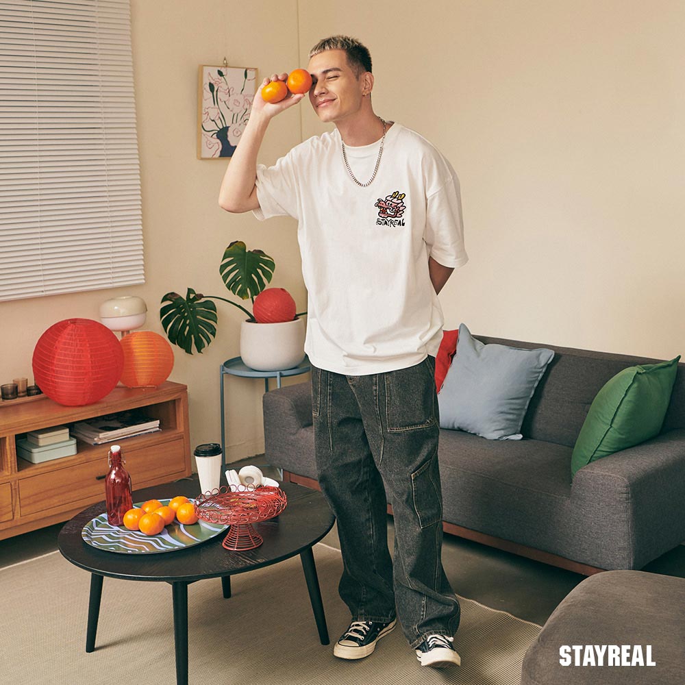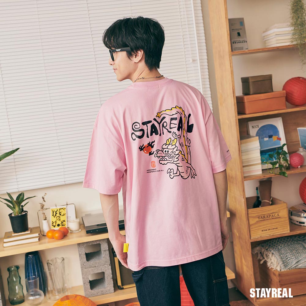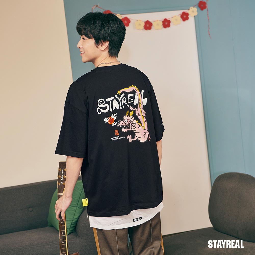 將極具中國風的祥龍戲珠(代表吉祥平安之意)的設計圖騰,融合進實下流行的潮流塗鴉文字Logo,演繹出獨具STAYREAL創意風格的開運龍系列商品