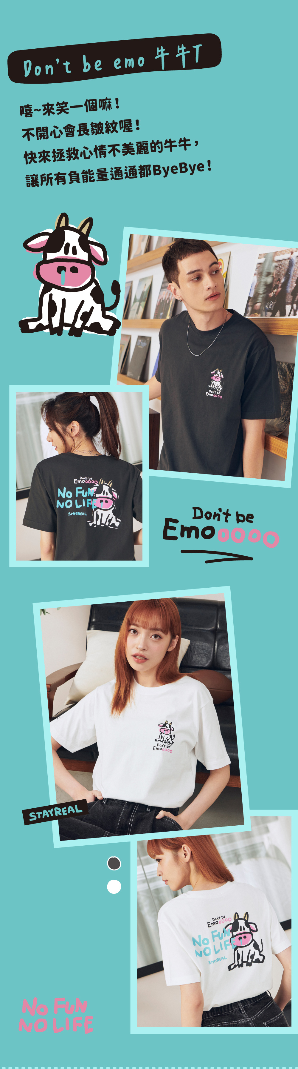 以 Don’t be “emo” = “e哞”的諧音趣味,創造出emo感十足的哀苦牛牛特色形象T