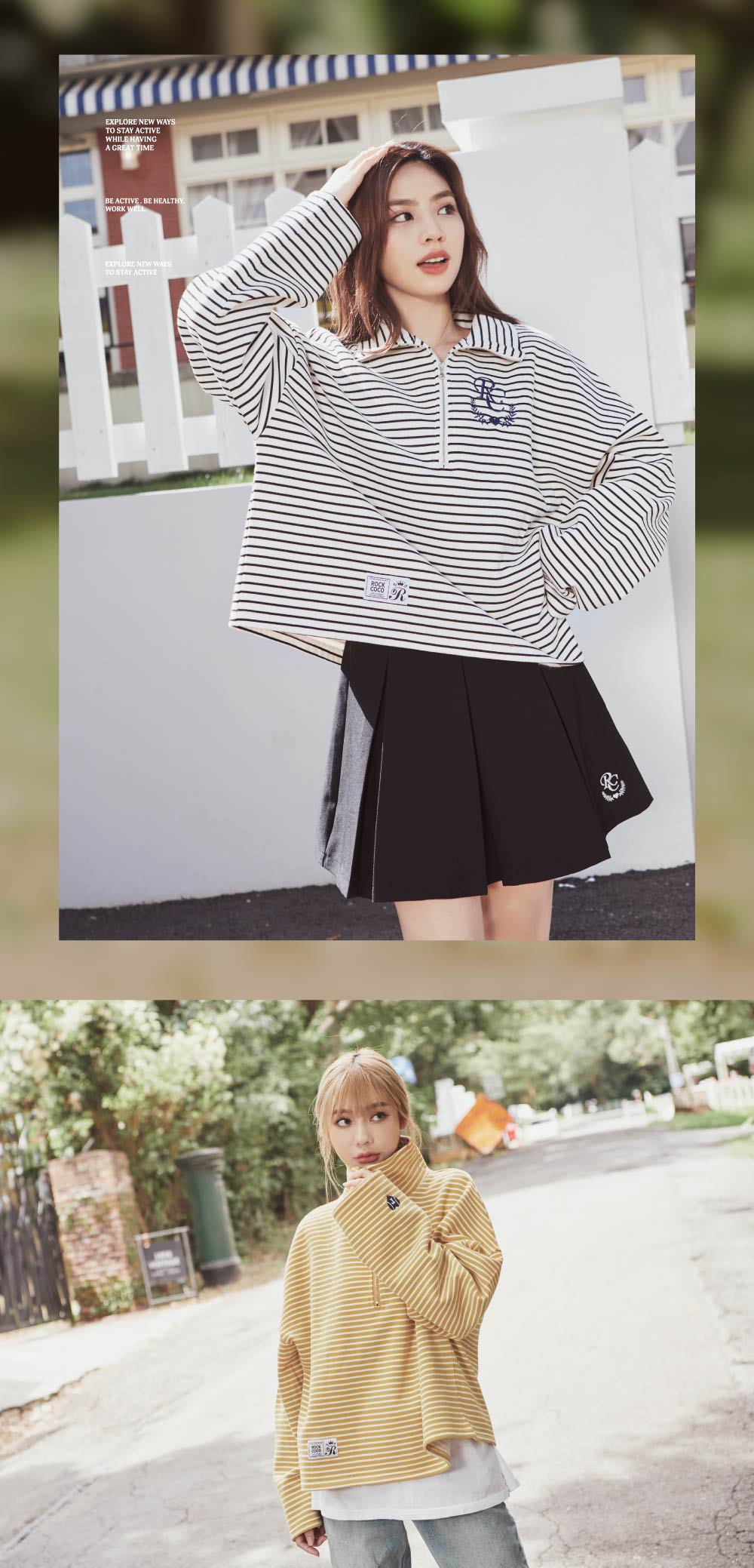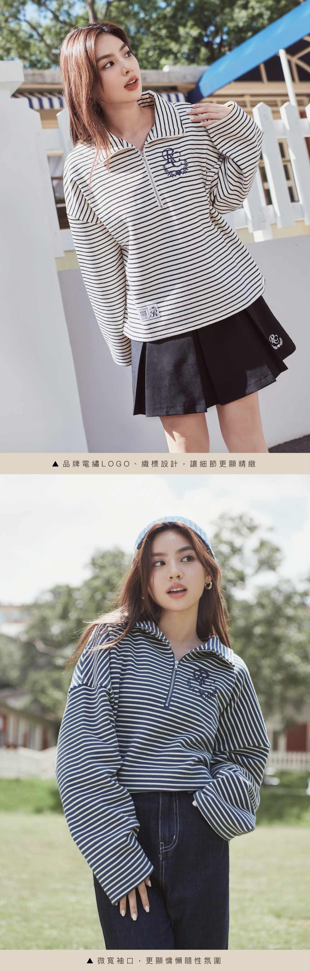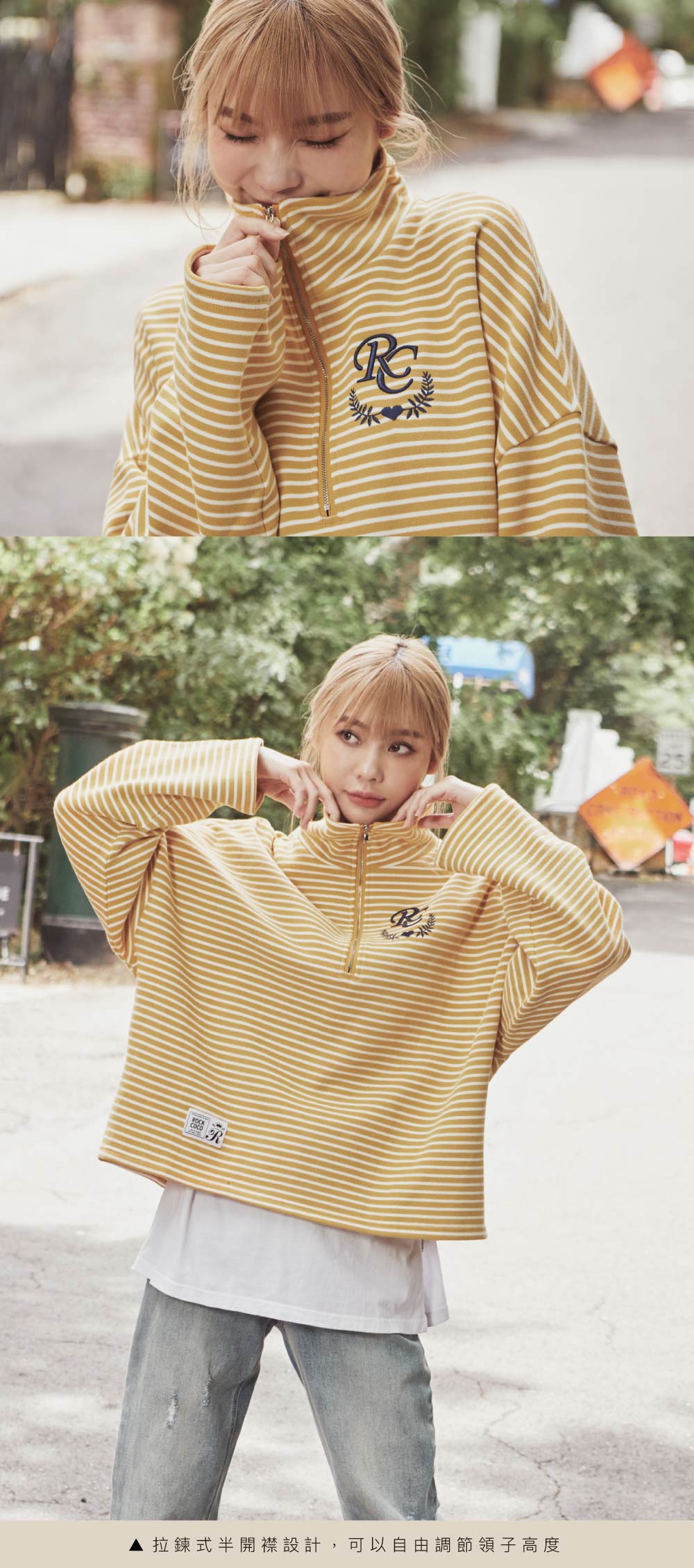 拉鍊式半開襟設計,可以自由調節領子高度,半拉露出脖子線條更修飾臉形,天氣轉冷也可整個拉起當高領上衣,亦可內搭薄高領T穿出多層式造型,一衣就能打造多種風貌!簡約的條紋設計搭配精緻小巧的品牌LOGO電繡、織標,細節度滿滿,落在腰際的衣長與寬鬆剪裁,輕鬆穿出好比例!