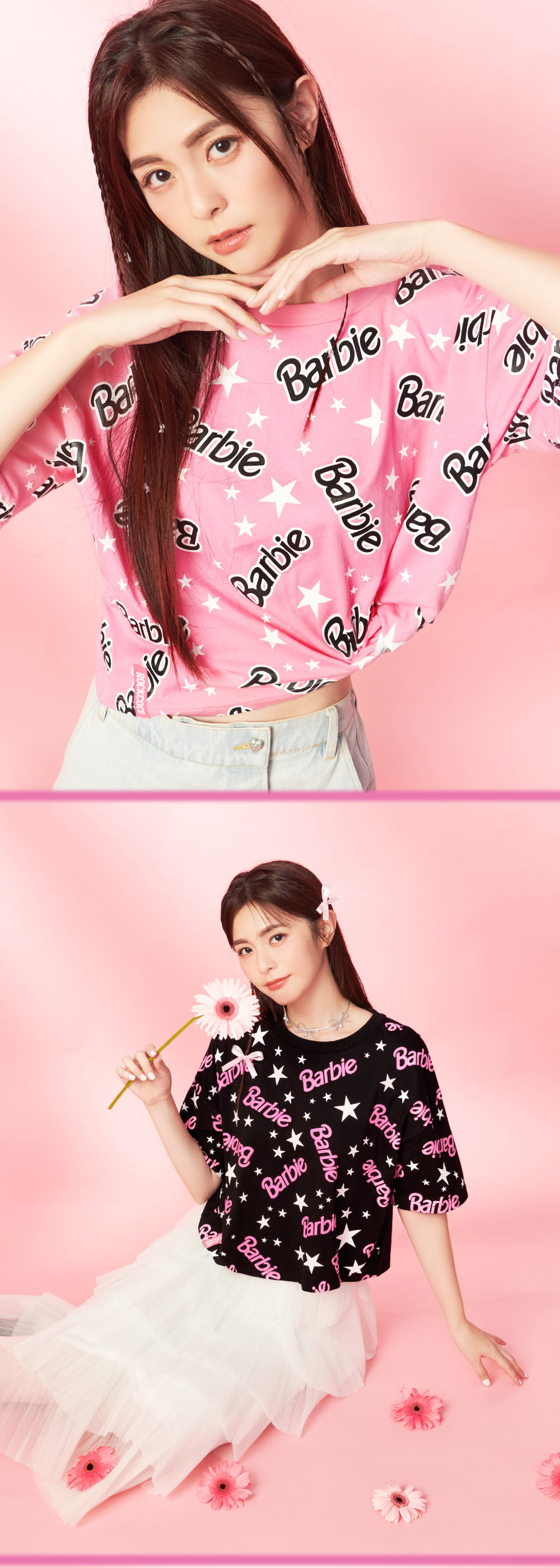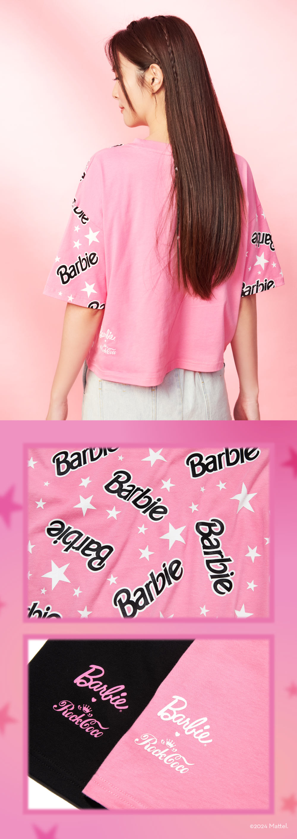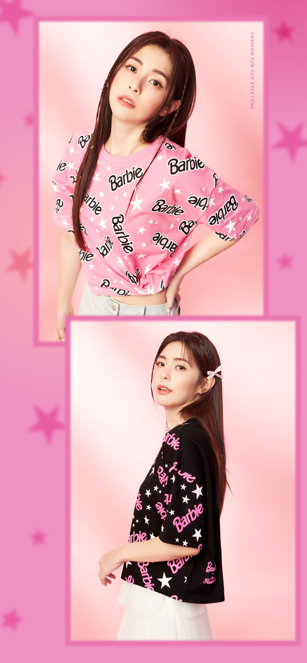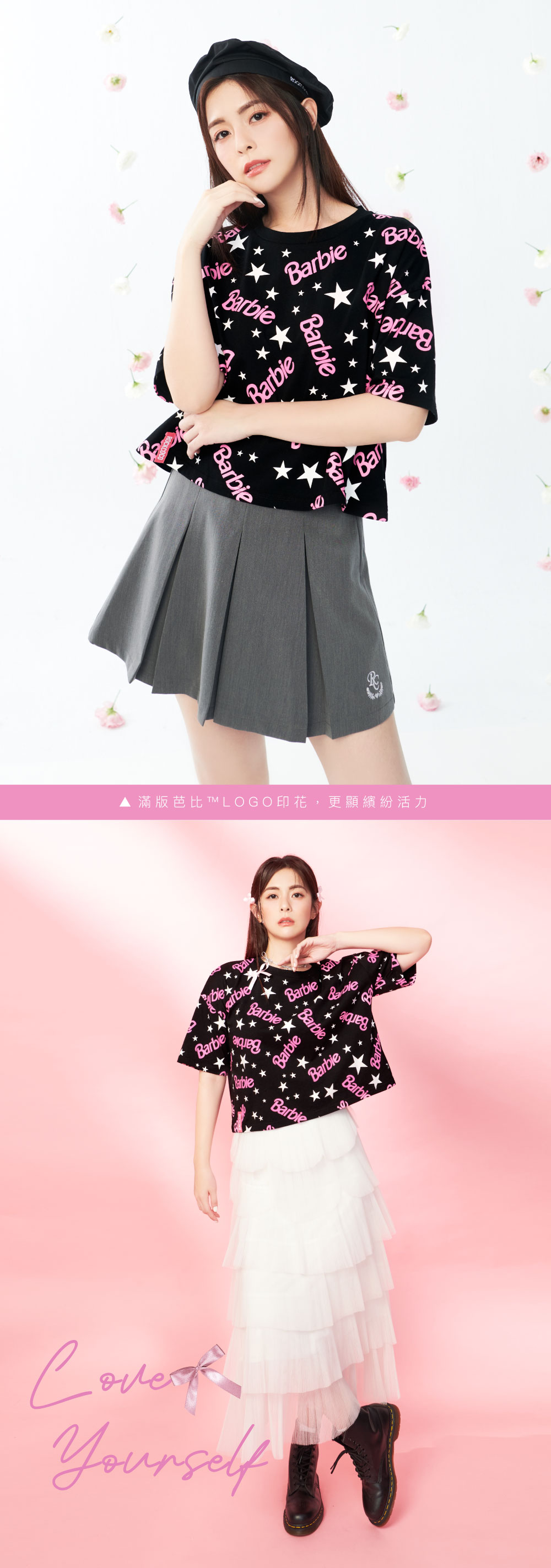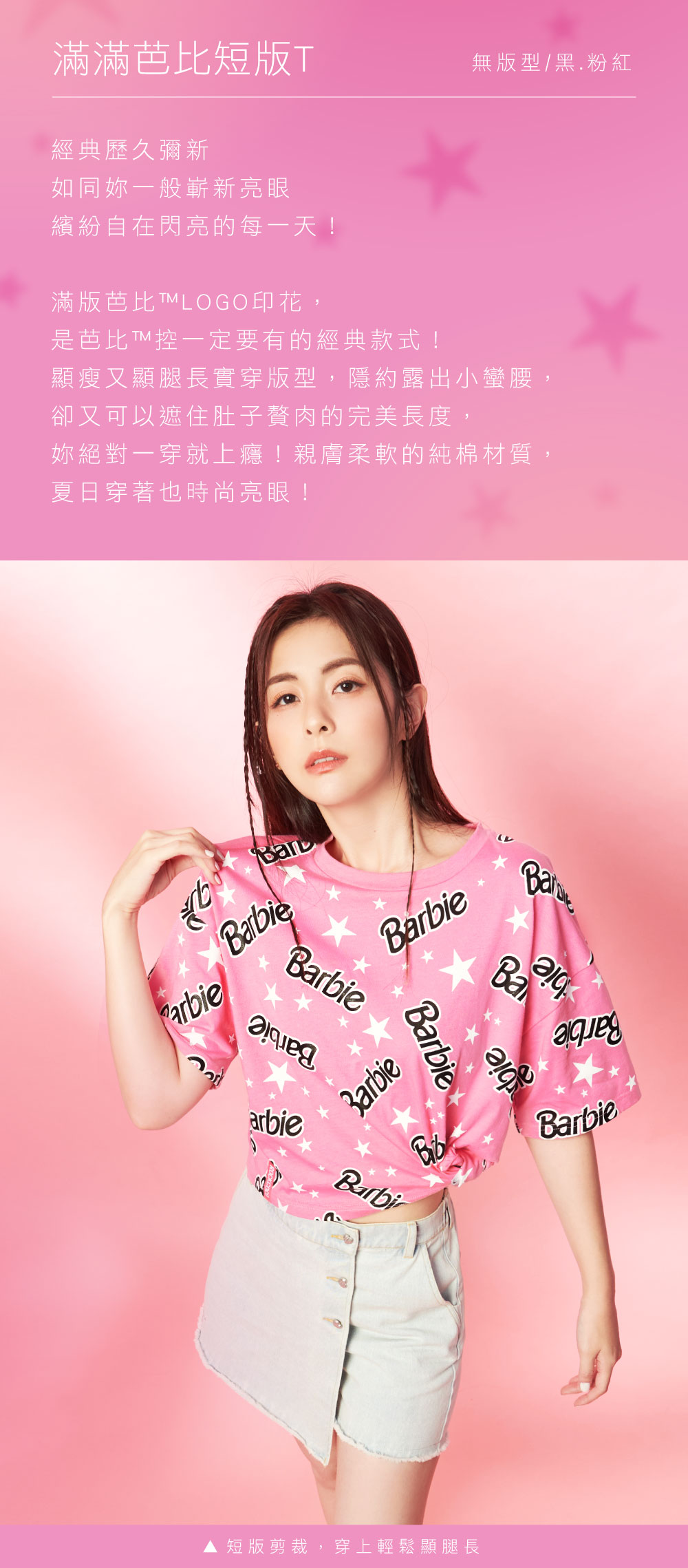 滿版芭比LOGO印花,是芭比控一定要有的經典款式!顯瘦又顯腿長實穿版型,隱約露出小蠻腰,卻又可以遮住肚子贅肉的完美長度,妳絕對一穿就上癮!親膚柔軟的純棉材質,夏日穿著也時尚亮眼