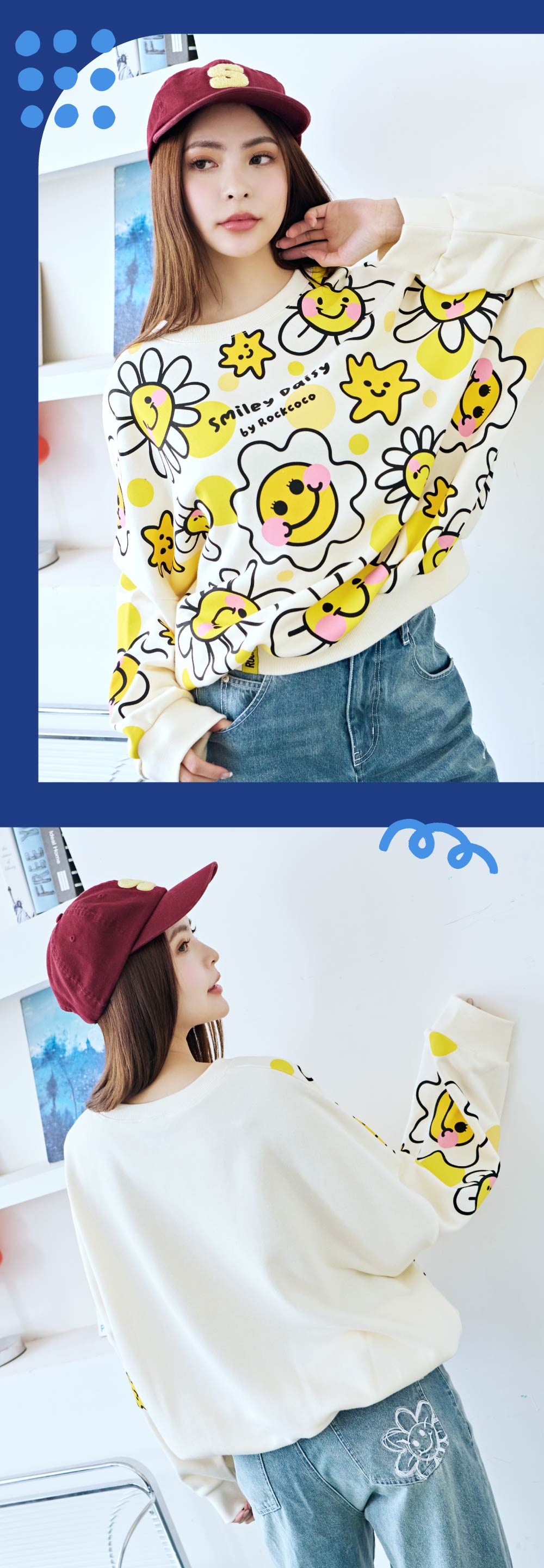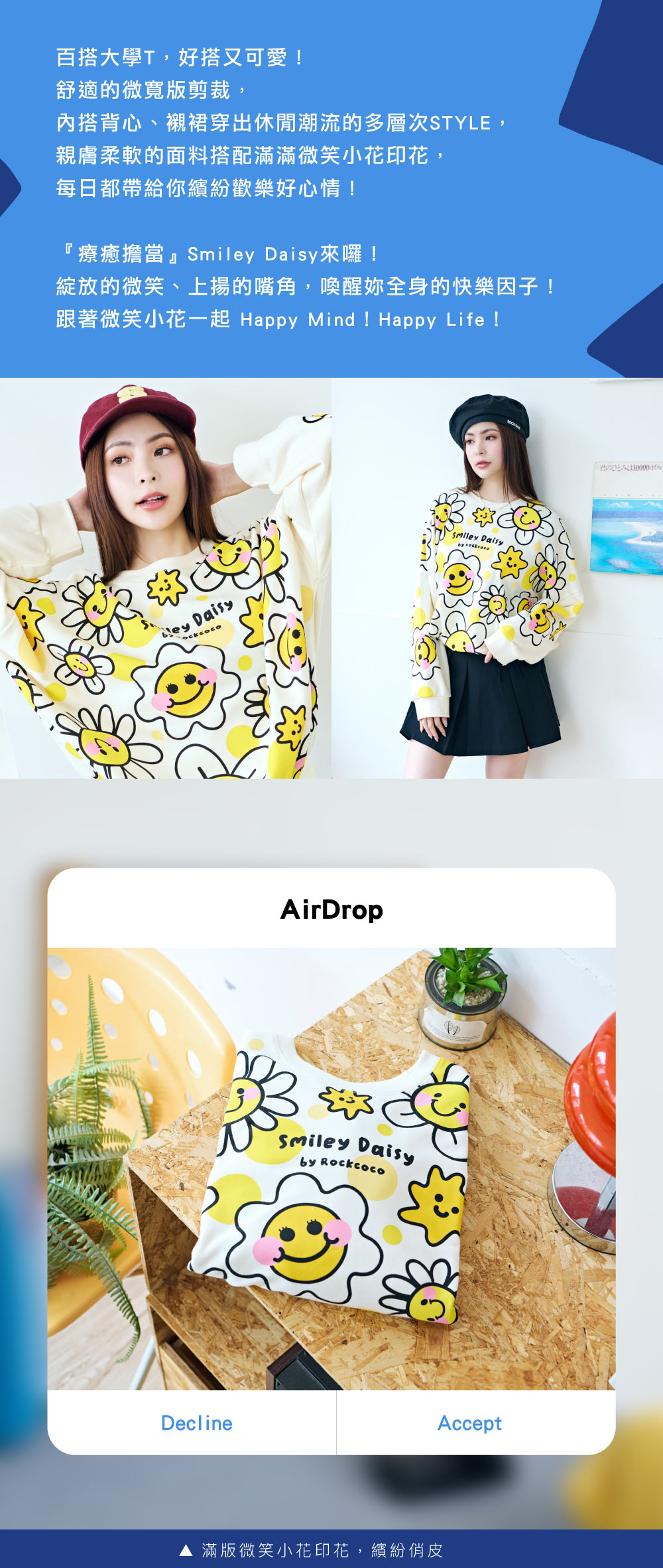 舒適的微寬版剪裁,內搭背心、襯裙穿出休閒潮流的多層次STYLE,親膚柔軟的面料搭配滿滿微笑小花印花,每日都帶給你繽紛歡樂好心情!