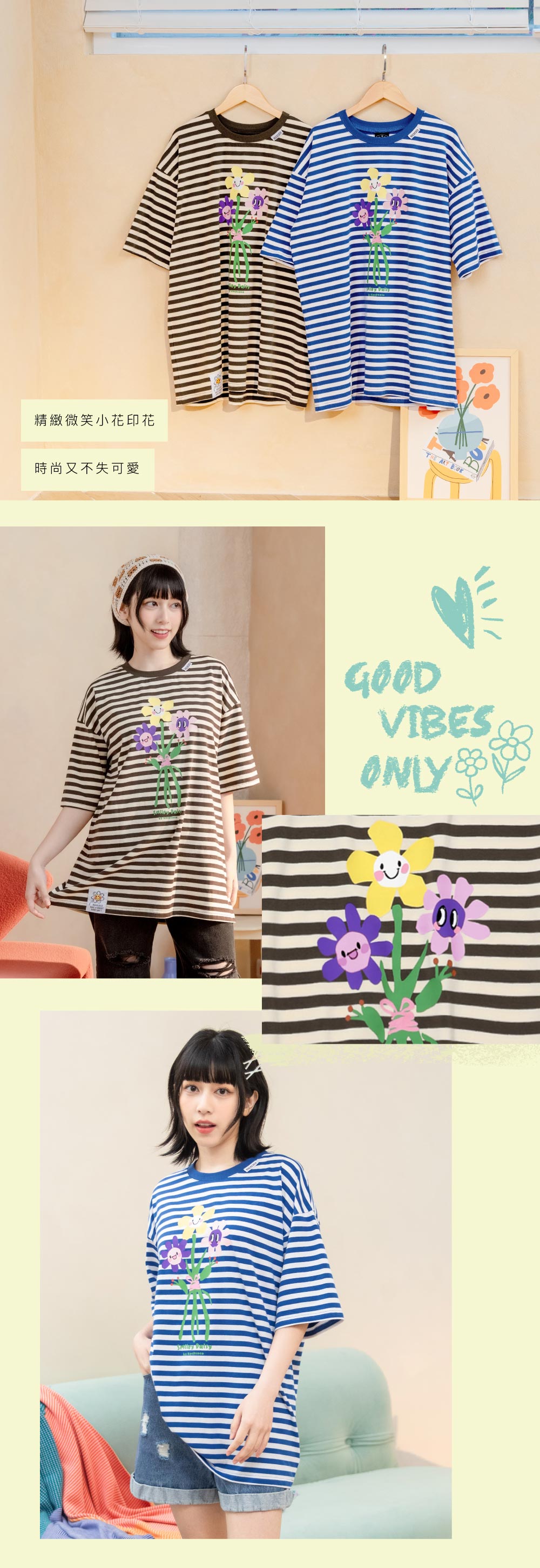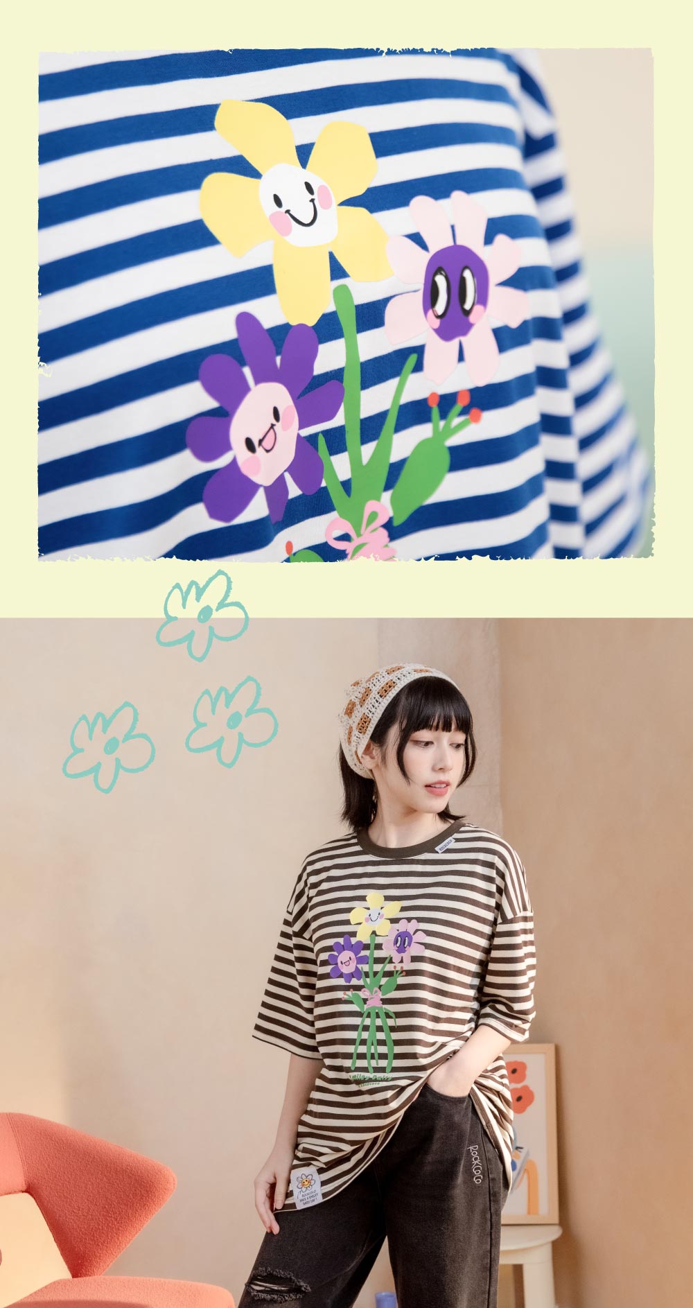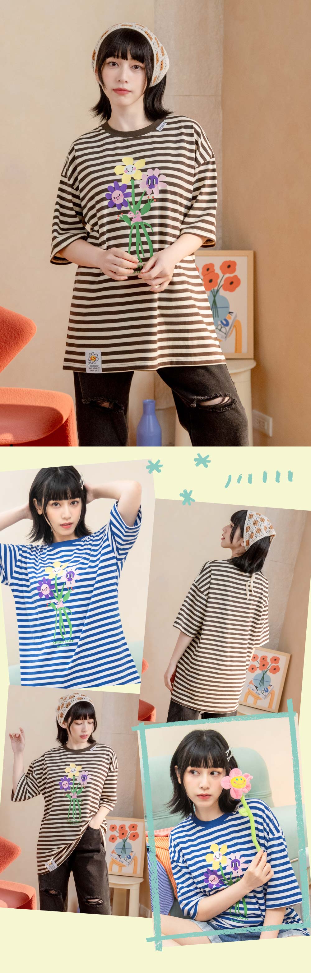 單色細條紋搭配插畫風小花束設計感,穿出率性休閒與時尚知性,清新藍、氣質咖兩種色調,陪妳迎接活力滿滿的每一天