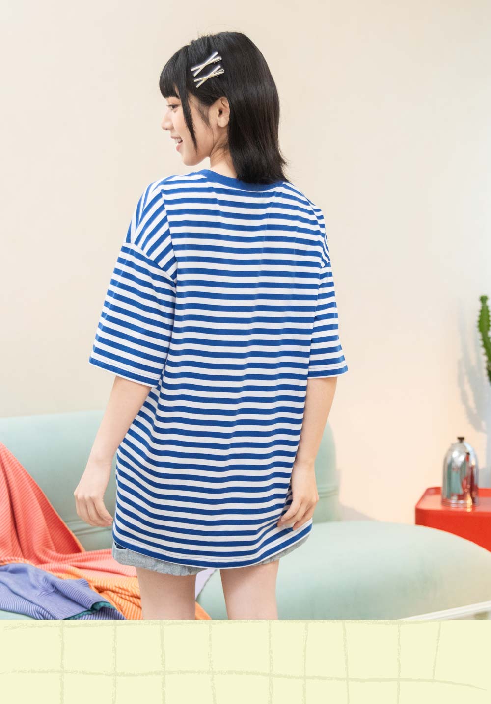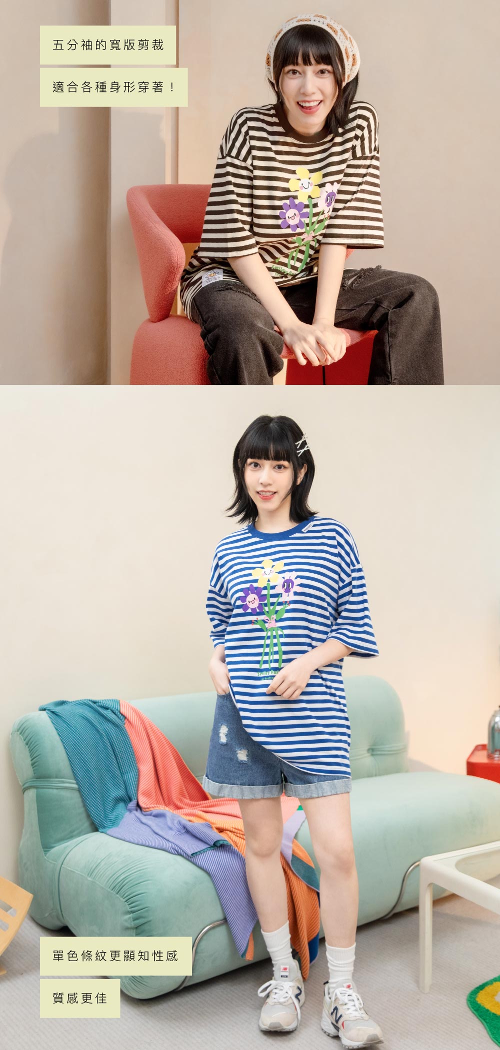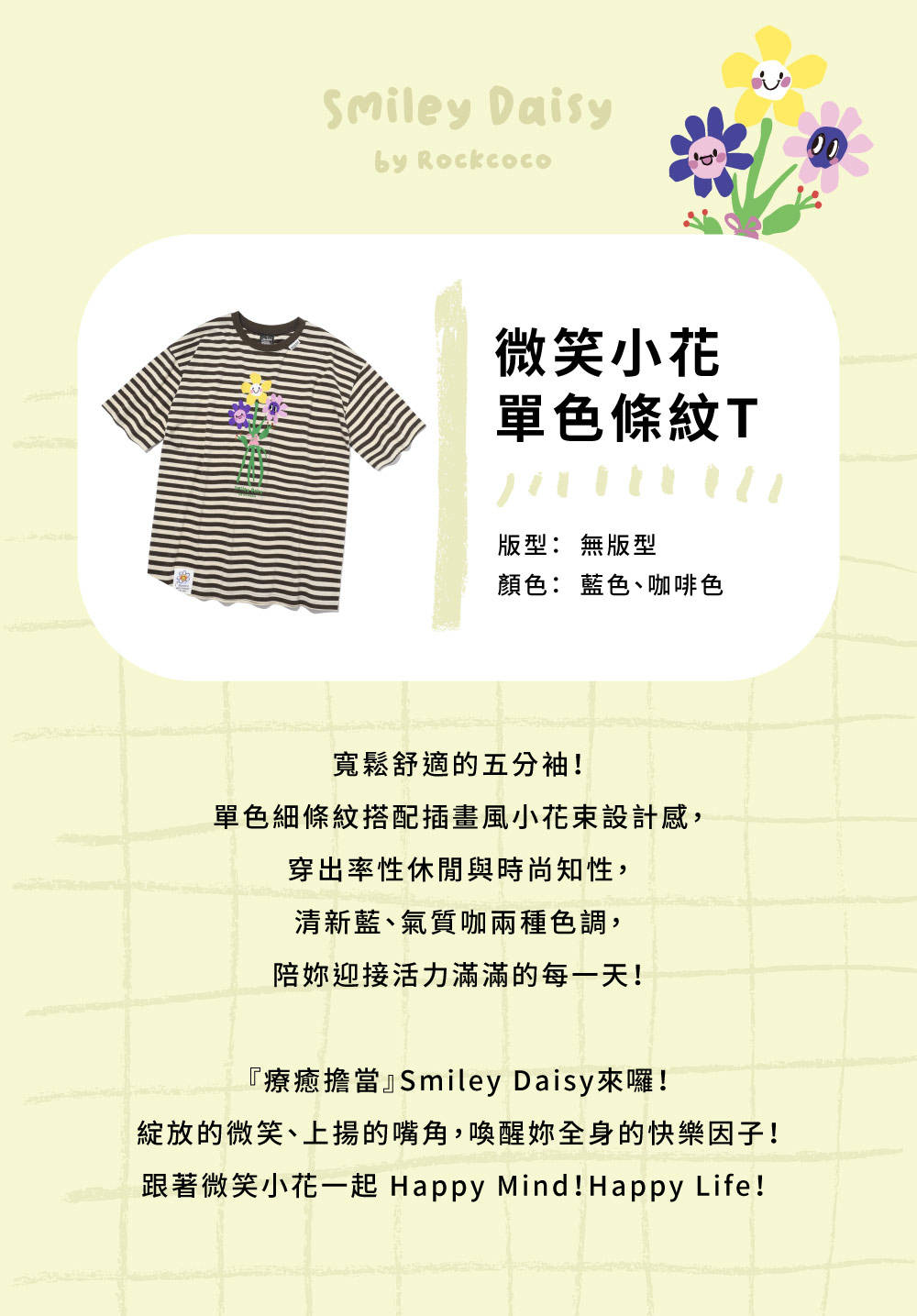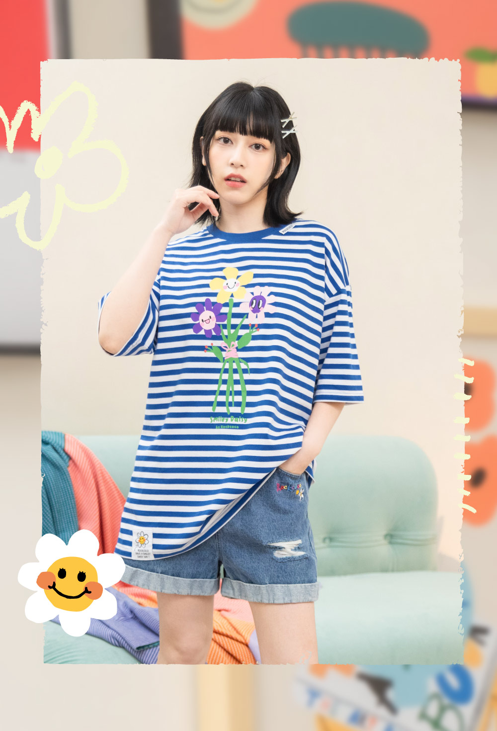 單色細條紋搭配插畫風小花束設計感,穿出率性休閒與時尚知性,清新藍、氣質咖兩種色調,陪妳迎接活力滿滿的每一天