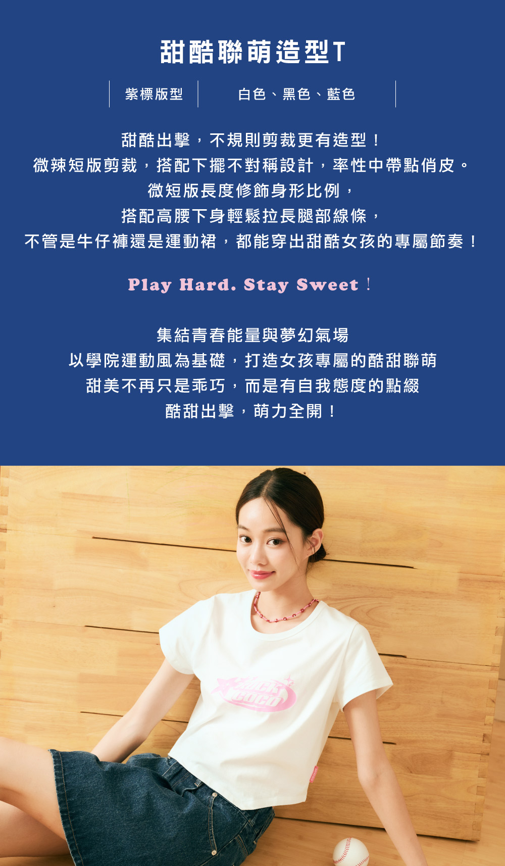 微辣短版剪裁,搭配下擺不對稱設計,率性中帶點俏皮。微短版長度修飾身形比例,搭配高腰下身輕鬆拉長腿部線條,不管是牛仔褲還是運動裙,都能穿出甜酷女孩的專屬節奏