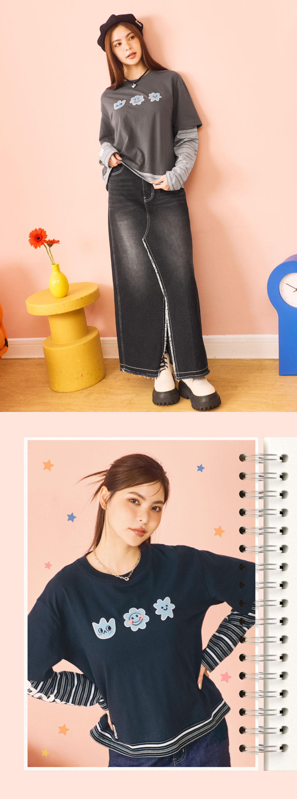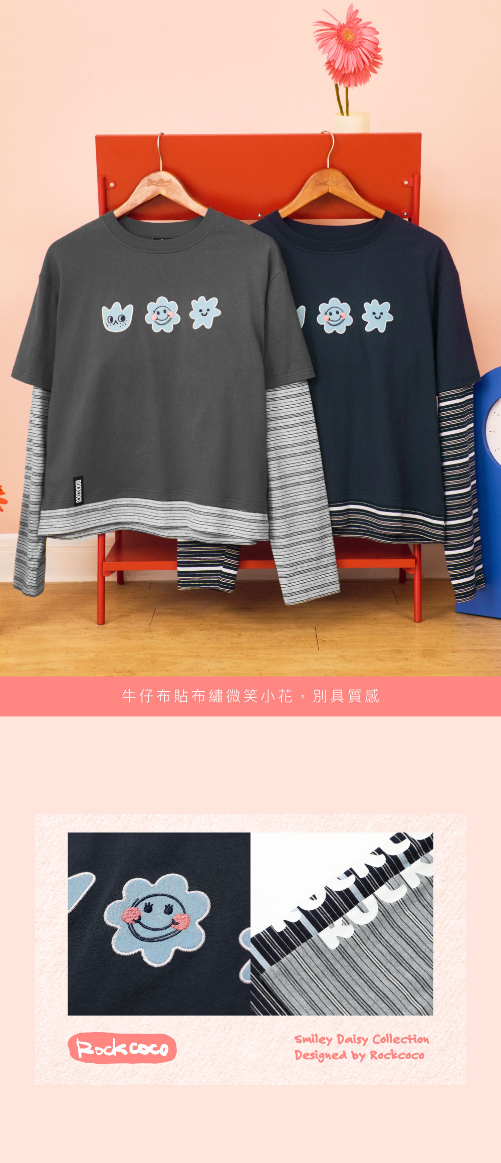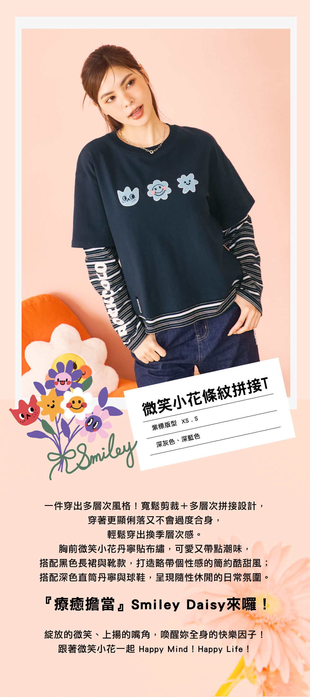 寬鬆剪裁+多層次拼接設計,穿著更顯俐落又不會過度合身,輕鬆穿出換季層次感。胸前微笑小花丹寧貼布繡,可愛又帶點潮味,搭配黑色長裙與靴款,打造略帶個性感的簡約酷甜風;搭配深色直筒丹寧與球鞋,呈現隨性休閒的日常氛圍