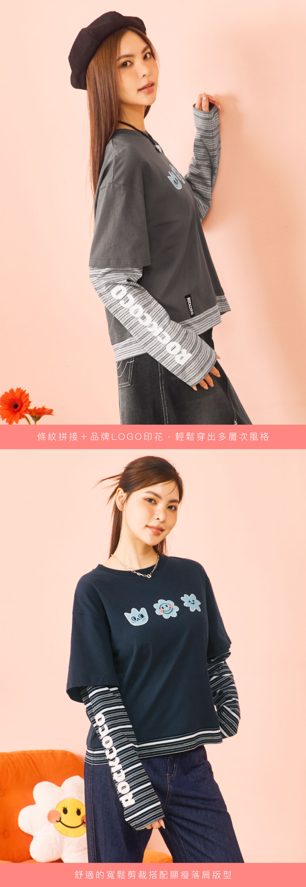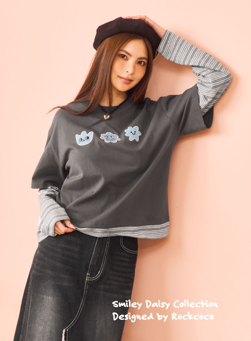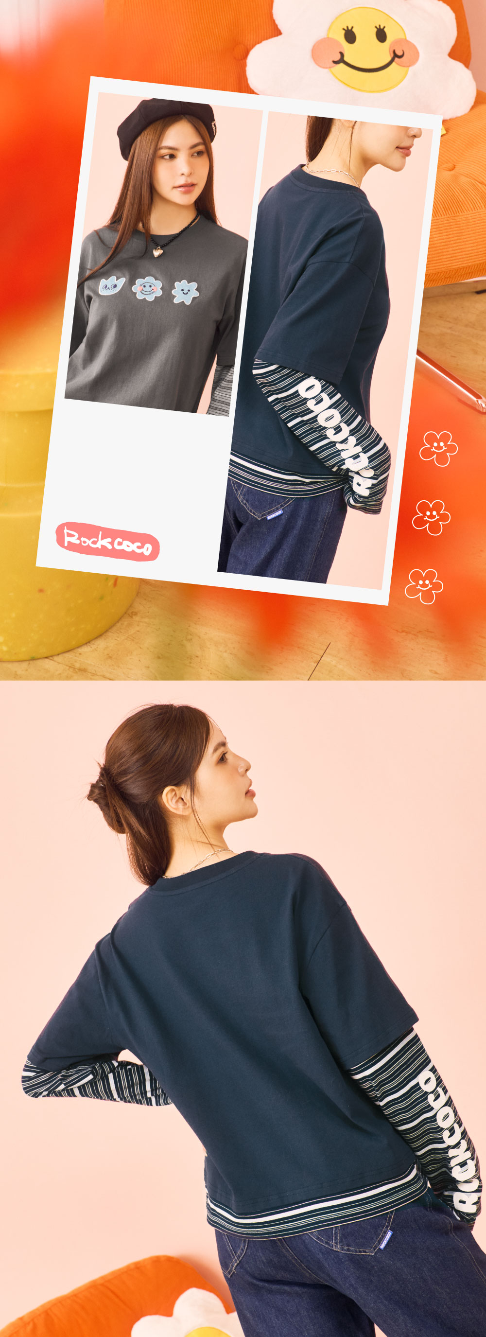 寬鬆剪裁+多層次拼接設計,穿著更顯俐落又不會過度合身,輕鬆穿出換季層次感。胸前微笑小花丹寧貼布繡,可愛又帶點潮味,搭配黑色長裙與靴款,打造略帶個性感的簡約酷甜風;搭配深色直筒丹寧與球鞋,呈現隨性休閒的日常氛圍