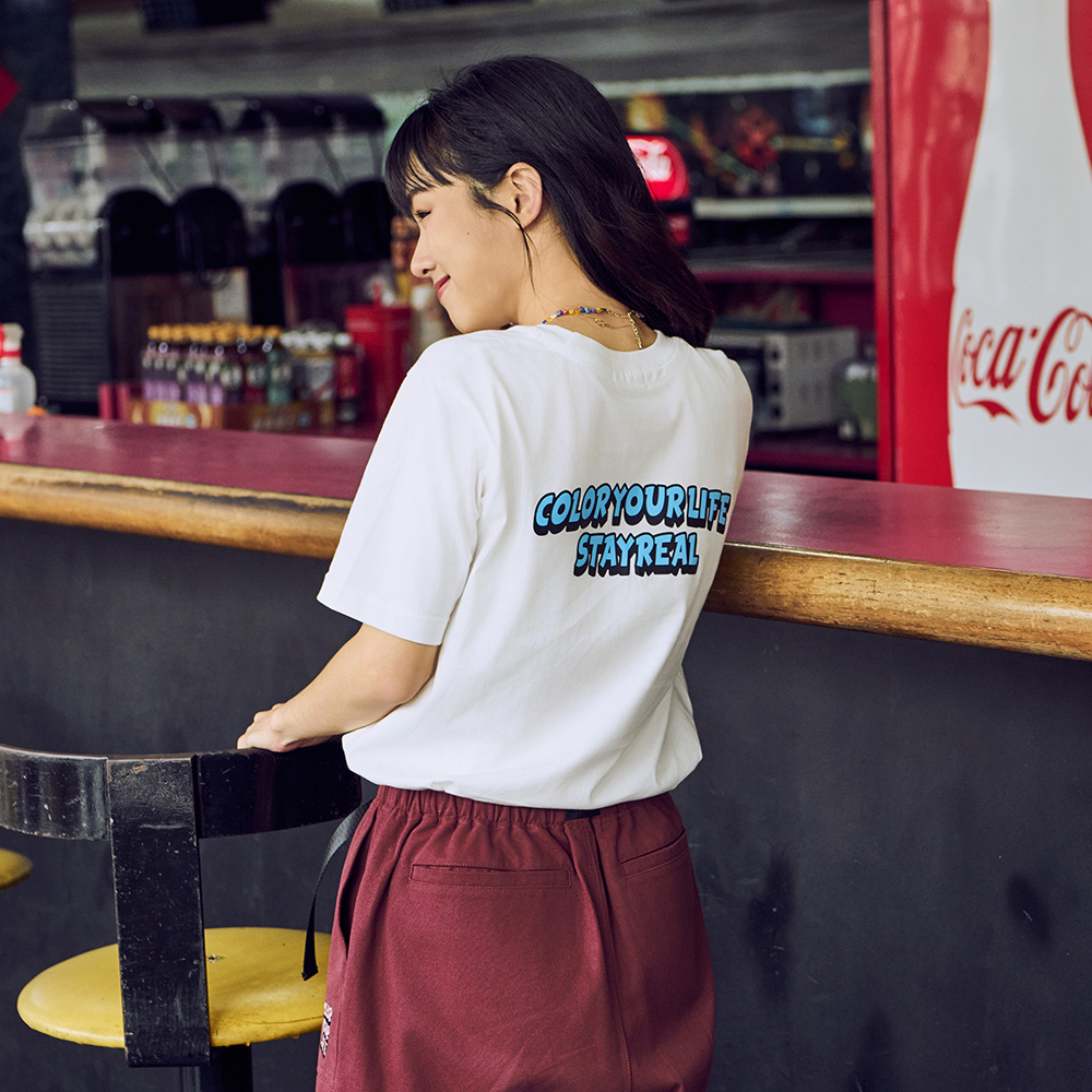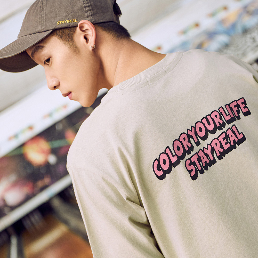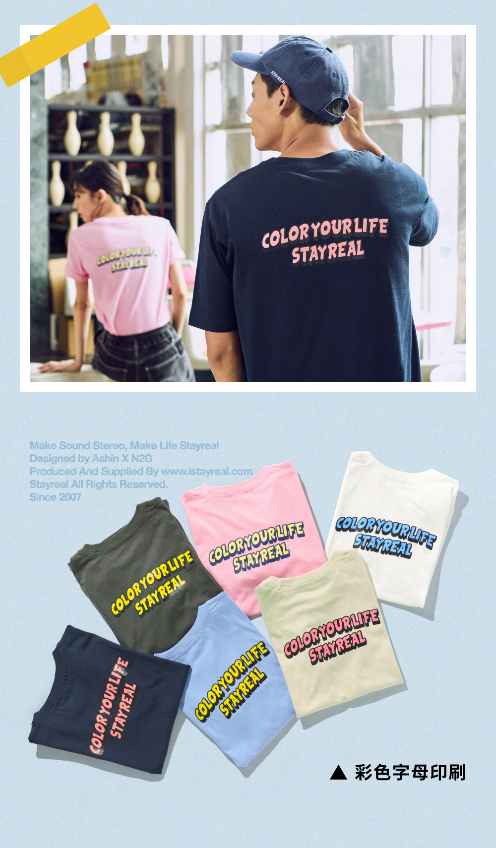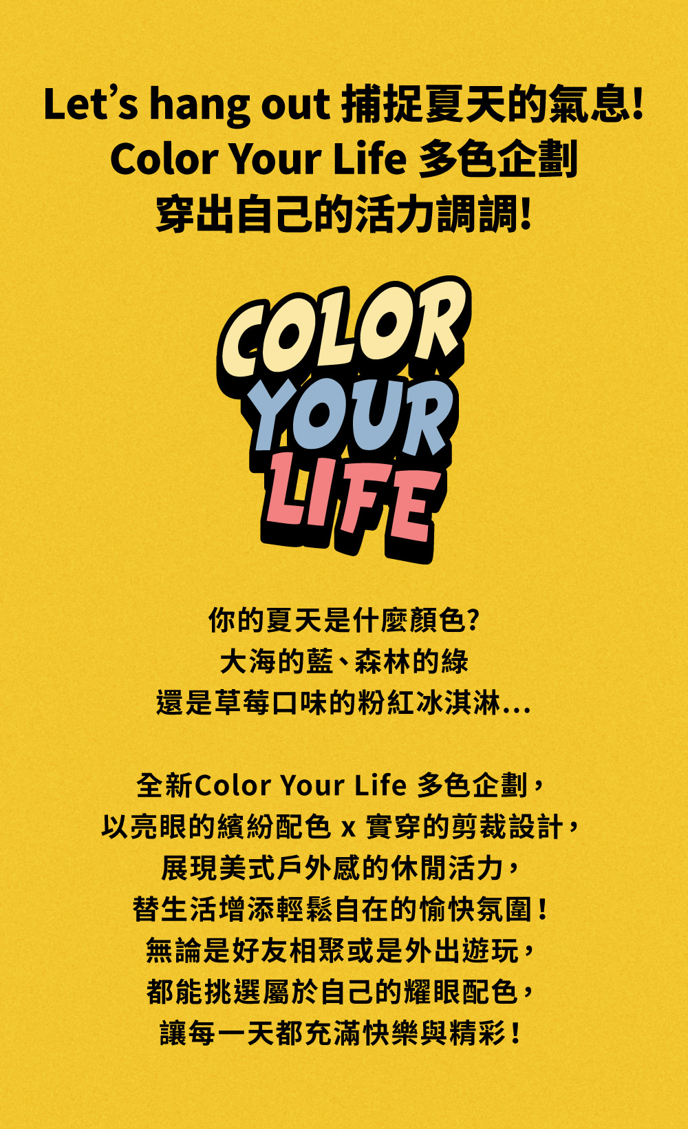 後背弧形Color Your Life雙色標語印刷透過跳色手法呈現,令人感受多色系列色彩氛圍感