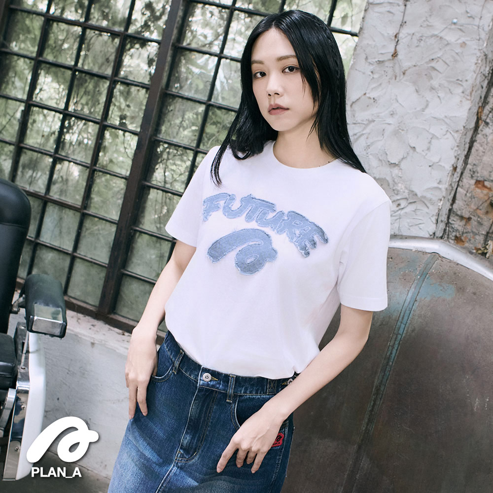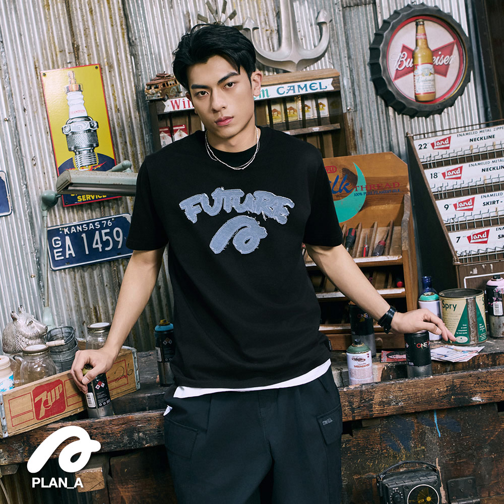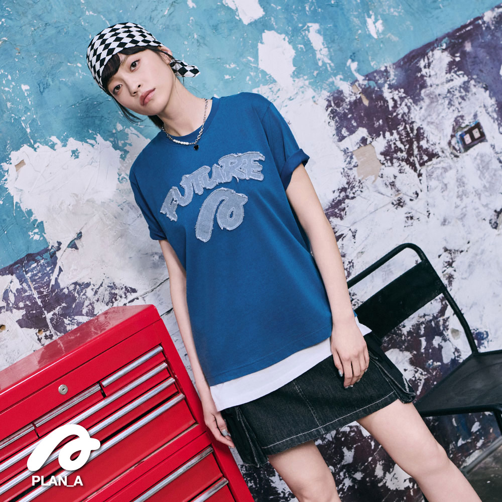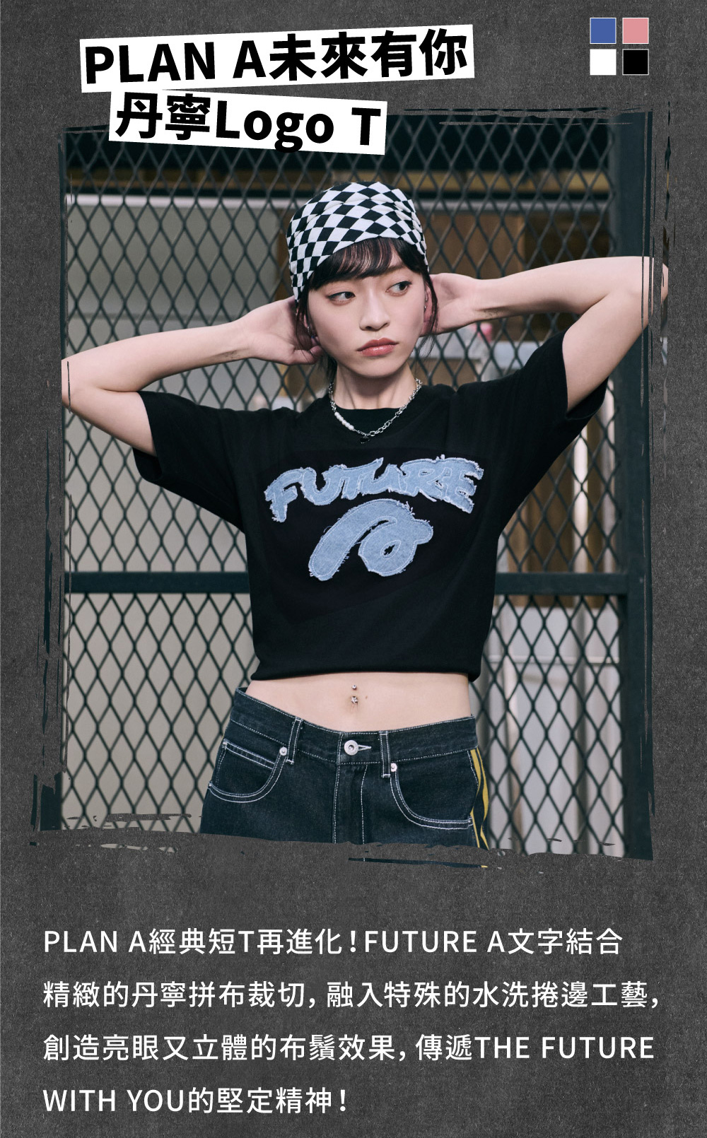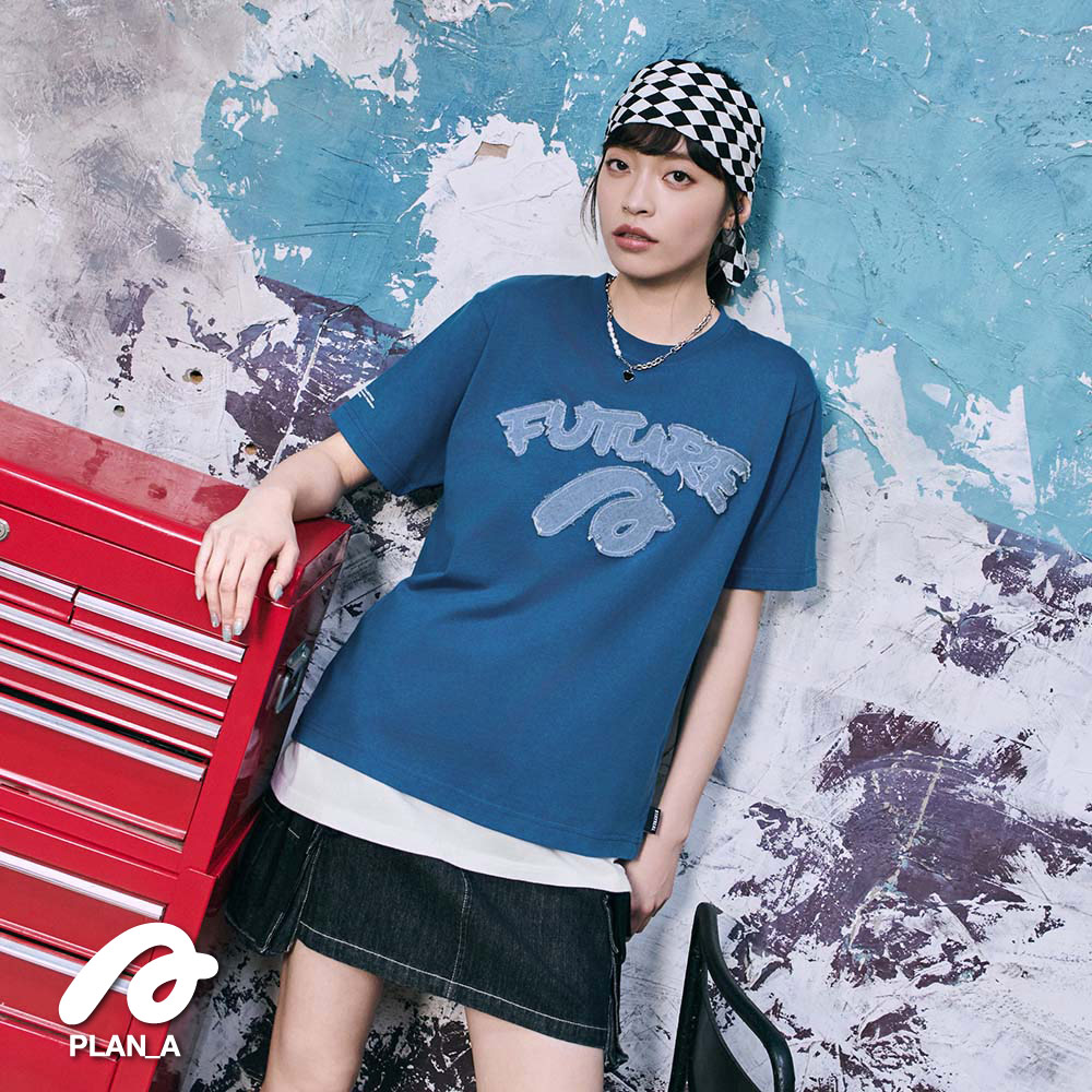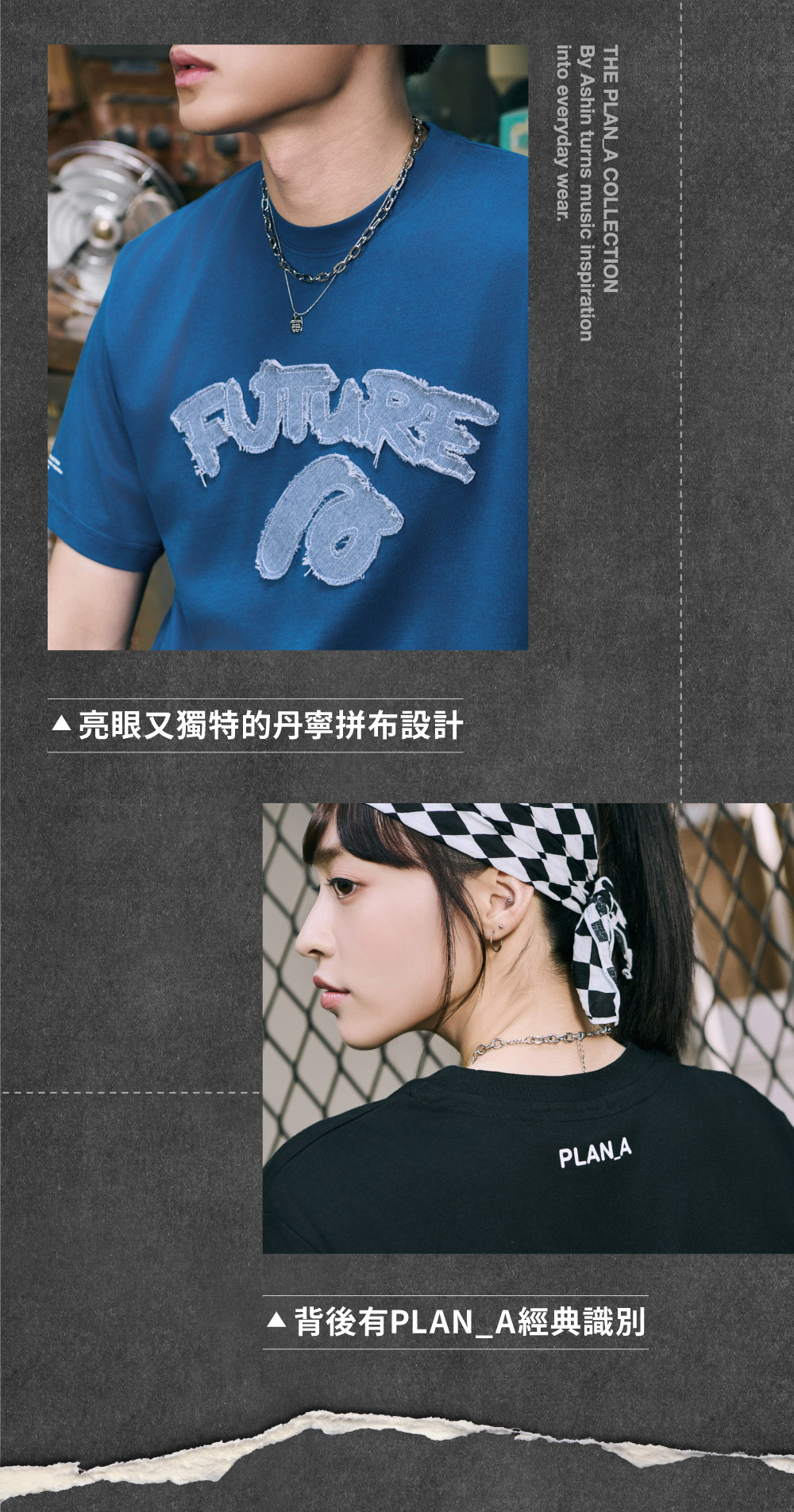 FUTURE A的丹寧拼布設計,呈現特殊水洗的布鬚工藝巧思!是每年春夏PLAN A 必推出的經典LOGO T的進化再升級版