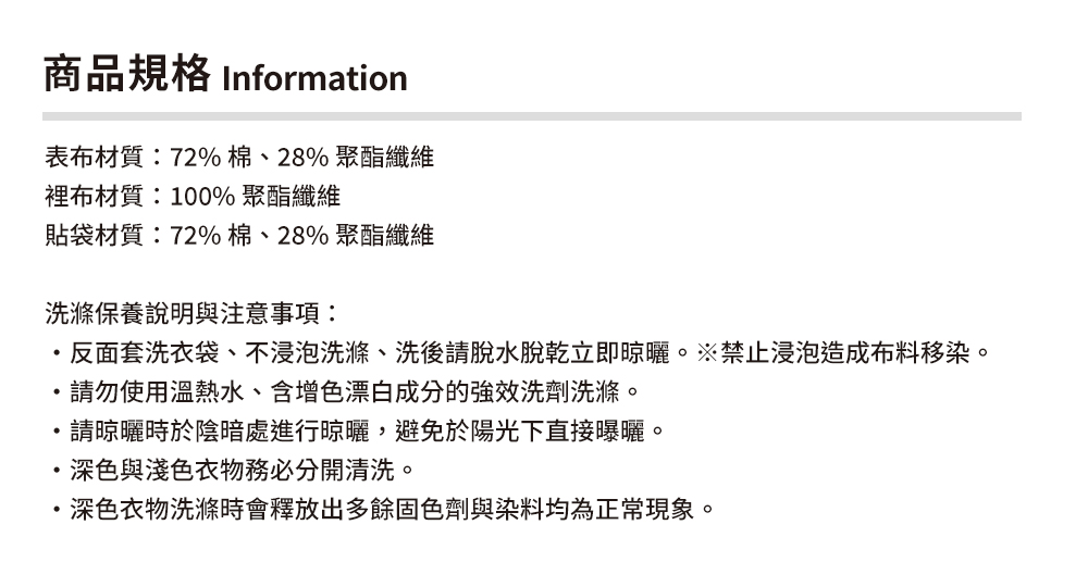 72%棉+28%聚酯纖維,面料舒適柔軟、同時具有挺度