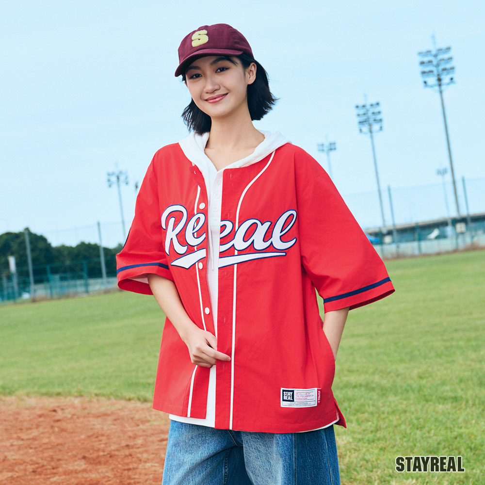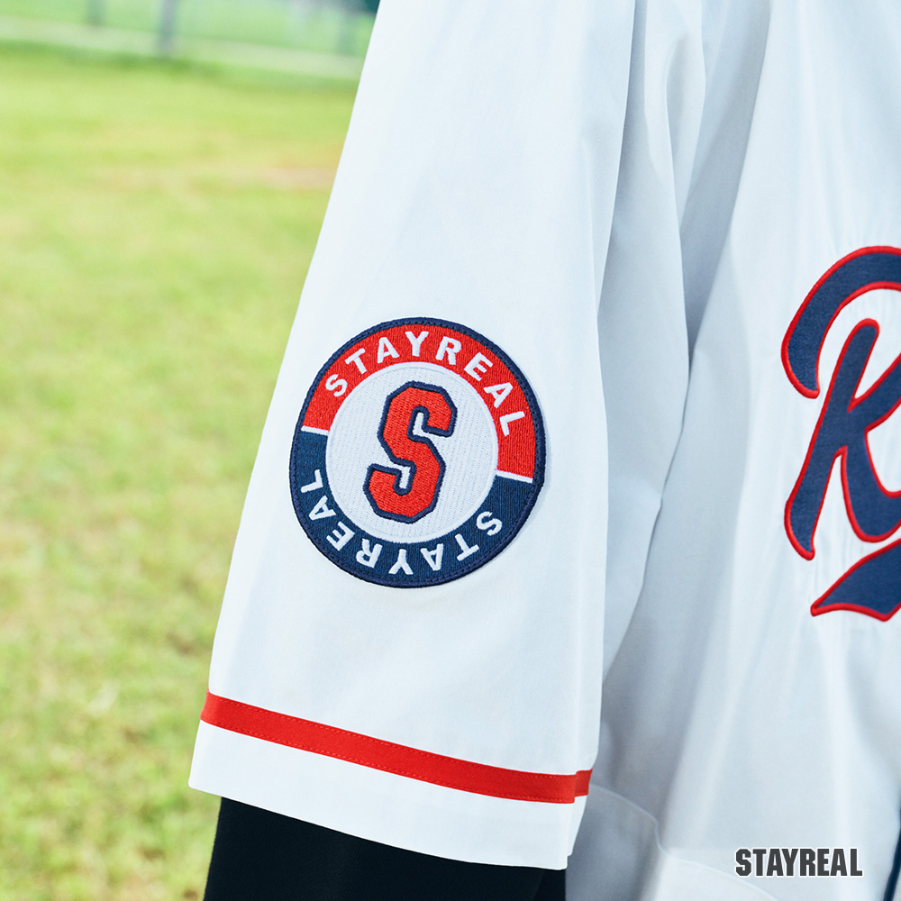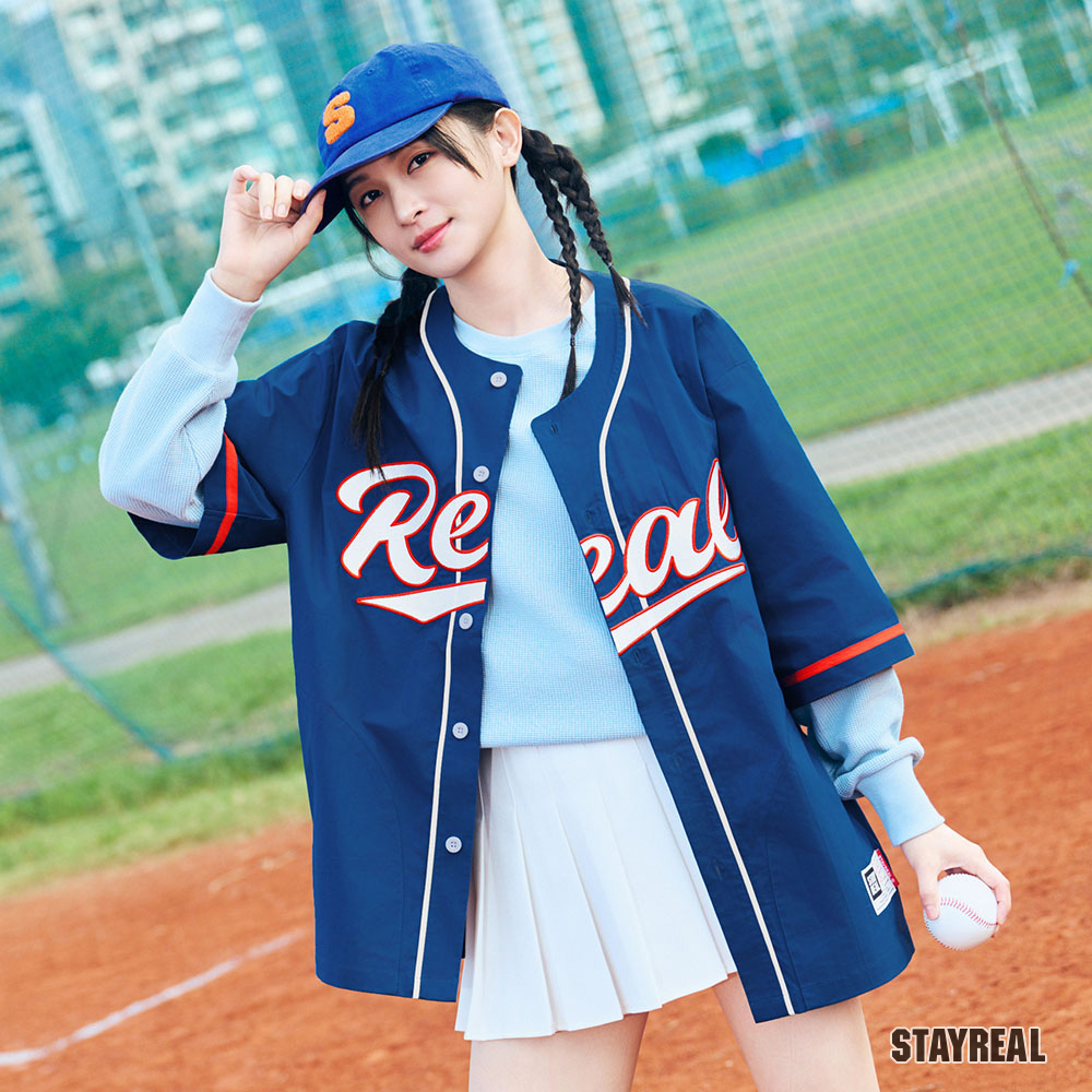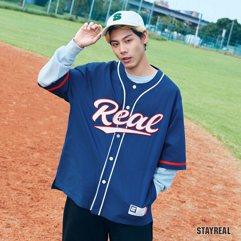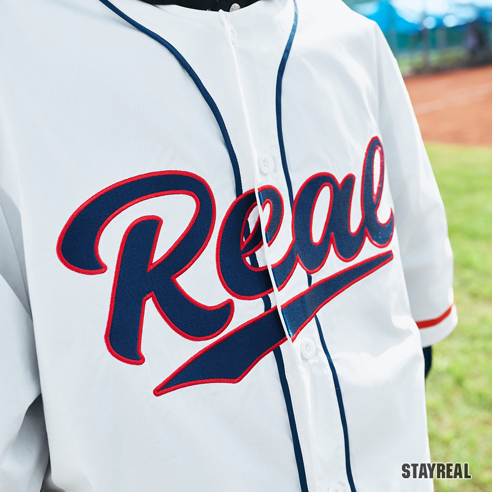 正面胸前REAL電繡,呼應棒球文化專屬的球隊識別感,手臂上品牌識別布章以及下擺處品牌織標與夾標,強化品牌標誌