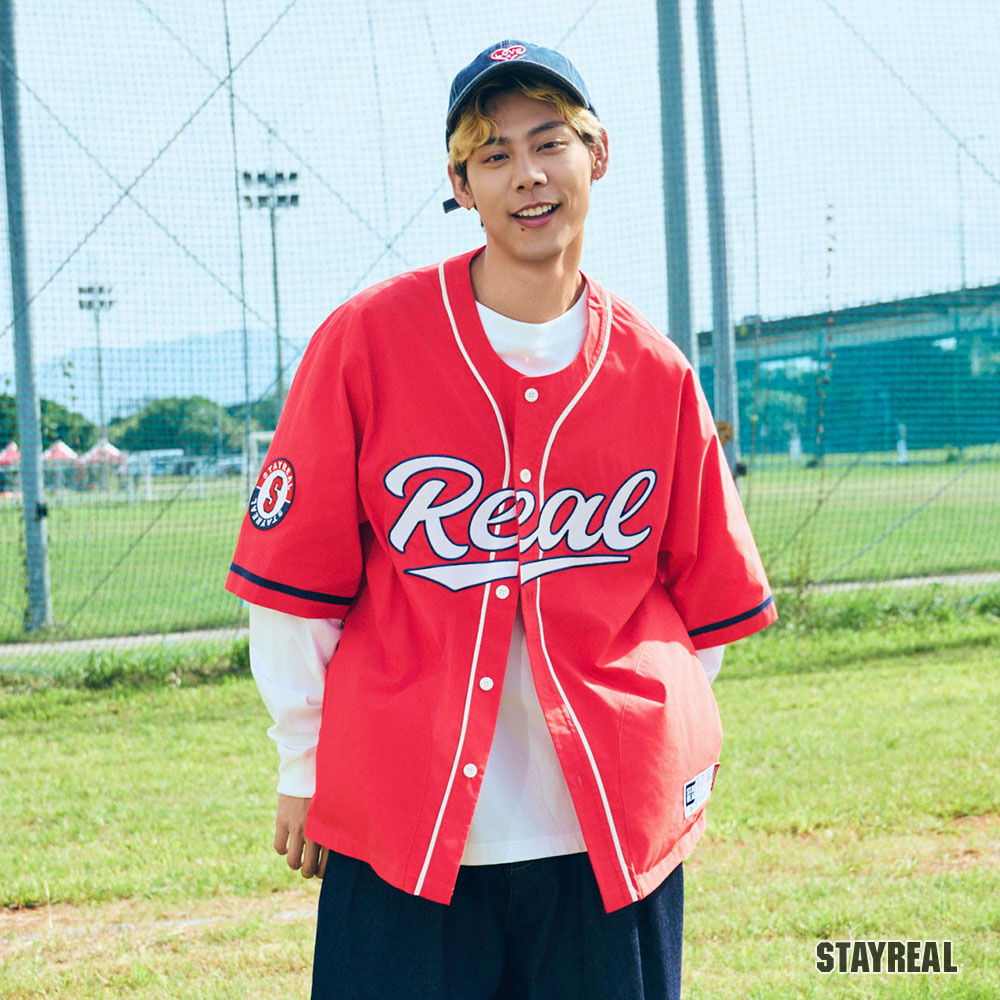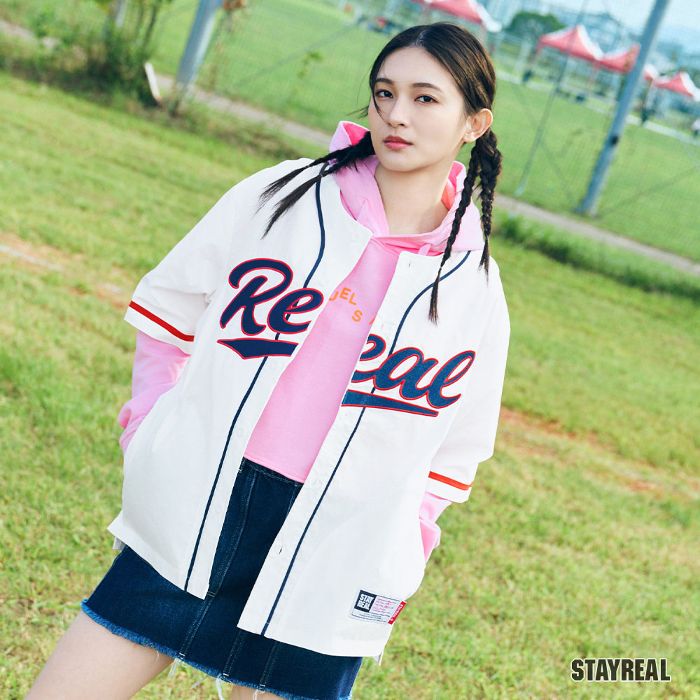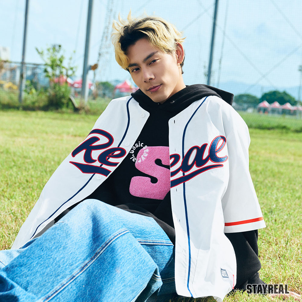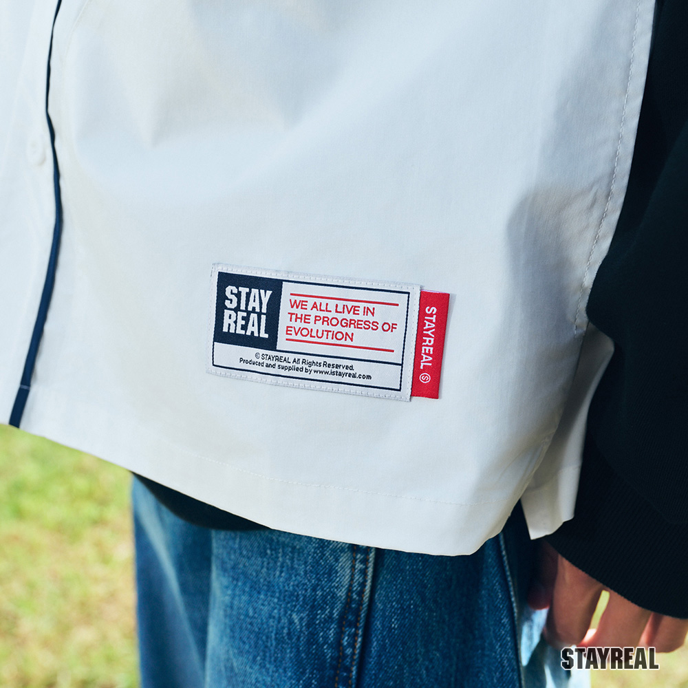 正面胸前REAL電繡,呼應棒球文化專屬的球隊識別感,手臂上品牌識別布章以及下擺處品牌織標與夾標,強化品牌標誌