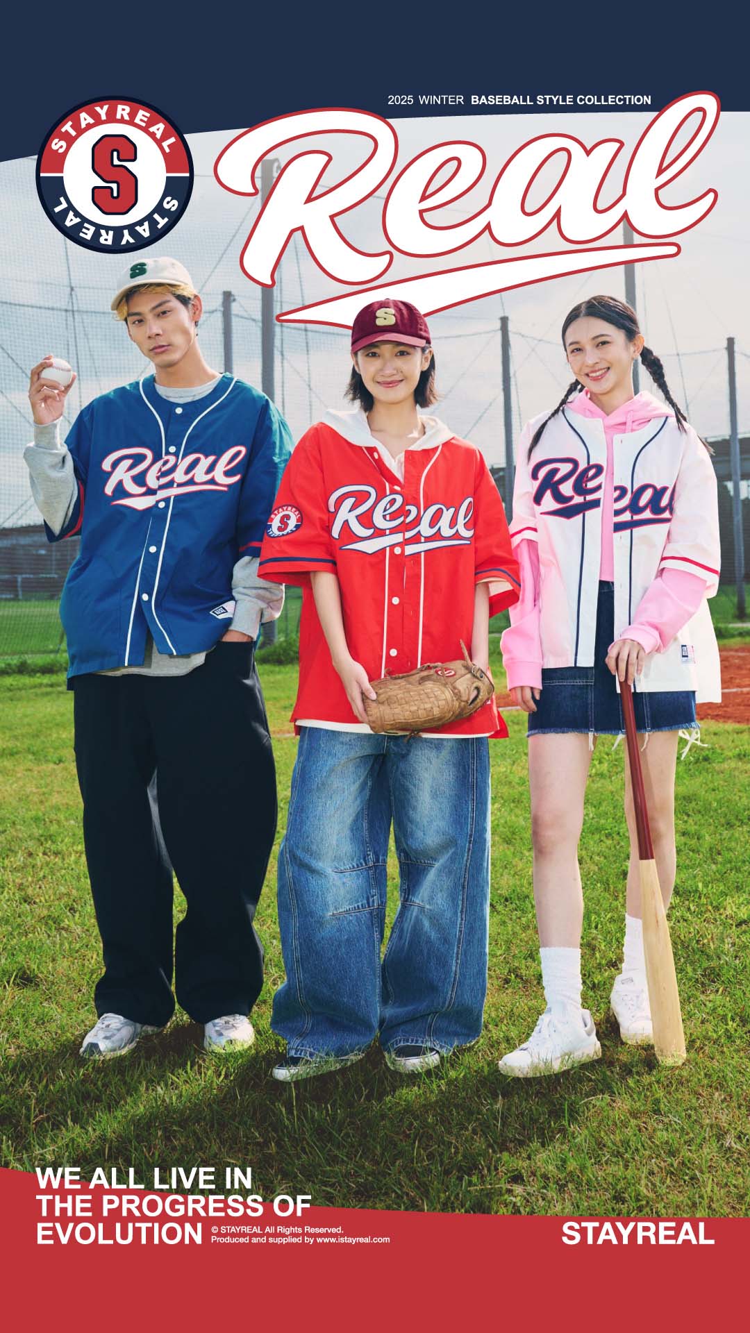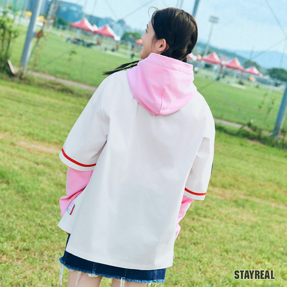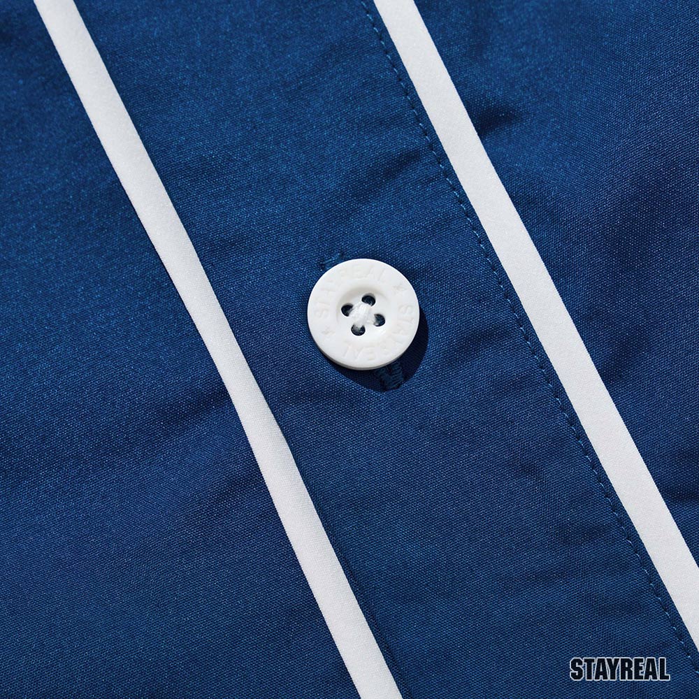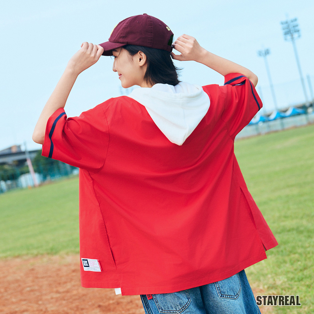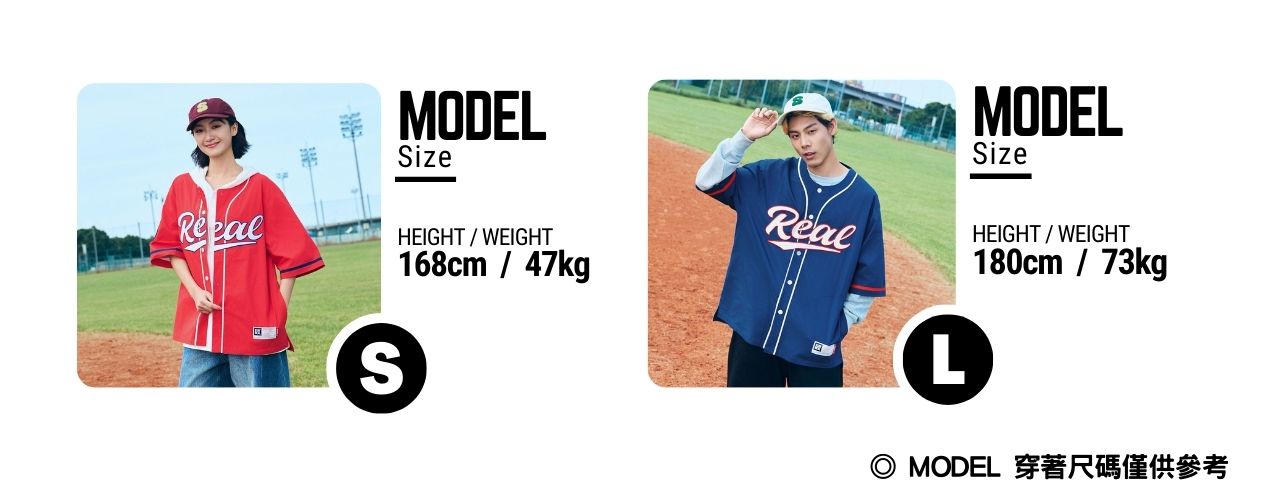 正面胸前REAL電繡,呼應棒球文化專屬的球隊識別感,手臂上品牌識別布章以及下擺處品牌織標與夾標,強化品牌標誌