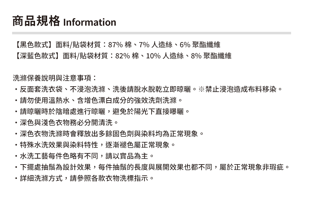 黑色款式:採用黑灰水劑工藝染色,由於染色的獨特性,使得面料在水洗工藝上能呈現多重牛仔成衣藝術效果