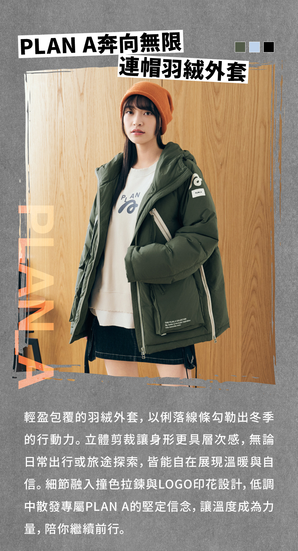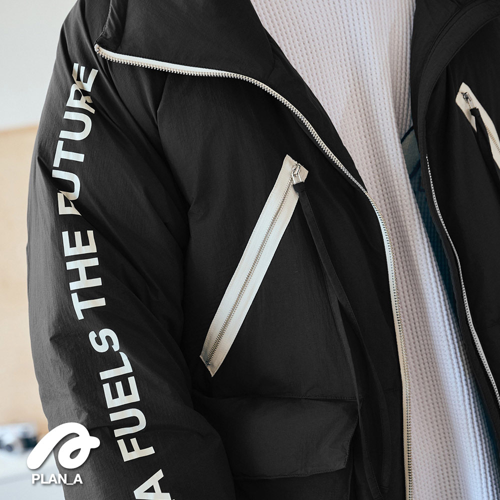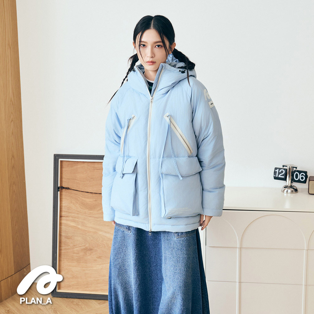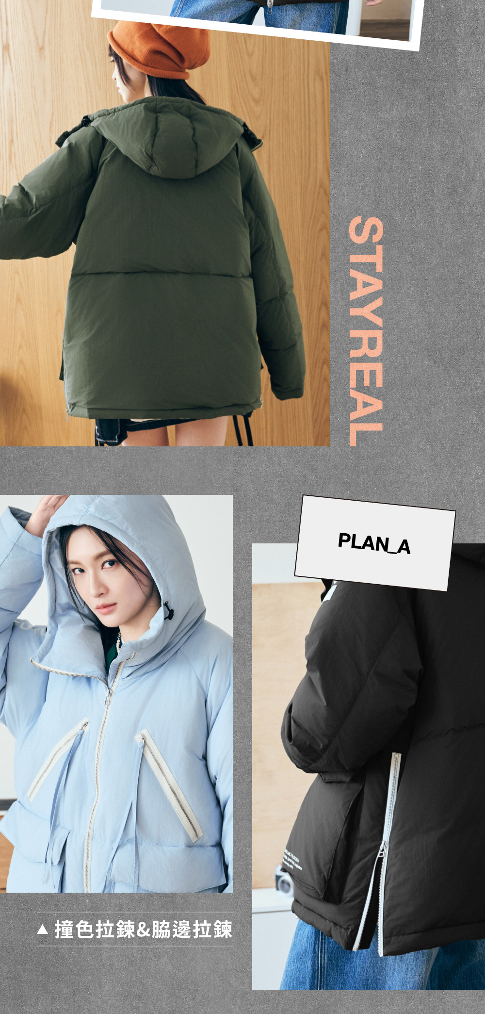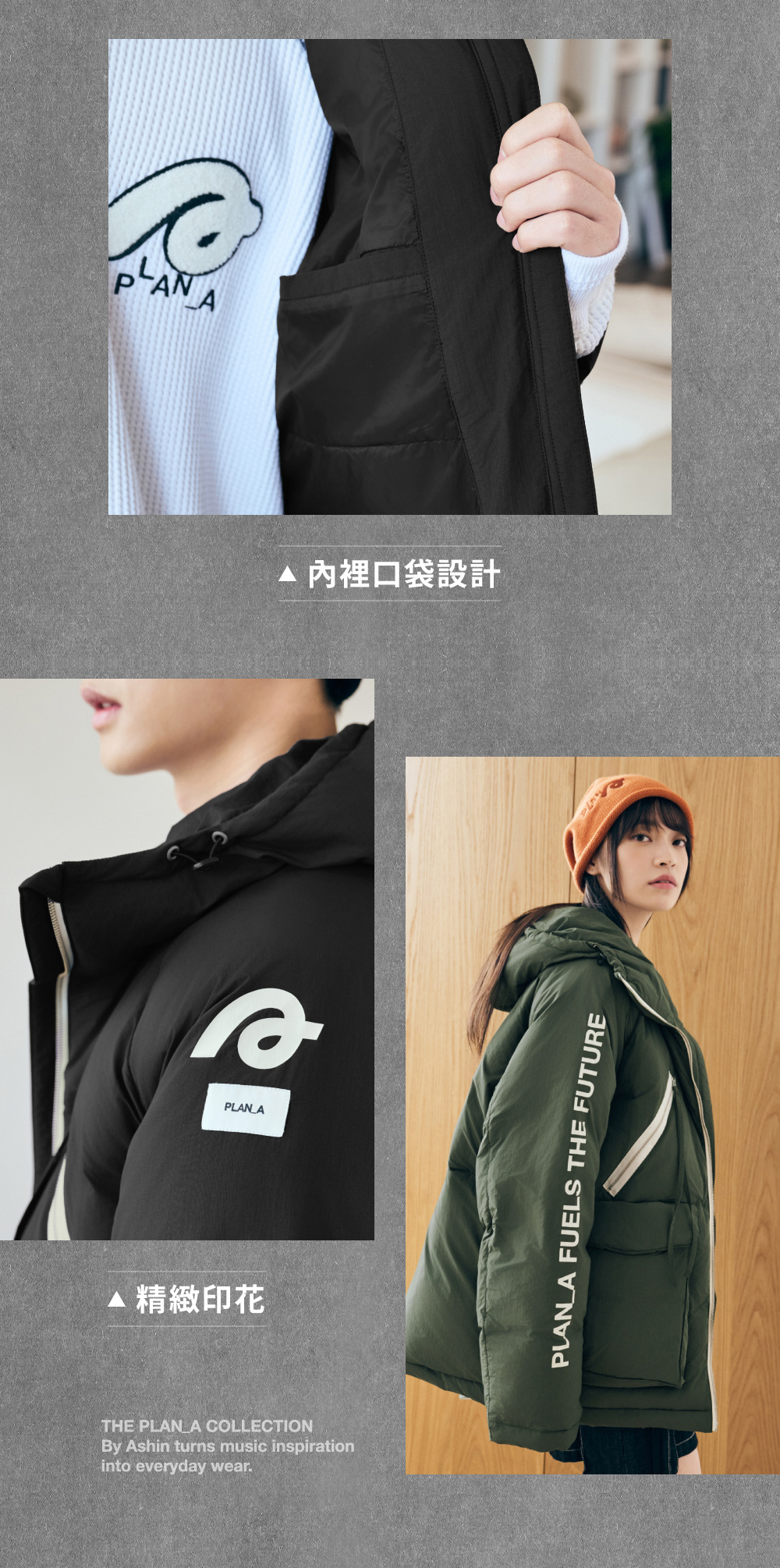 正面兩個拉鍊袋與兩個袋蓋式插口袋,增加實用與安全性,內口袋可放置重要物品,帽沿處配置彈性繩與調節釦,增添保暖性與抗風性,門襟與兩側脇邊採用撞色拉鍊設計,讓整體設計更活潑