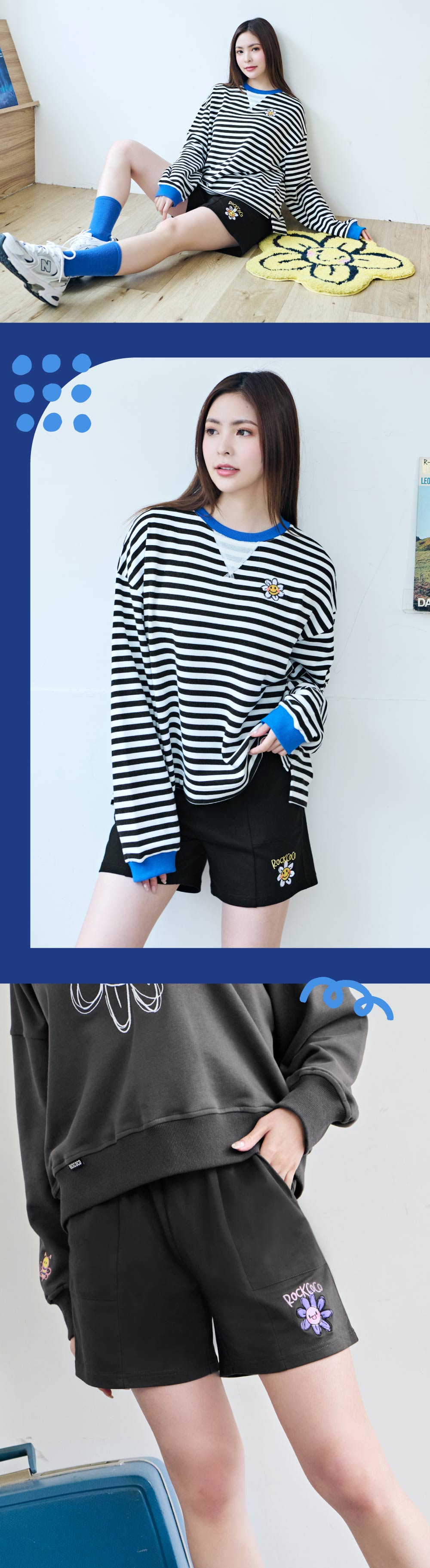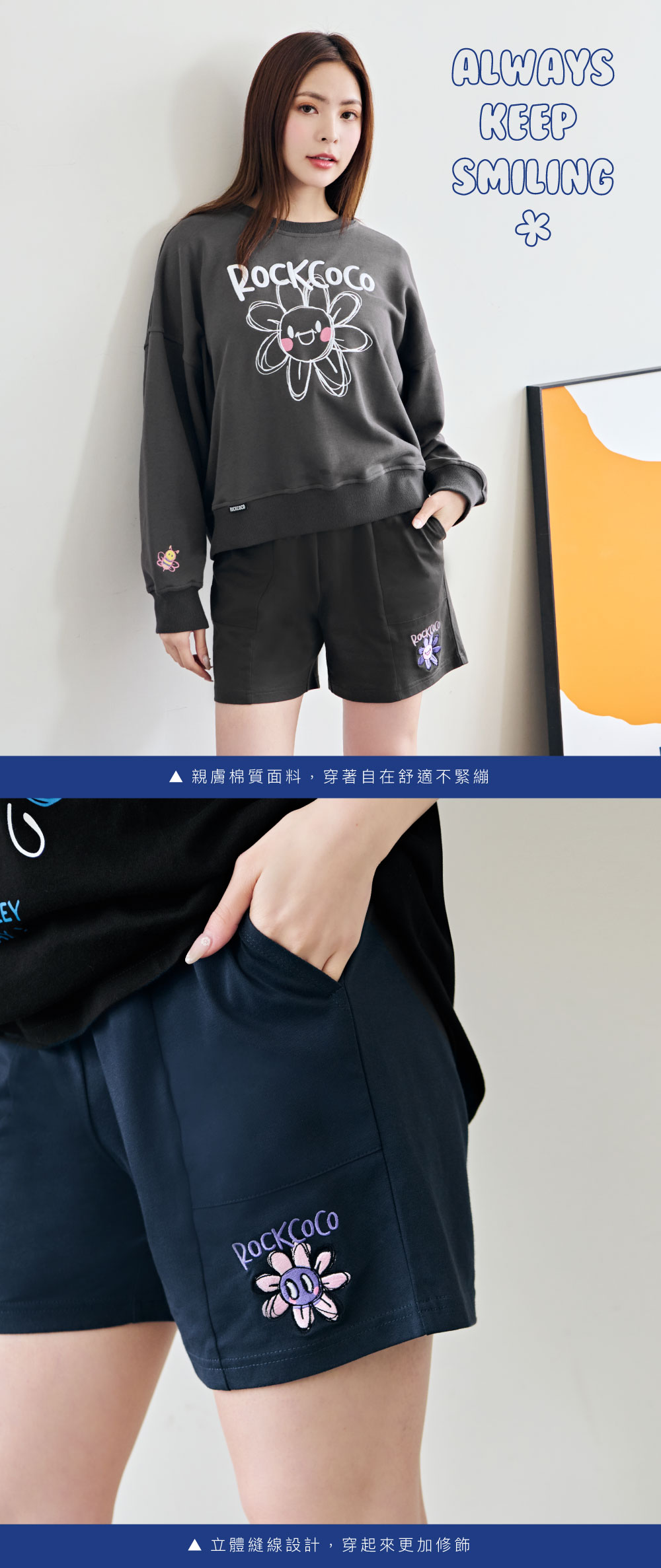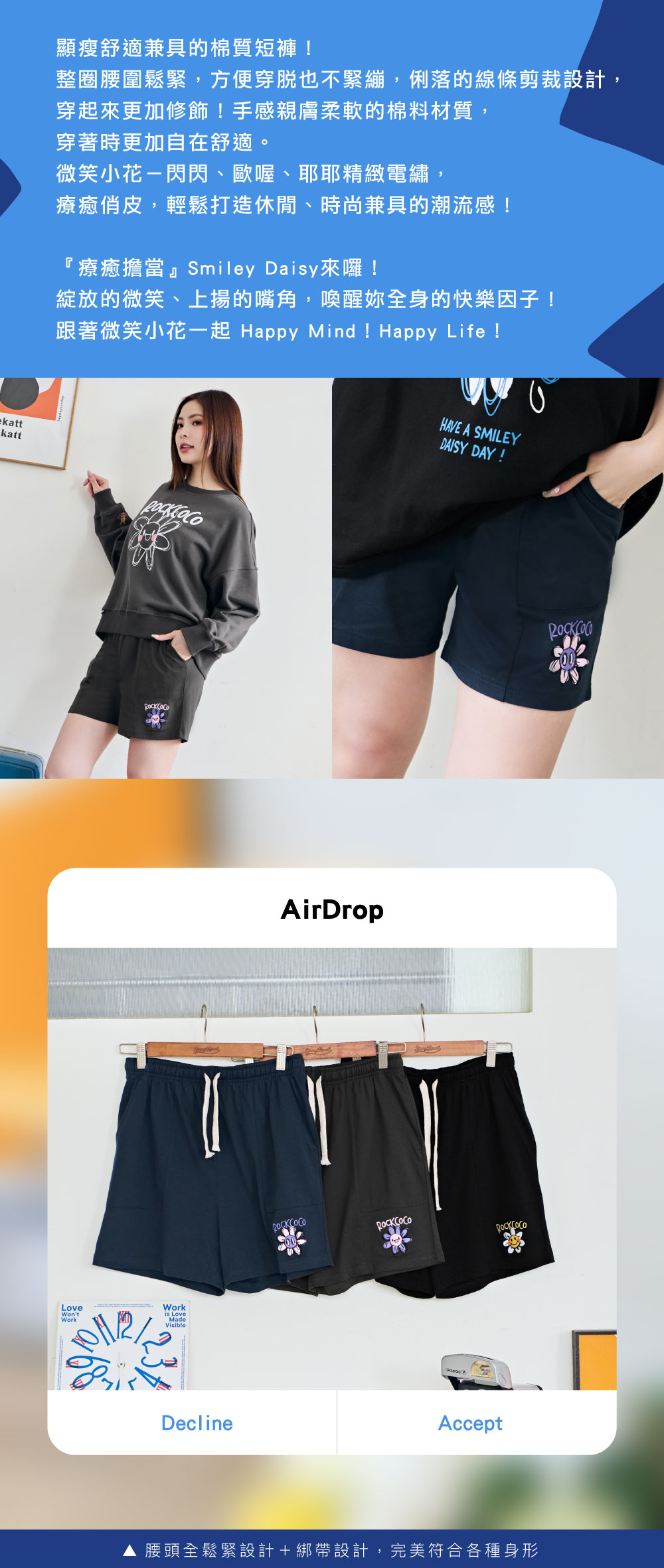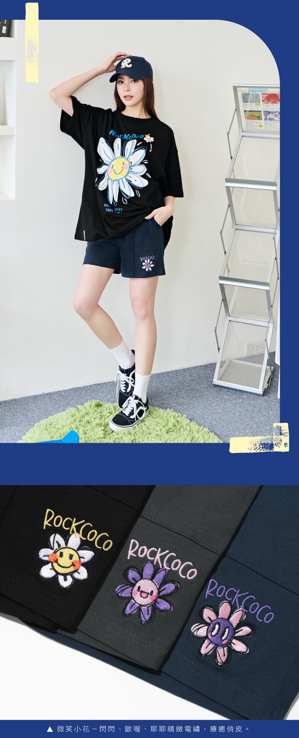 整圈腰圍鬆緊,方便穿脫也不緊繃,俐落的線條剪裁設計,穿起來更加修飾!手感親膚柔軟的棉料材質,穿著時更加自在舒適。微笑小花-閃閃、歐喔、耶耶精緻電繡,療癒俏皮,輕鬆打造休閒、時尚兼具的潮流感