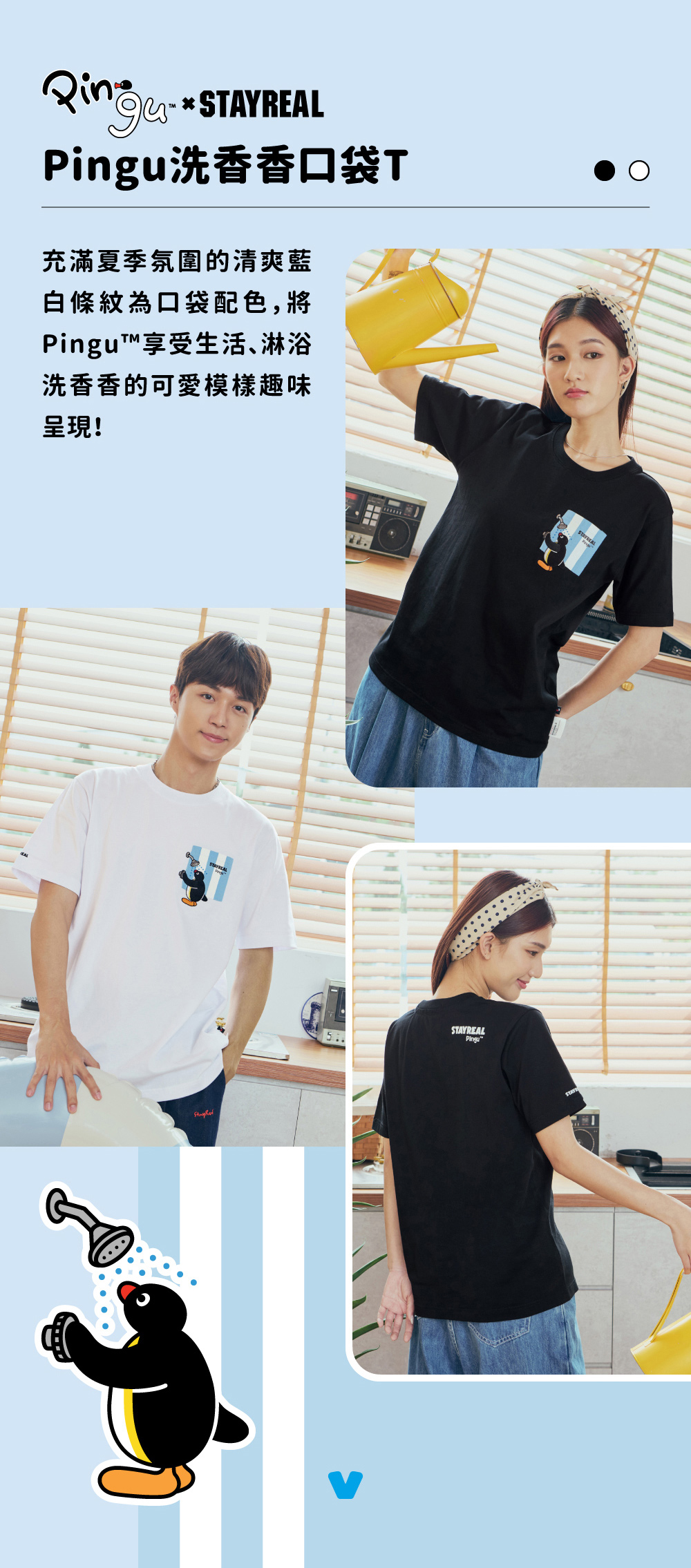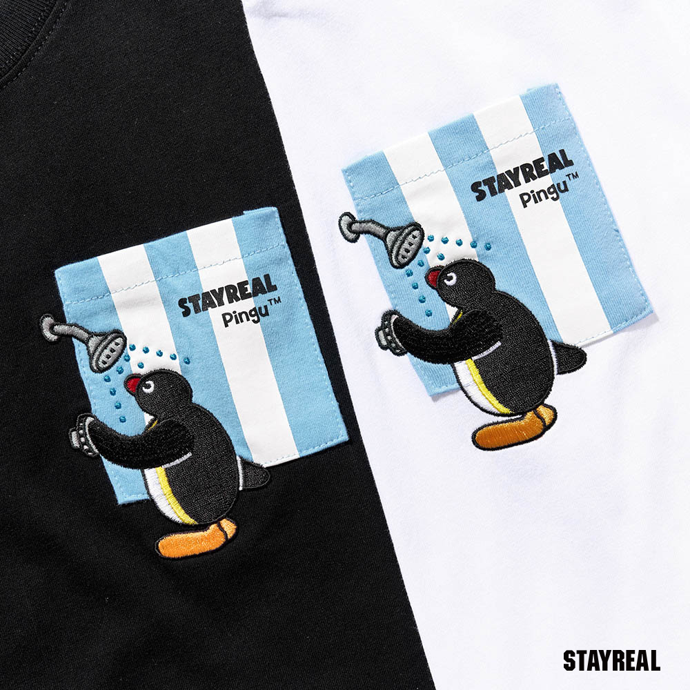 STAYREAL最拿手的設計,就是把簡單圖像設計得充滿趣味!以夏季清爽視覺感的藍白條紋的口袋配色,把Pingu享受生活、洗香香的淋浴模樣,趣味呈現出!